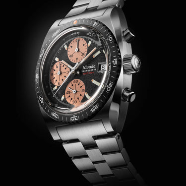 Nivada Grenchen presents the Chronosport collection, featuring two meticulously crafted timepieces that blend vintage charm with modern sophistication. Inspired by the 1970s, these 38mm watches are a rare find, originally limited to just 10 pieces. The standout feature is the unique dial, designed by legendary Swiss dial maker Jean Singer. The textured matte black face, taupe-to-khaki counters, and tachymeter scale create a visually striking and functional design. The baton indexes and hands, coated with Superluminova, enhance readability and elegance. This collection is equipped with a tachymeter scale, allowing for precise speed measurement, making it ideal for enthusiasts. The thickly printed logo and Paul Newman art deco typography add depth and character. Perfect for collectors and those seeking a blend of history and innovation, the Chronosport collection by Nivada Grenchen is a testament to exceptional watchmaking heritage.