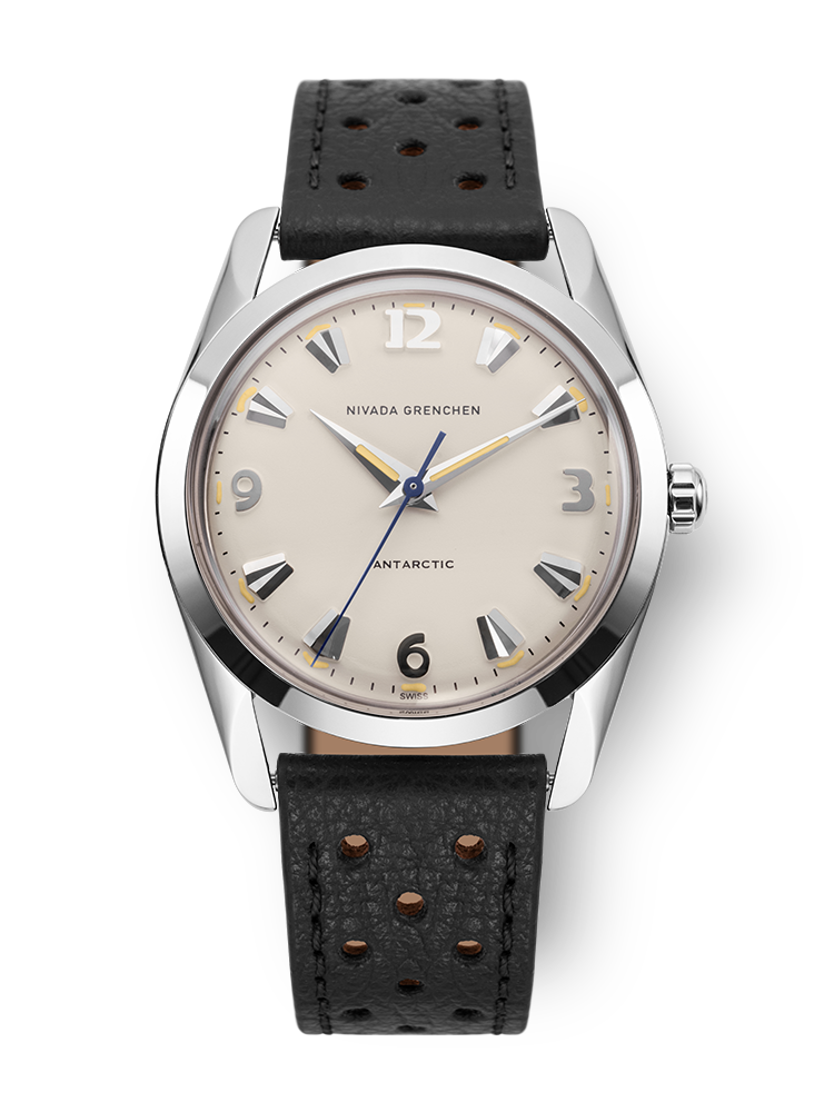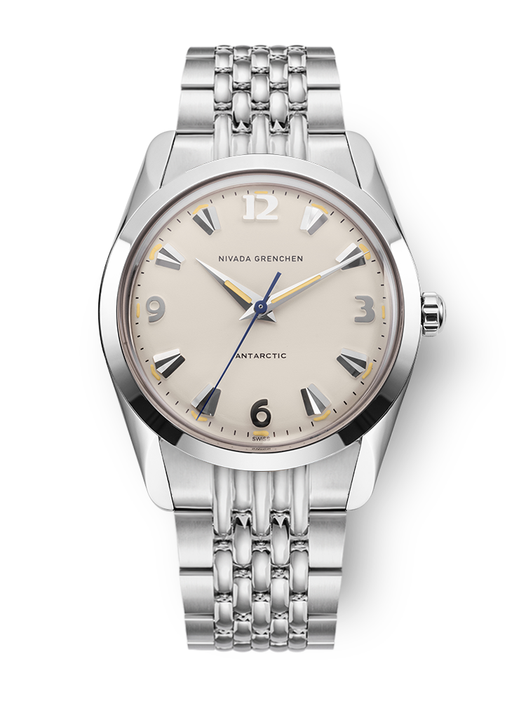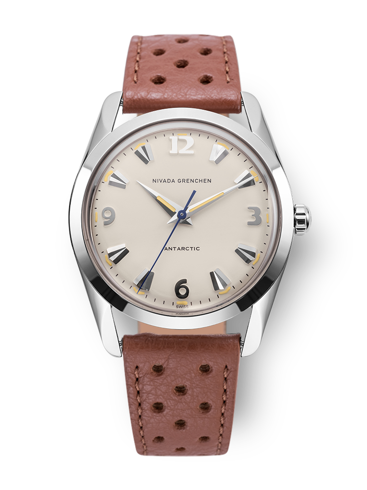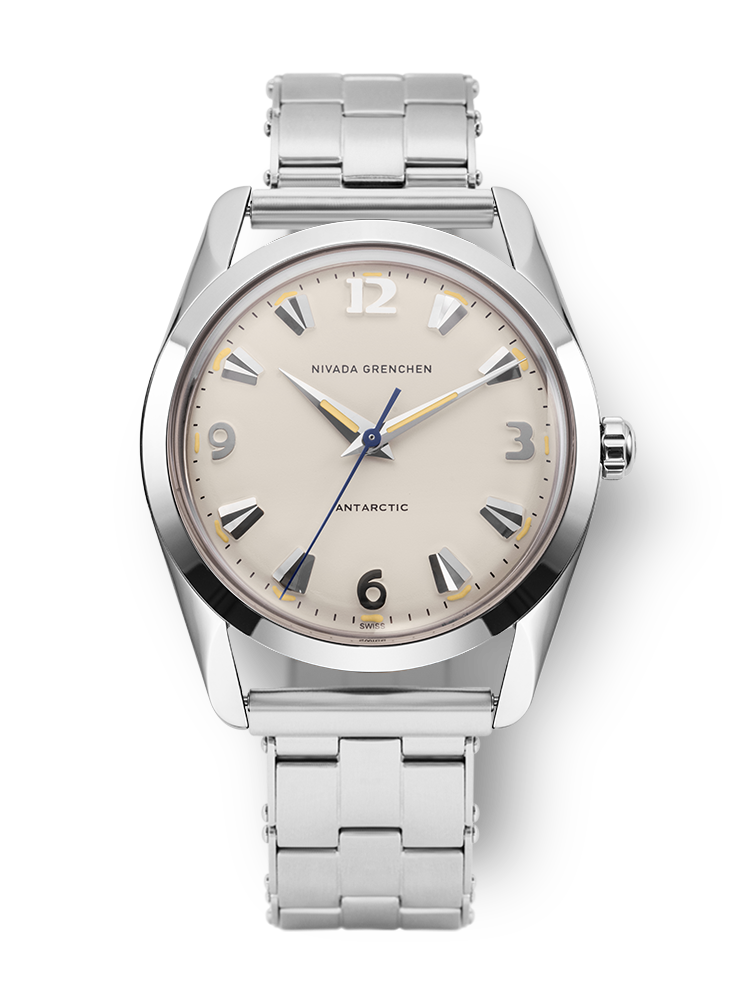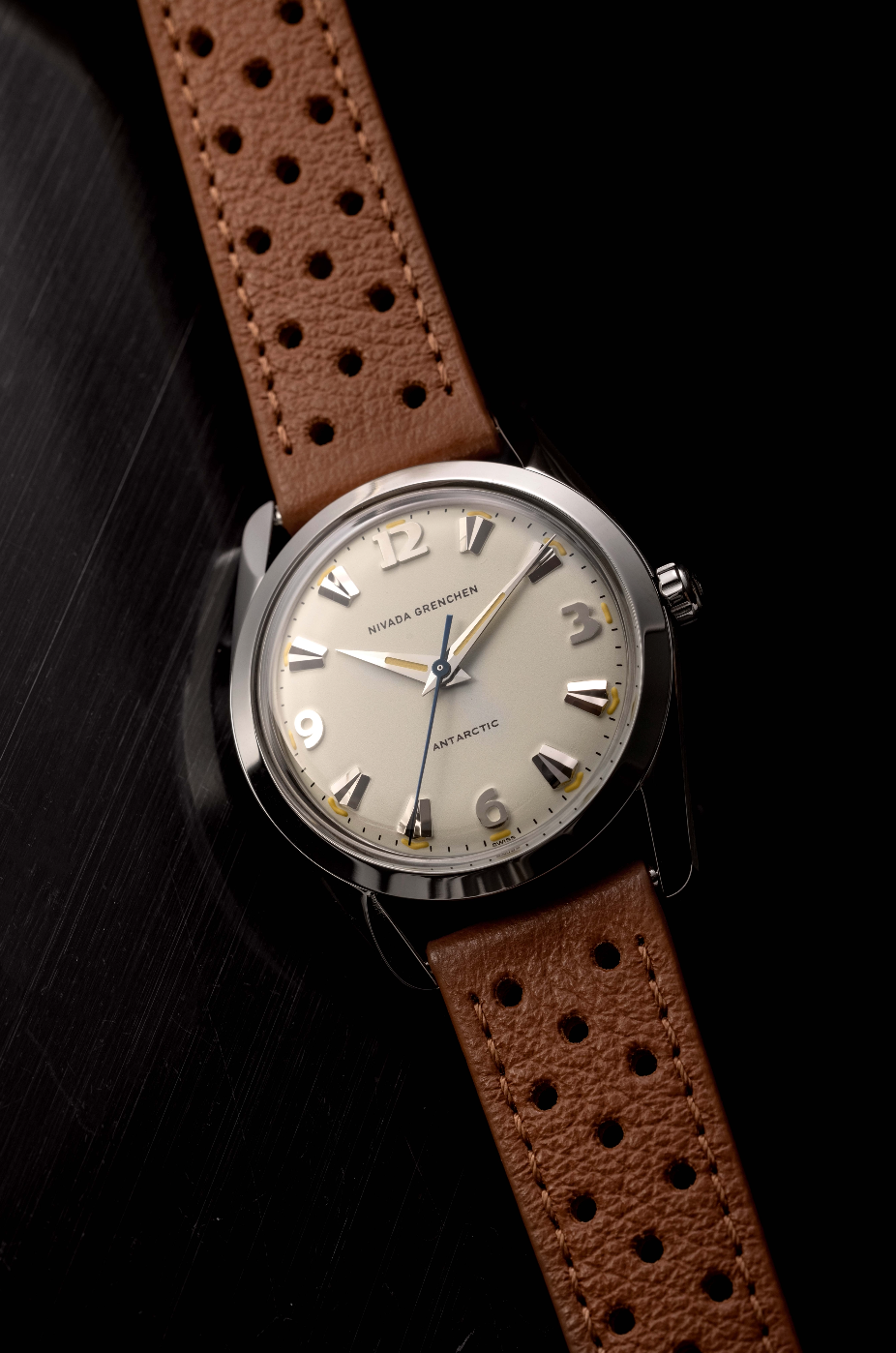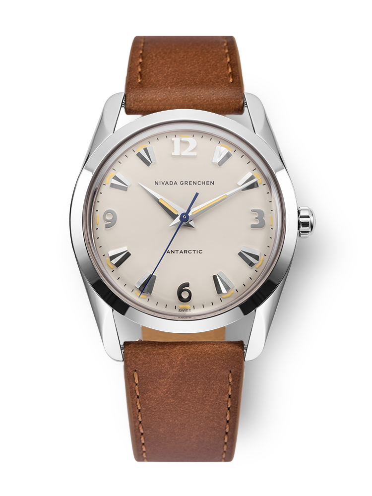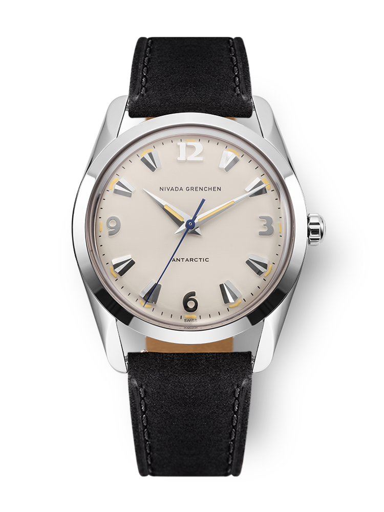The dial proudly bears the ‘Nivada Grenchen’ signature below the 12, with «Antarctic» just above the 6. Beneath it, hugging the outer edge of the minute track, a discreet ‘Swiss’. The steel hands are of the classic dauphine style, with a slim luminescent band at their center. The elongated second hand, crafted in blued steel, adds an extra touch of elegance.