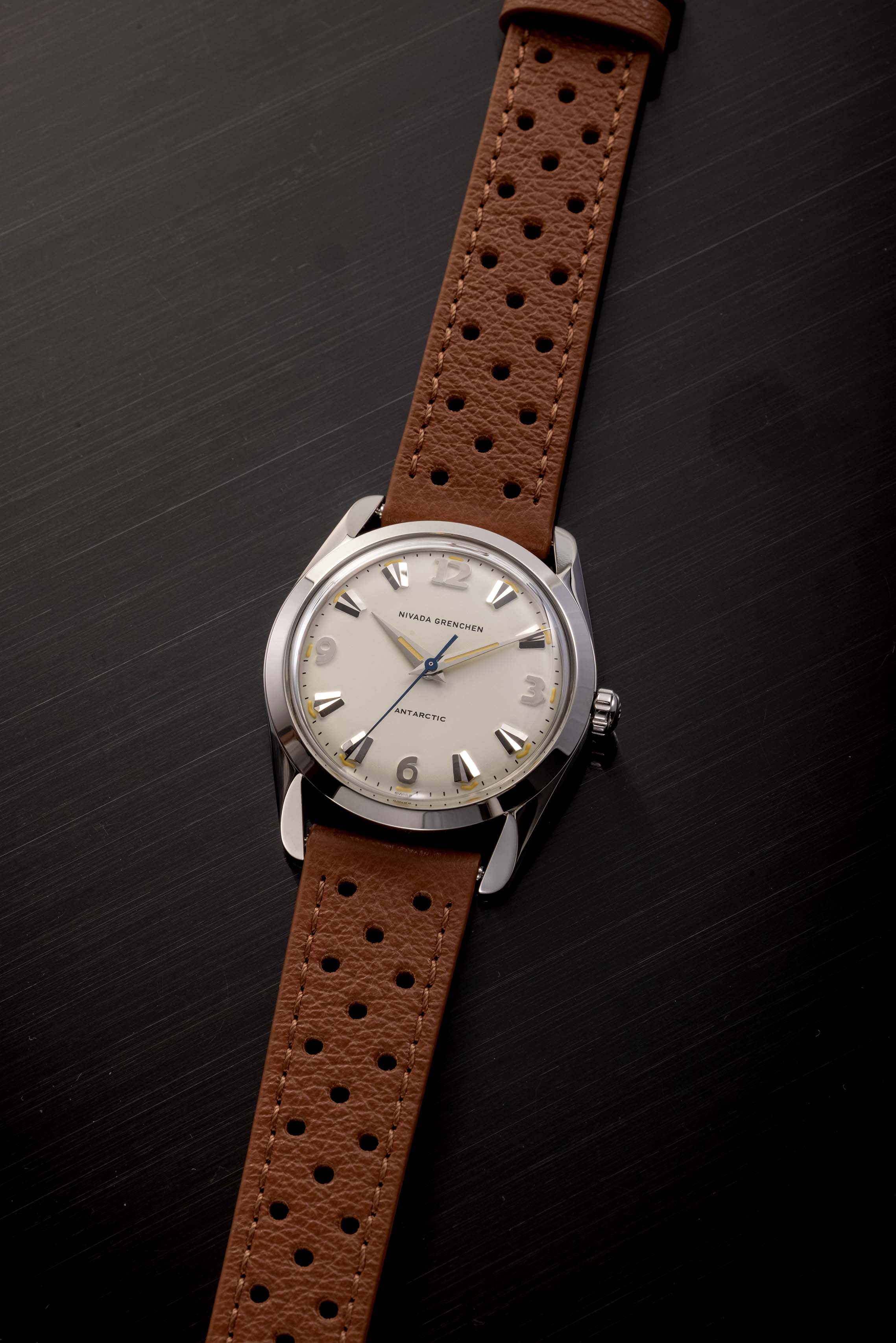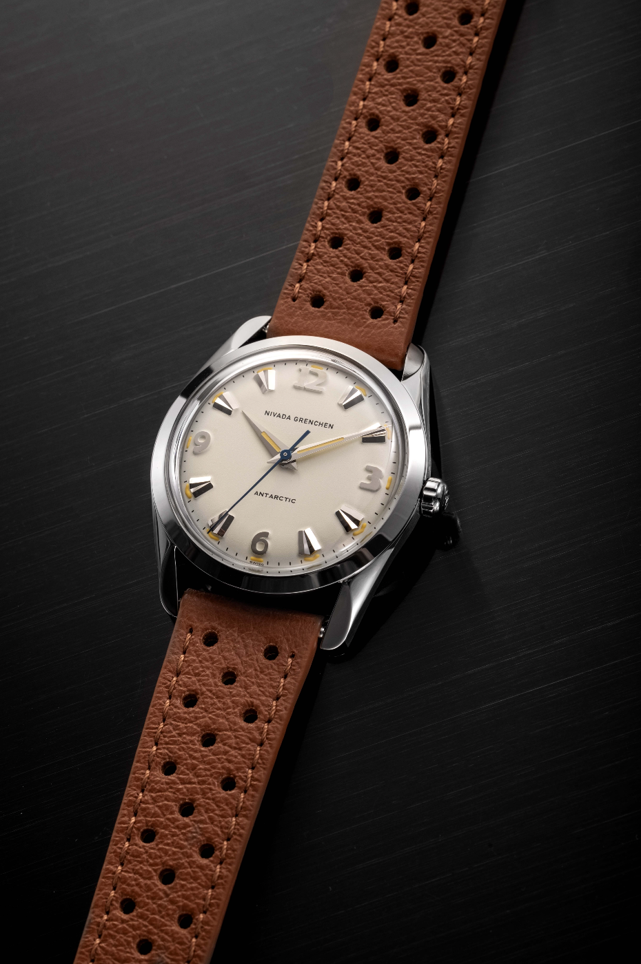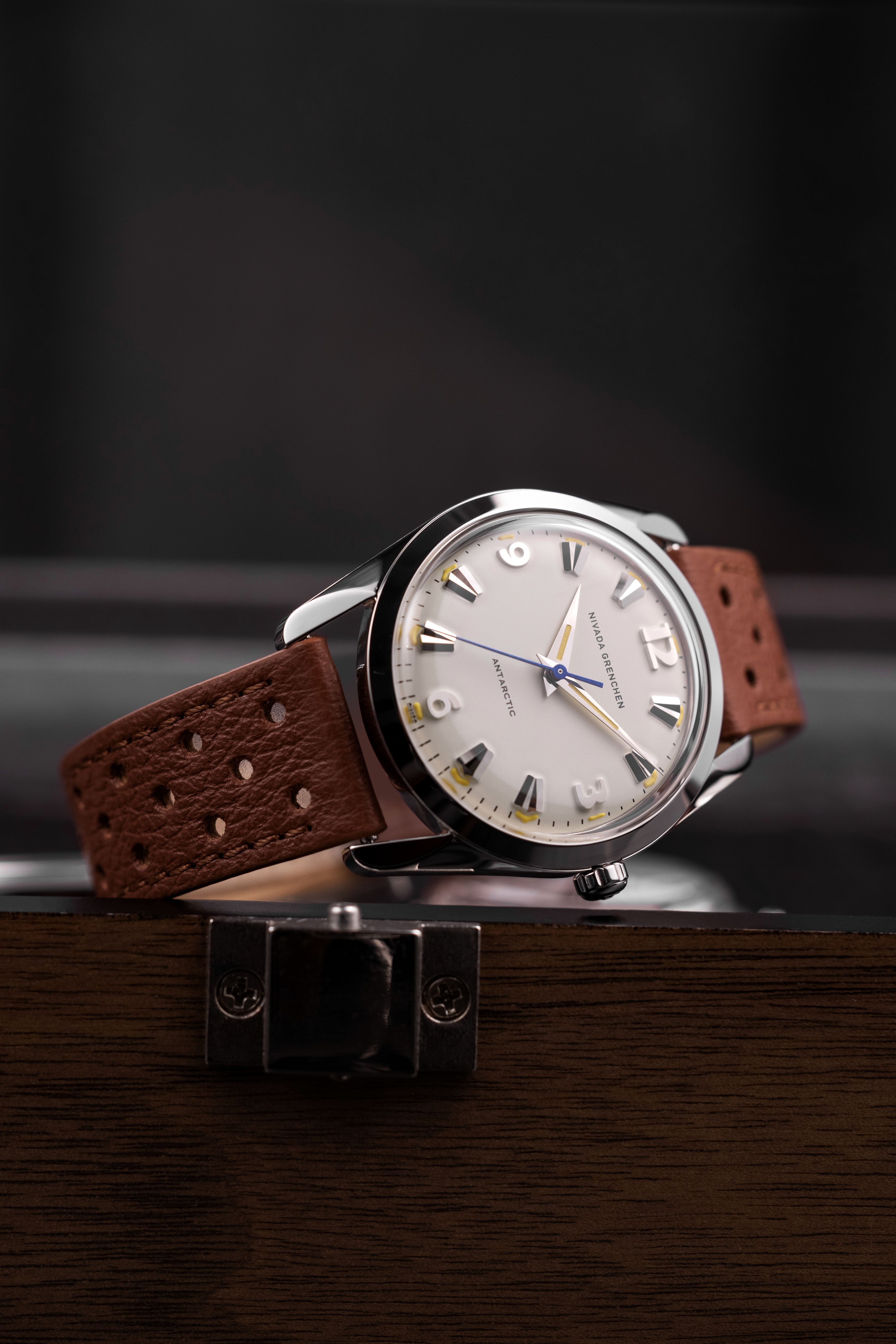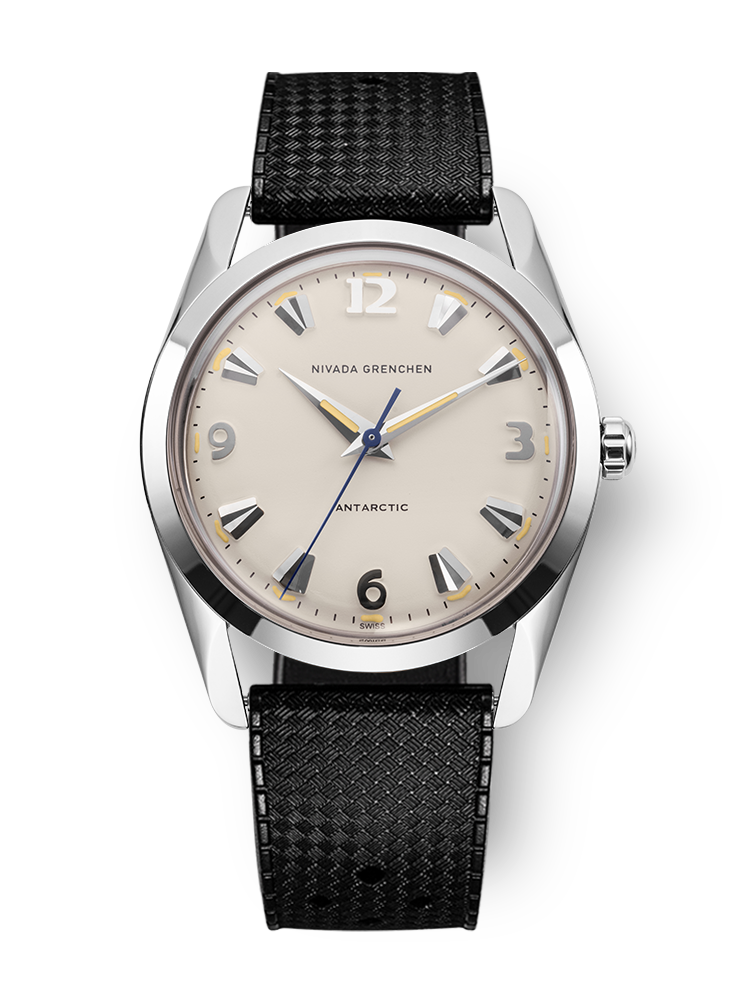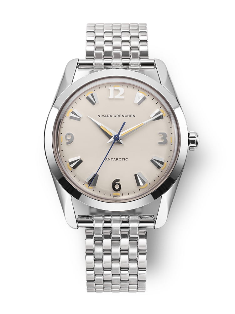 The dial proudly bears the ‘Nivada Grenchen’ signature below the 12, with «Antarctic» just above the 6. Beneath it, hugging the outer edge of the minute track, a discreet ‘Swiss’. The steel hands are of the classic dauphine style, with a slim luminescent band at their center. The elongated second hand, crafted in blued steel, adds an extra touch of elegance.