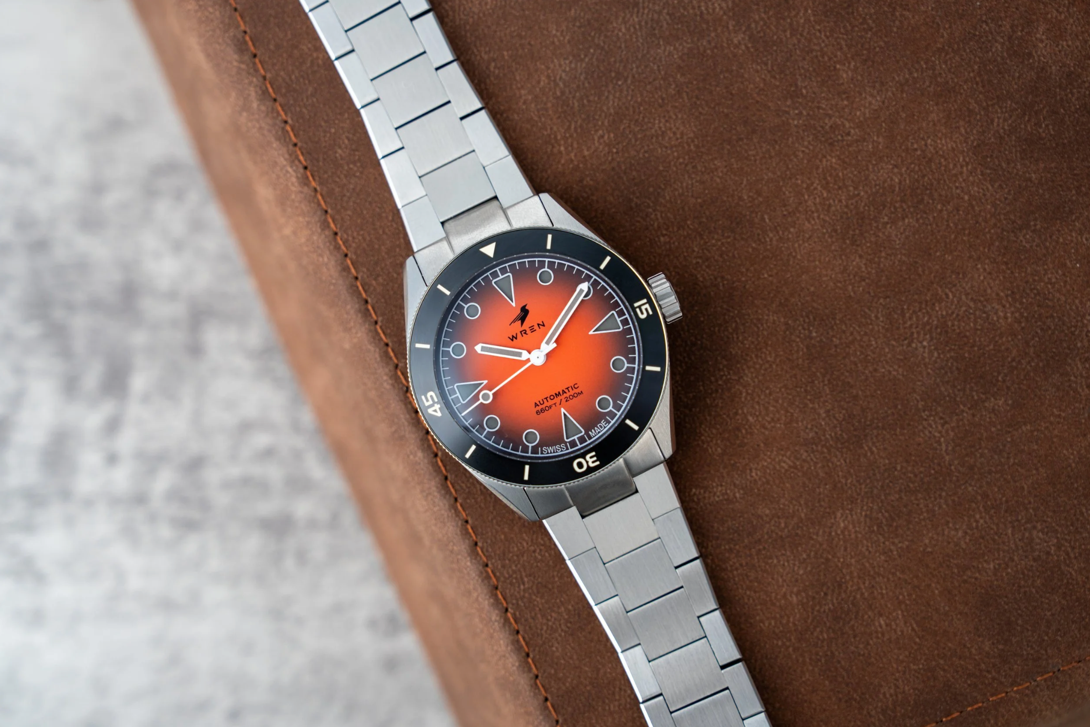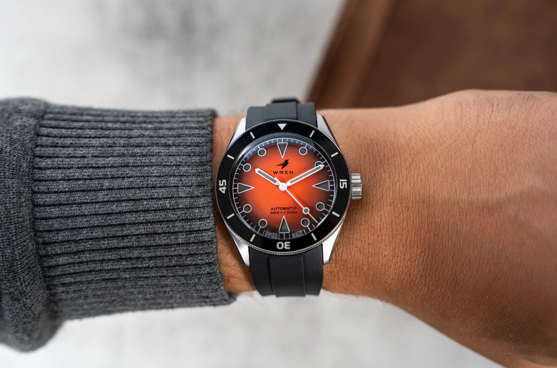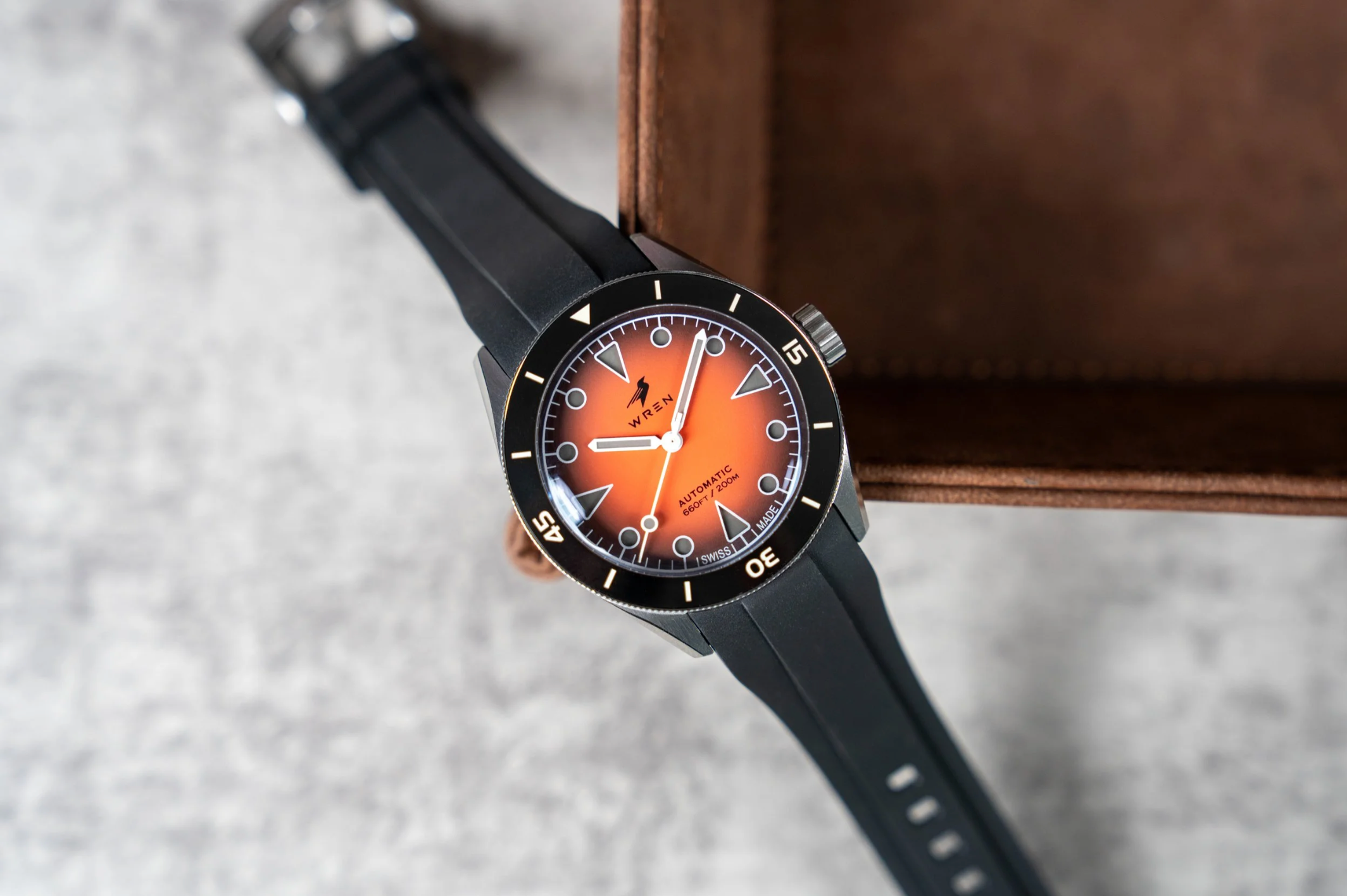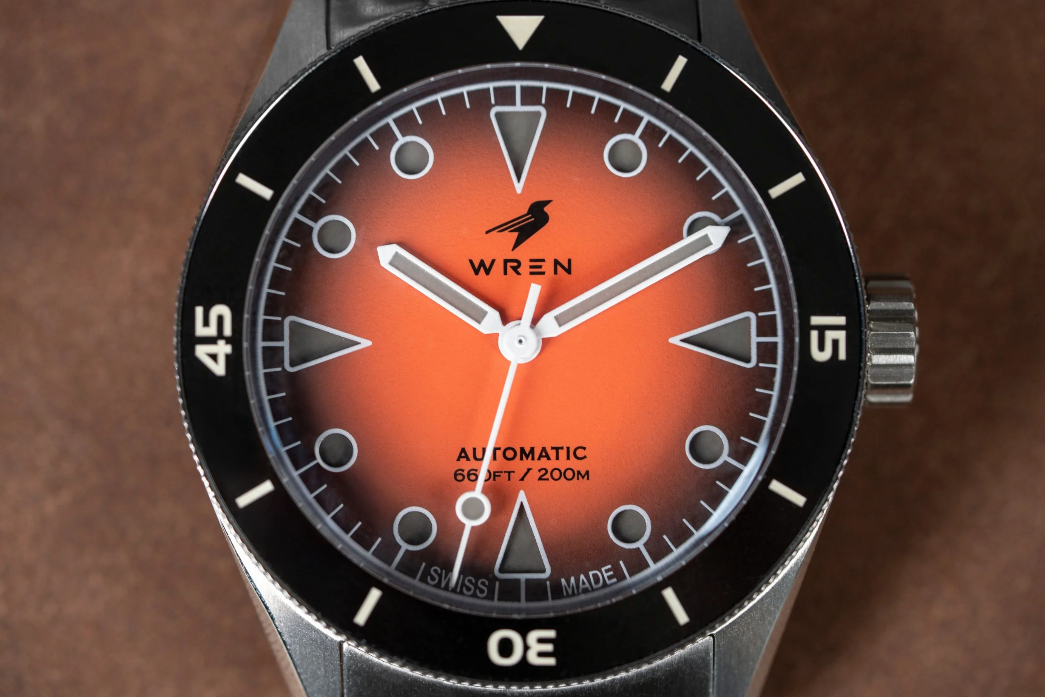 The Diver One Magma is Wrens's first collaboration and most distinctive release to date. Designed in partnership with Ben of @benswatches, the Magma introduces a fiery orange-to-black gradient dial, dark grey lume, and—for the first time in the Diver One series—a ceramic bezel. Combined with white-outlined markers and hands for contrast and legibility, this Swiss made Diver One balances visual heat with functional clarity.