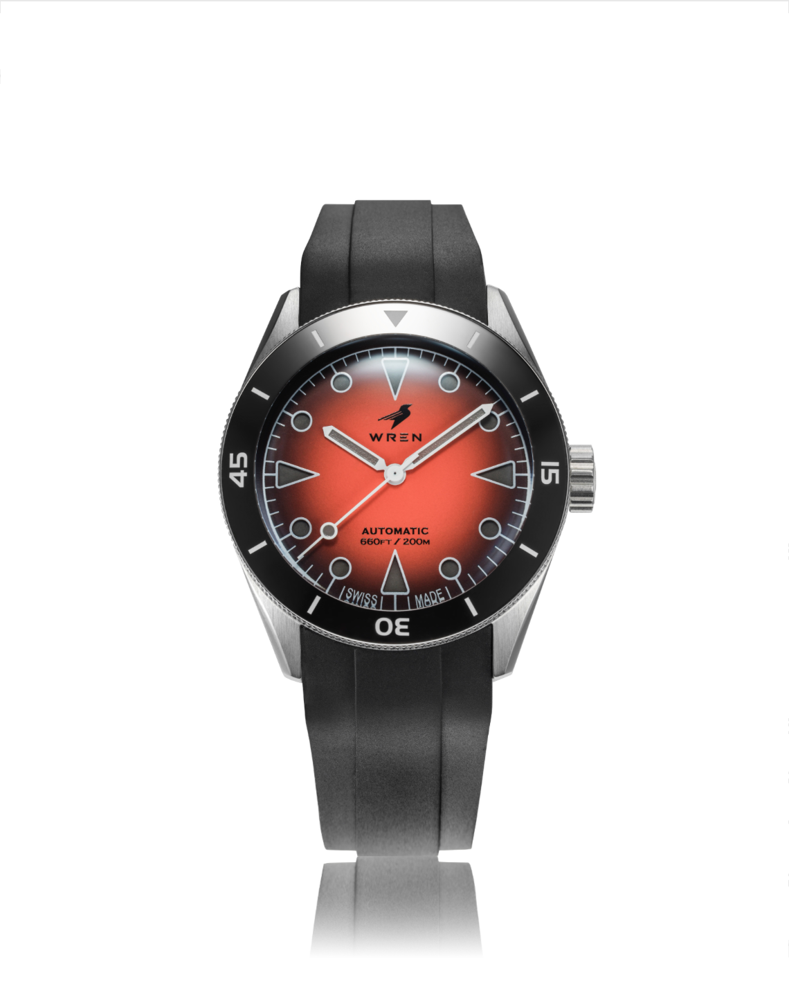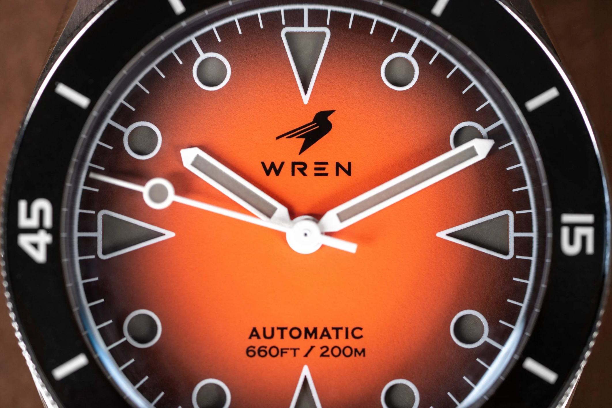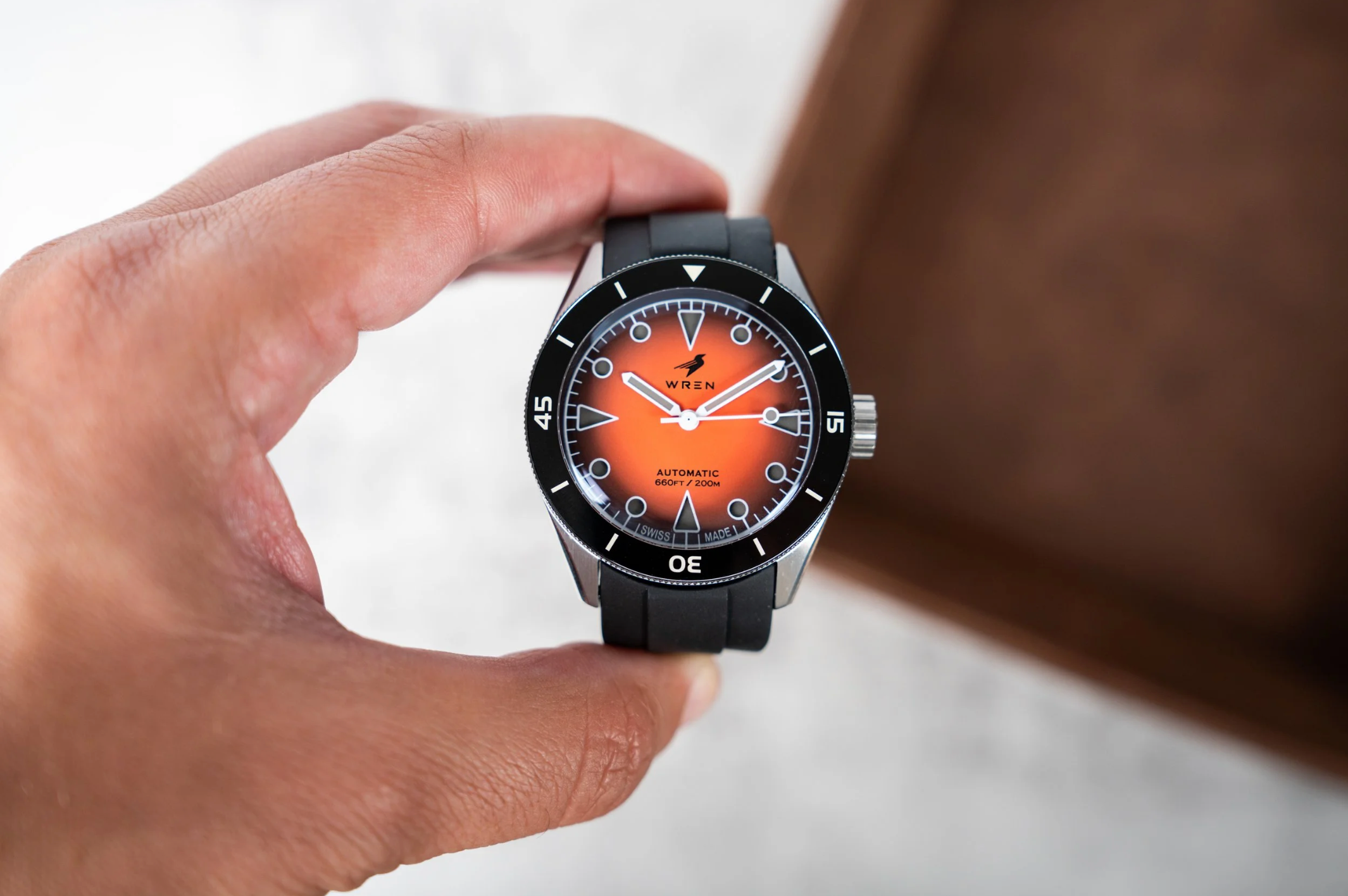 The Diver One Magma is Wrens's first collaboration and most distinctive release to date. Designed in partnership with Ben of @benswatches, the Magma introduces a fiery orange-to-black gradient dial, dark grey lume, and—for the first time in the Diver One series—a ceramic bezel. Combined with white-outlined markers and hands for contrast and legibility, this Swiss made Diver One balances visual heat with functional clarity.