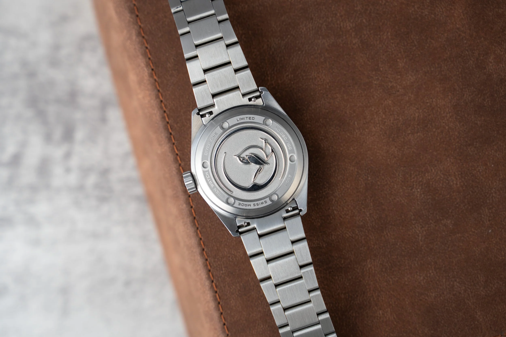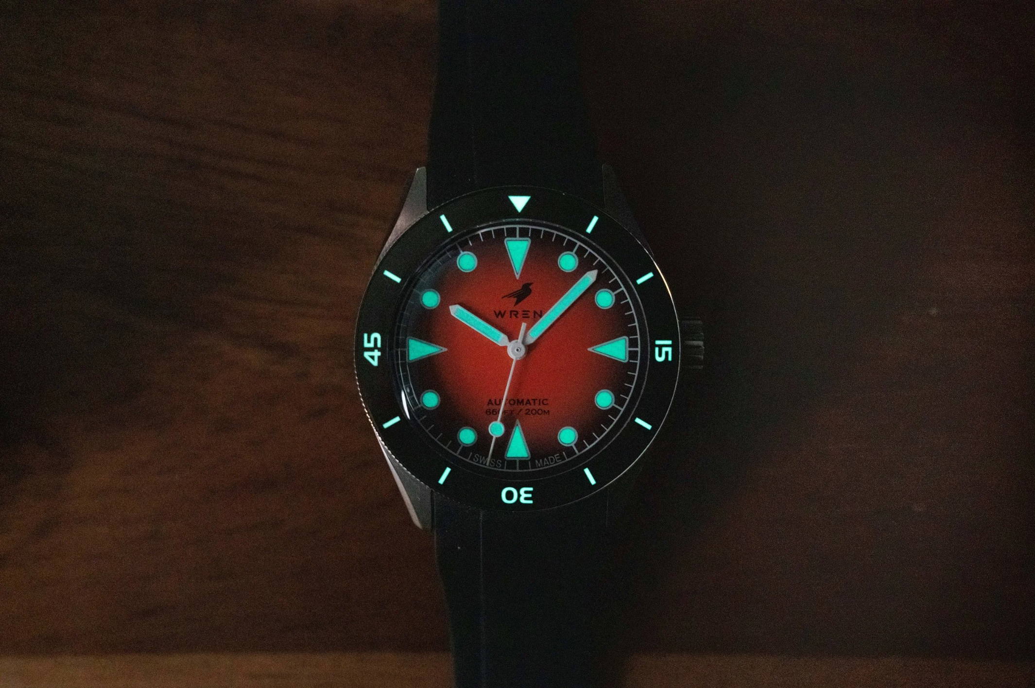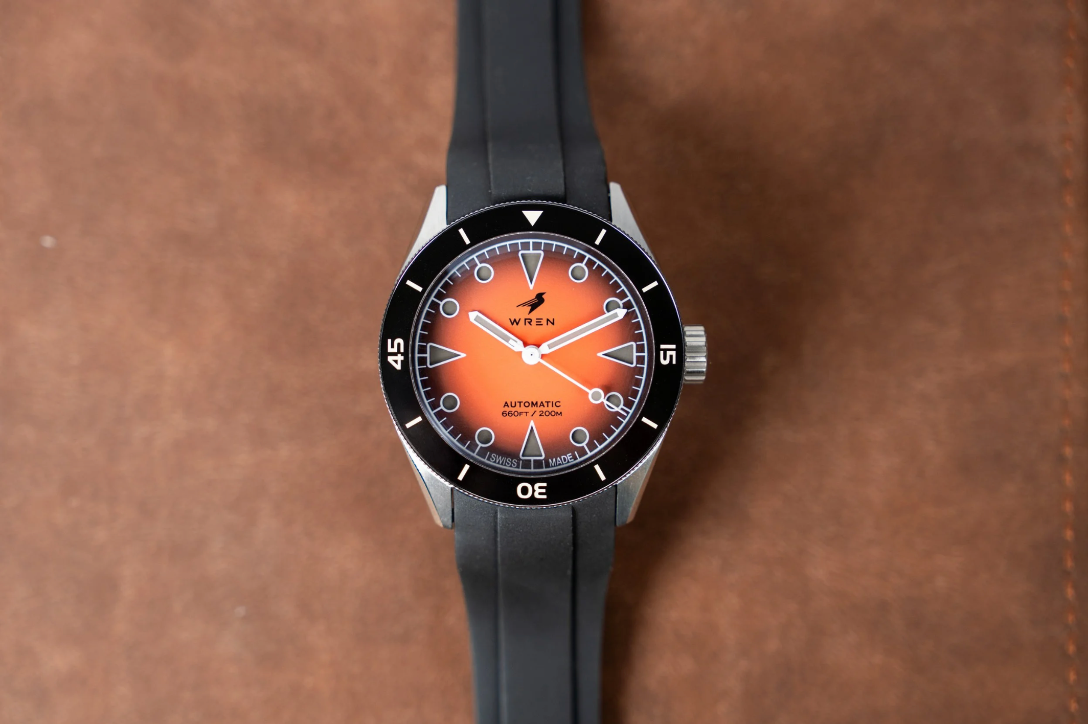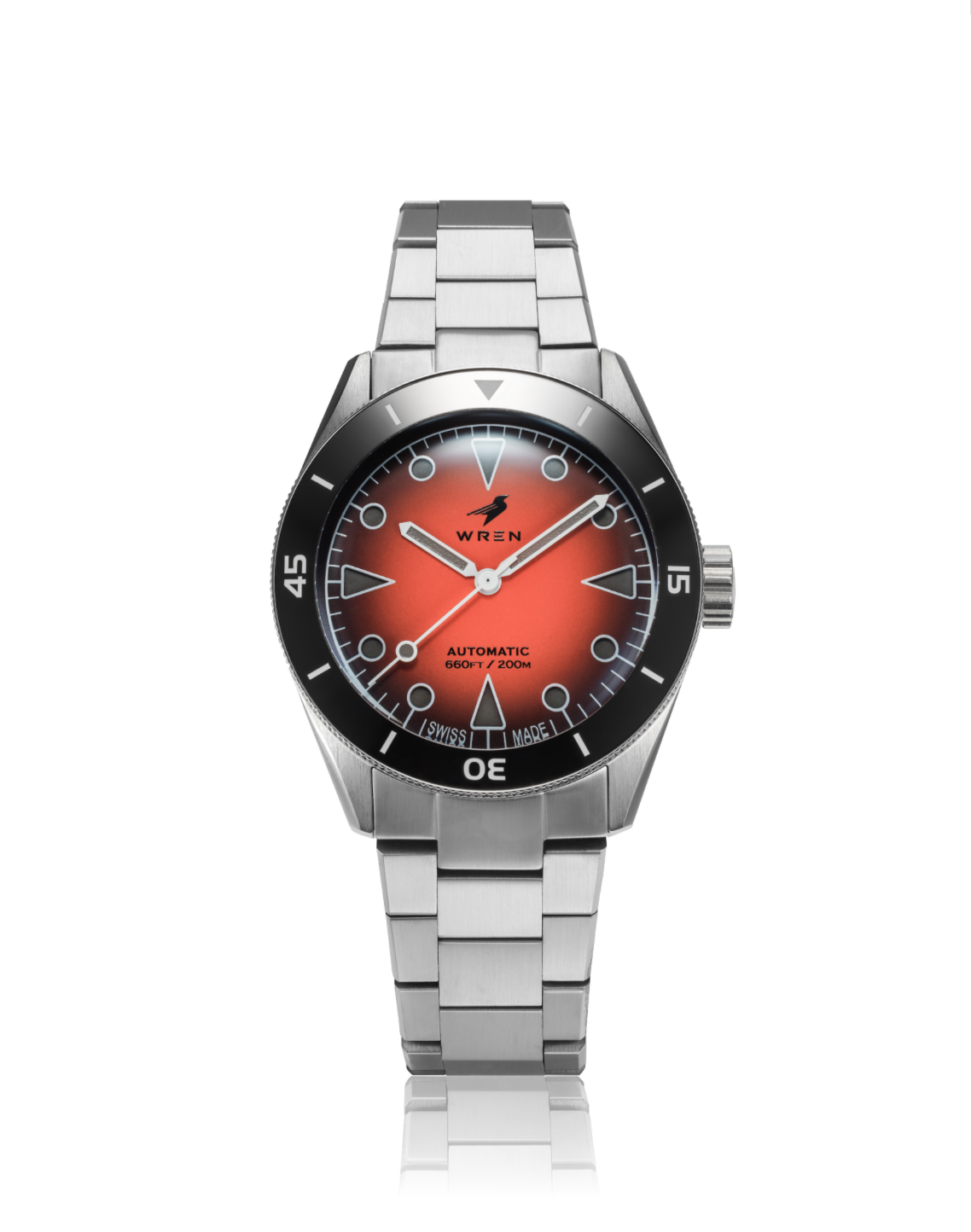 The Diver One Magma is Wrens's first collaboration and most distinctive release to date. Designed in partnership with Ben of @benswatches, the Magma introduces a fiery orange-to-black gradient dial, dark grey lume, and—for the first time in the Diver One series—a ceramic bezel. Combined with white-outlined markers and hands for contrast and legibility, this Swiss made Diver One balances visual heat with functional clarity.