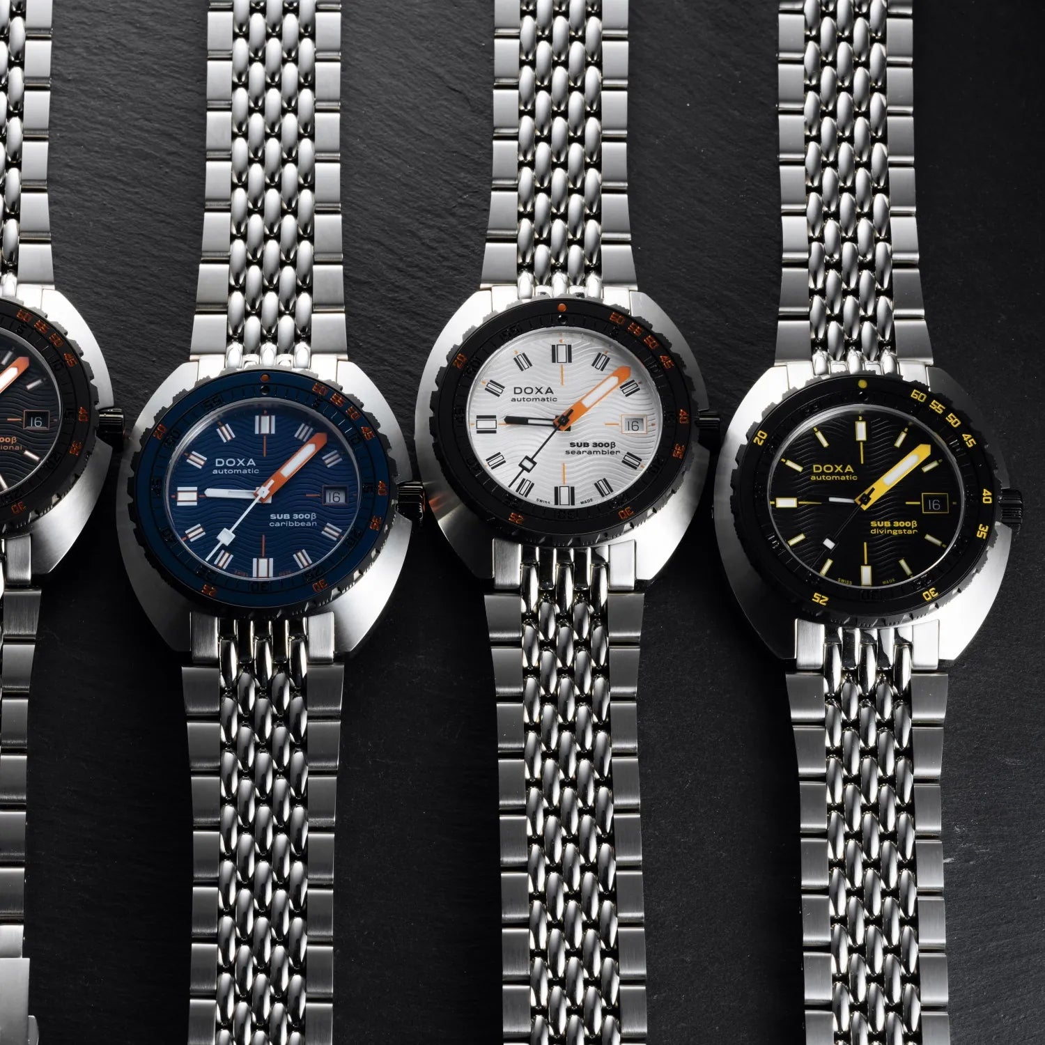 The SUB 300 sports watch combines functionality with style, maintaining foundational tool watch features in a redesigned 42.5 mm diameter case, now slimmer at 11.95 mm. The black ceramic bezel and screw-down crown enhance its sport-chic character, complemented by a sophisticated sunburst dial finish. Available with an FKM rubber strap or stainless-steel "Beads of Rice" bracelet, both featuring a ratcheting folding clasp, the watch is water-resistant up to 300 meters. With a scratch-resistant sapphire crystal, Swiss automatic movement, and a power reserve of around 38 hours, the SUB 300 is engineered for safety and exploration. True to DOXA's unconventional ethos, it blends the spirit of the times with an elegant, modern sport-chic look suitable for urban settings.
