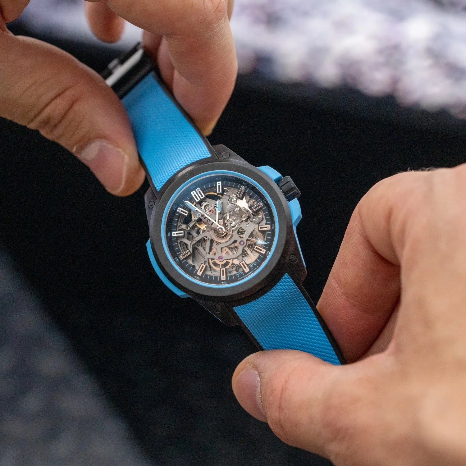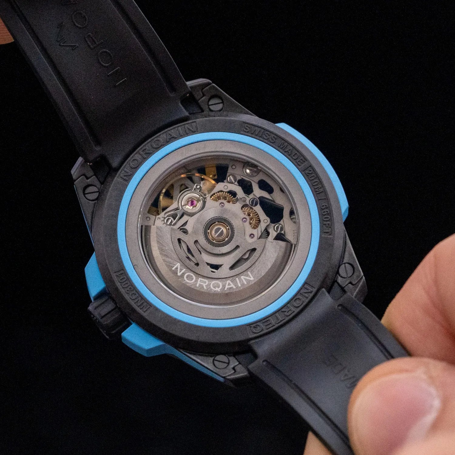 The Wild ONE 39mm, crafted from NORQAIN's proprietary ultra-light and ultra-robust NORTEQ® carbon fibre, is the ultimate high-performance sports watch. Powered by a mechanical automatic skeleton movement, it reveals the intricate craftsmanship and precision engineering at its core.