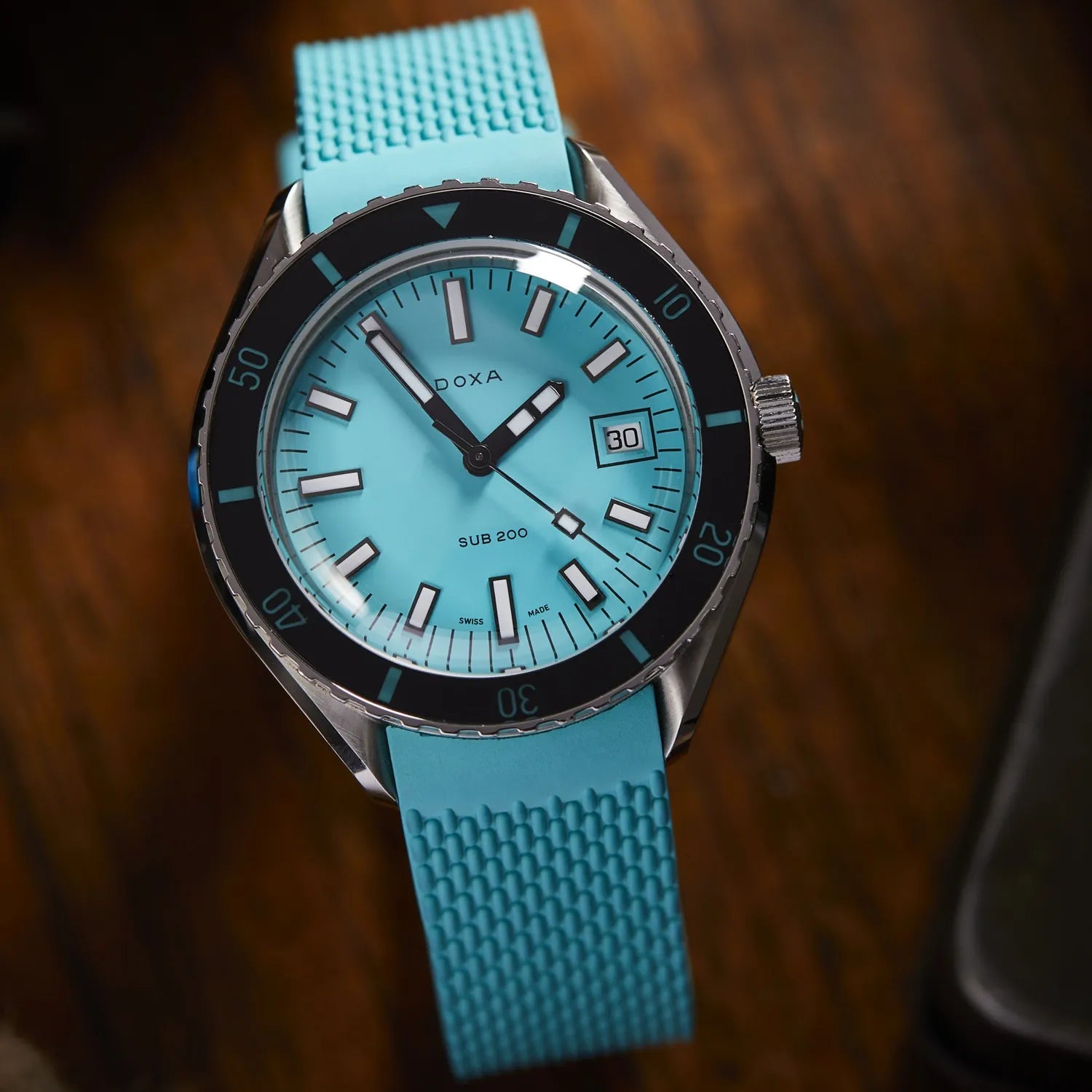 Unveiled at Baselworld 2019, this 3-hand diver's watch has a case made of highest-quality 316L stainless steel. At a diameter of 42 mm, the SUB 200 is topped by a scratch-resistant sapphire crystal with an anti-reflective coating and the distinctive curvature of the domed plexiglass used back in the day. Waterproof to a depth of 200 meters (20 ATM), the model features a unidirectional rotating bezel. All the elements providing dive-relevant information, including the bezel, have a Super-LumiNova luminescent coating. The bracelet is 316L stainless steel and features a folding clasp with the DOXA fish symbol.