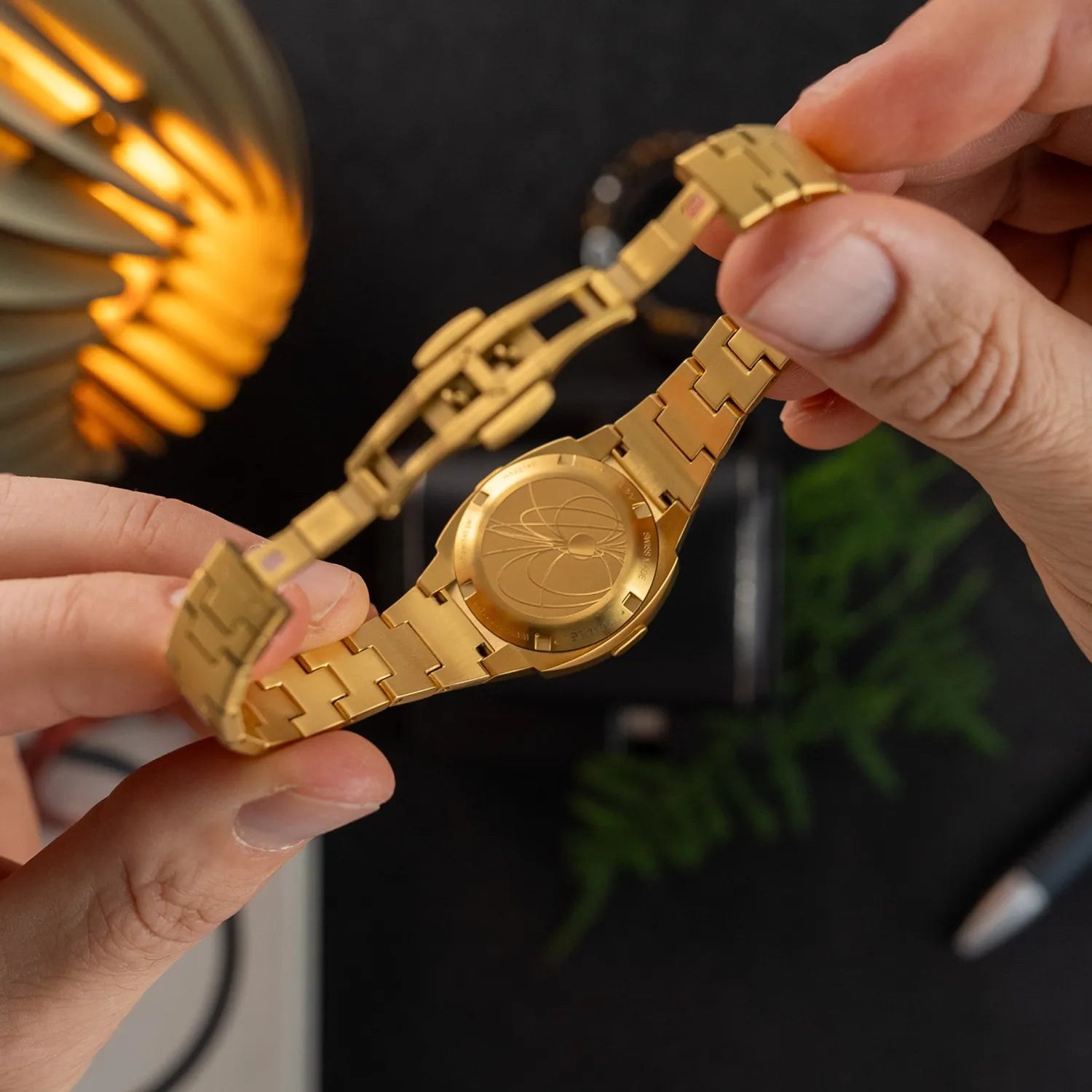 - Case: 31mm cushion case in yellow gold PVD or stainless steel