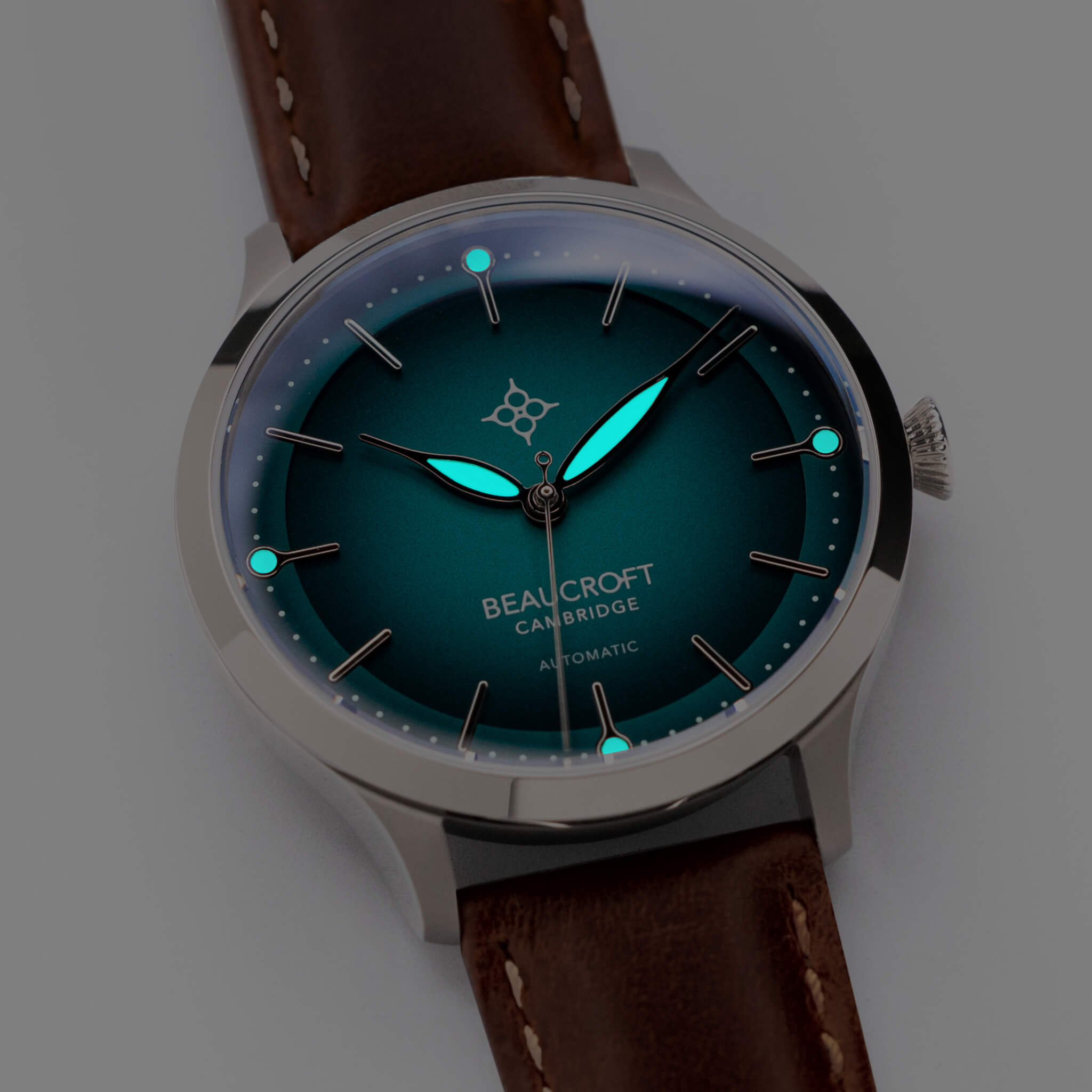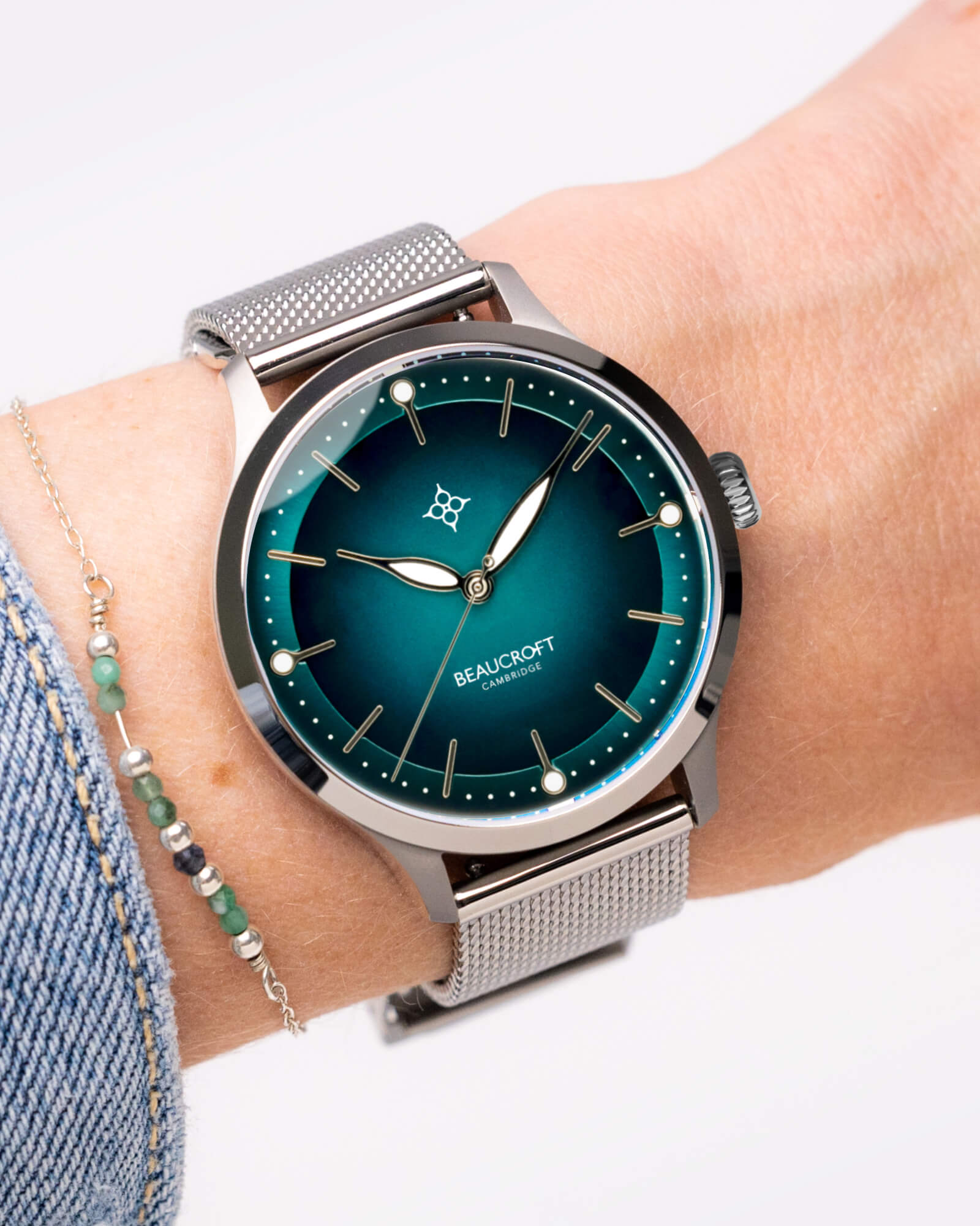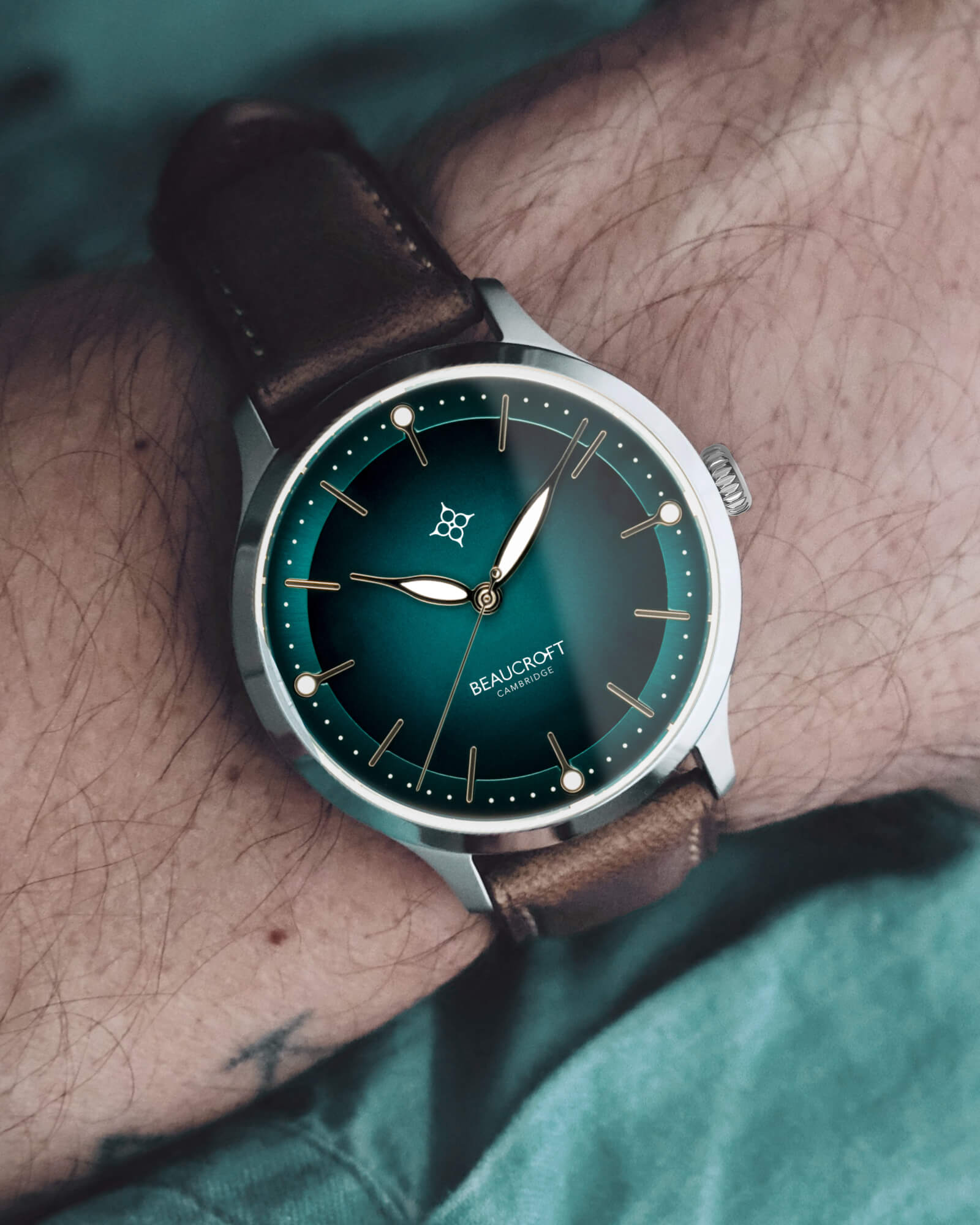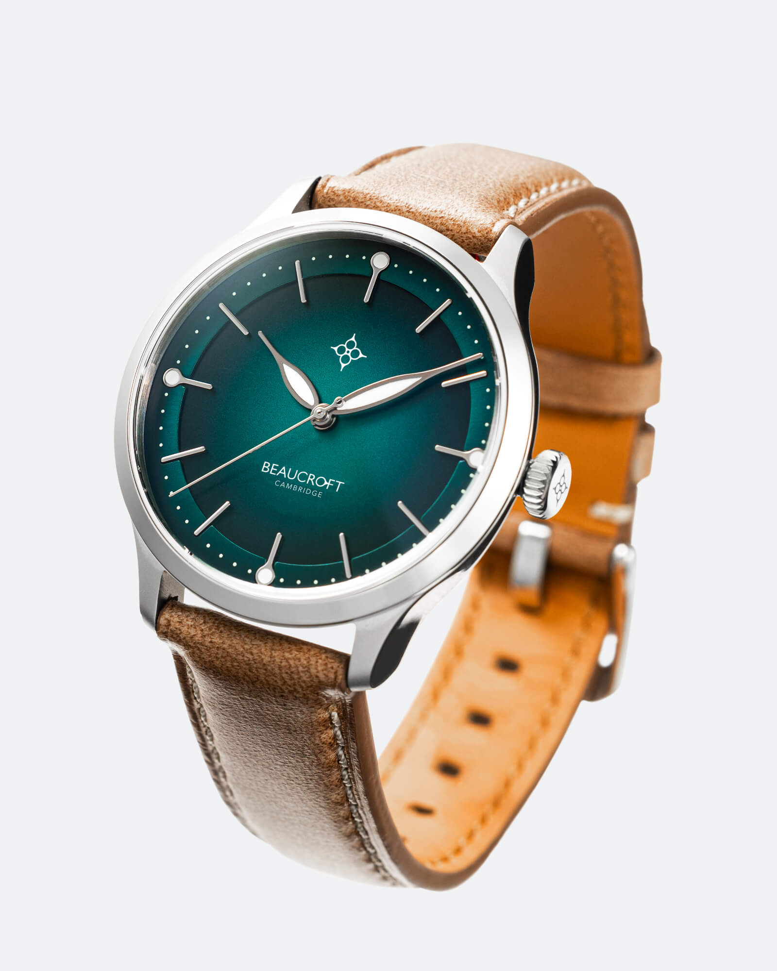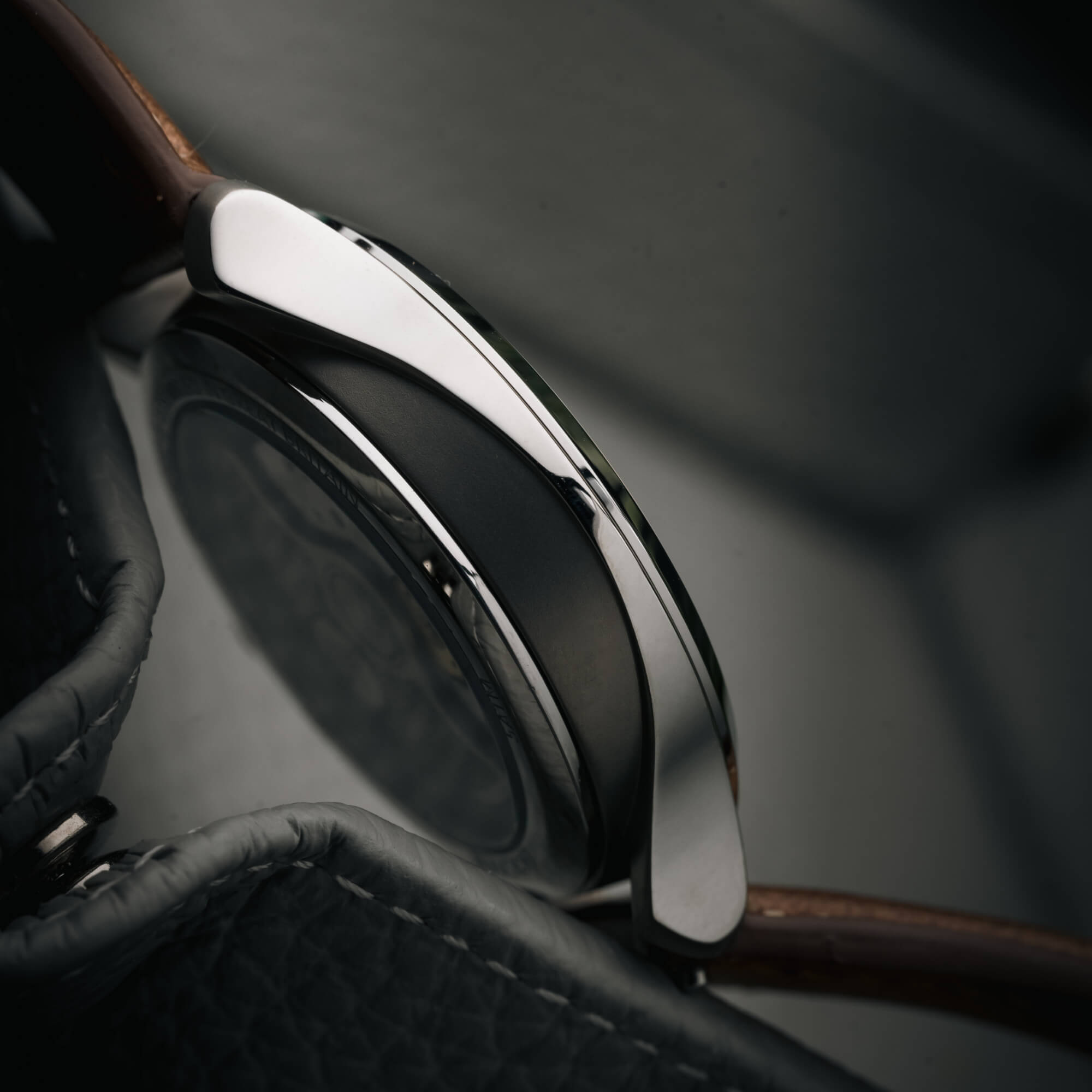 The Seeker has a unique case design with curves that flow from lug to lug, designed from the river in Cambridge and drawing inspiration from the elegant architecture of the iconic bridges.