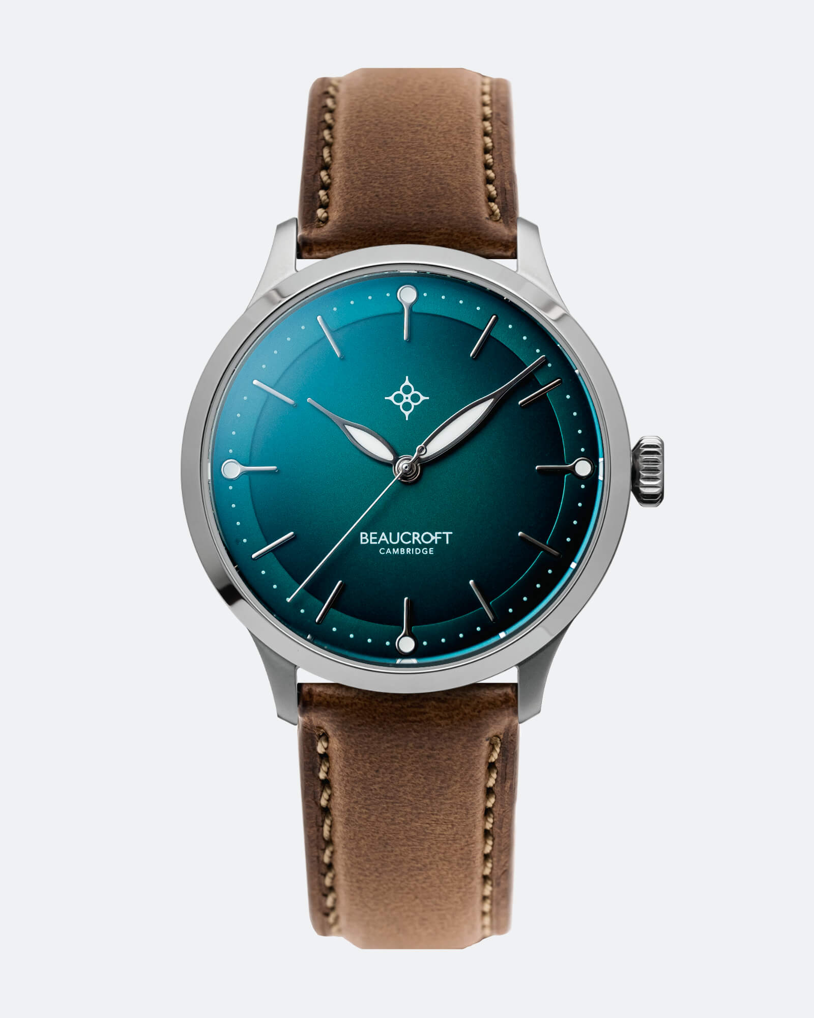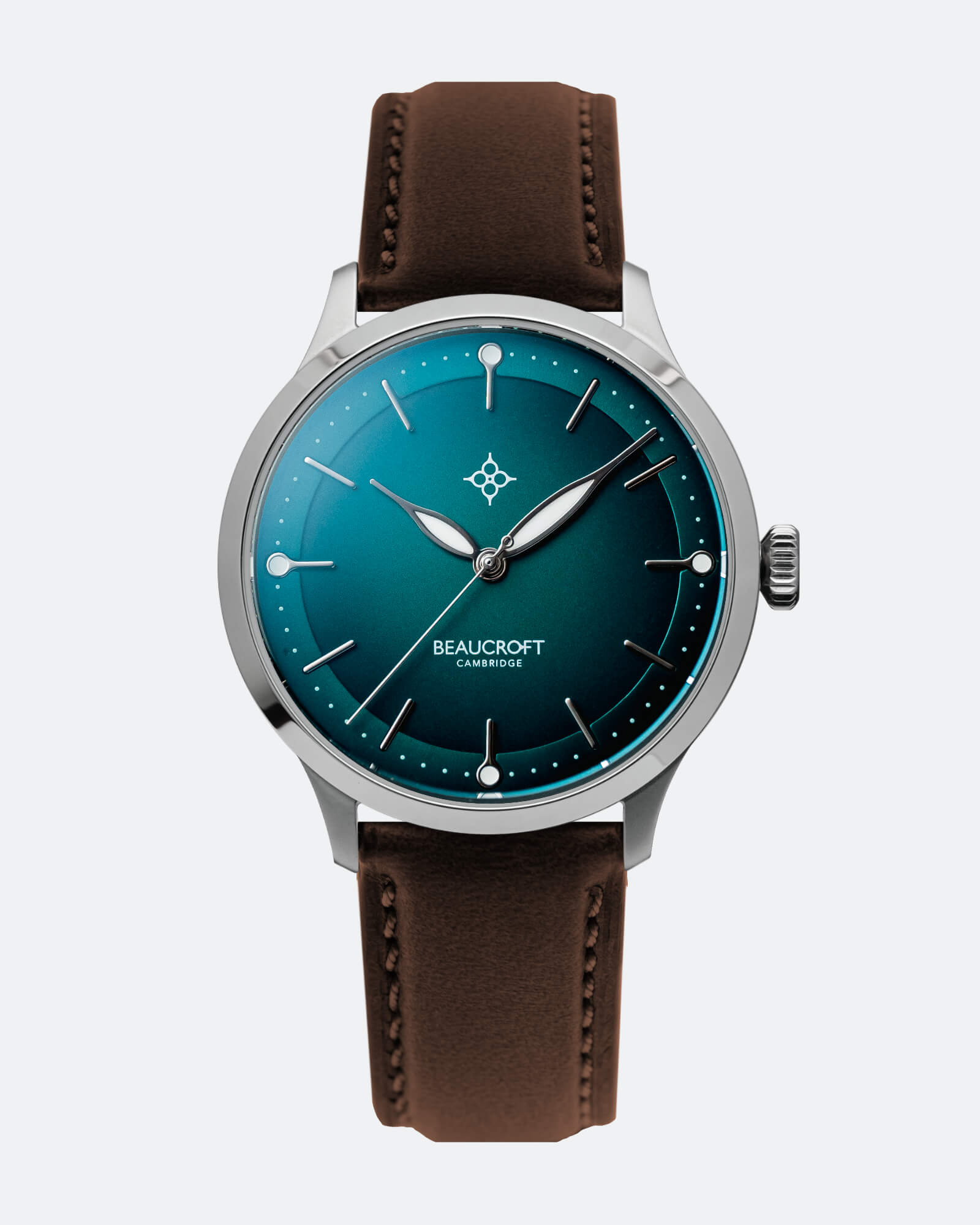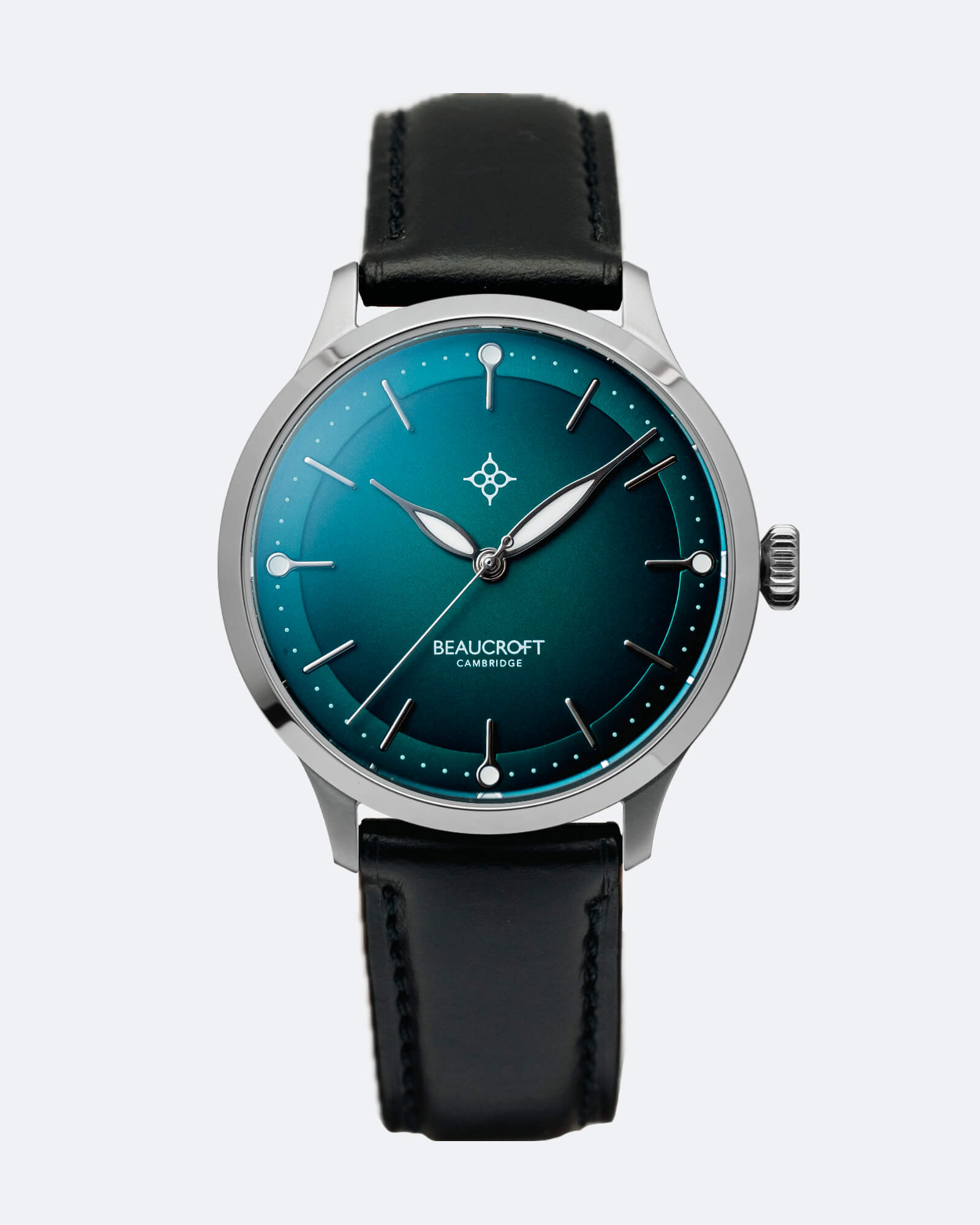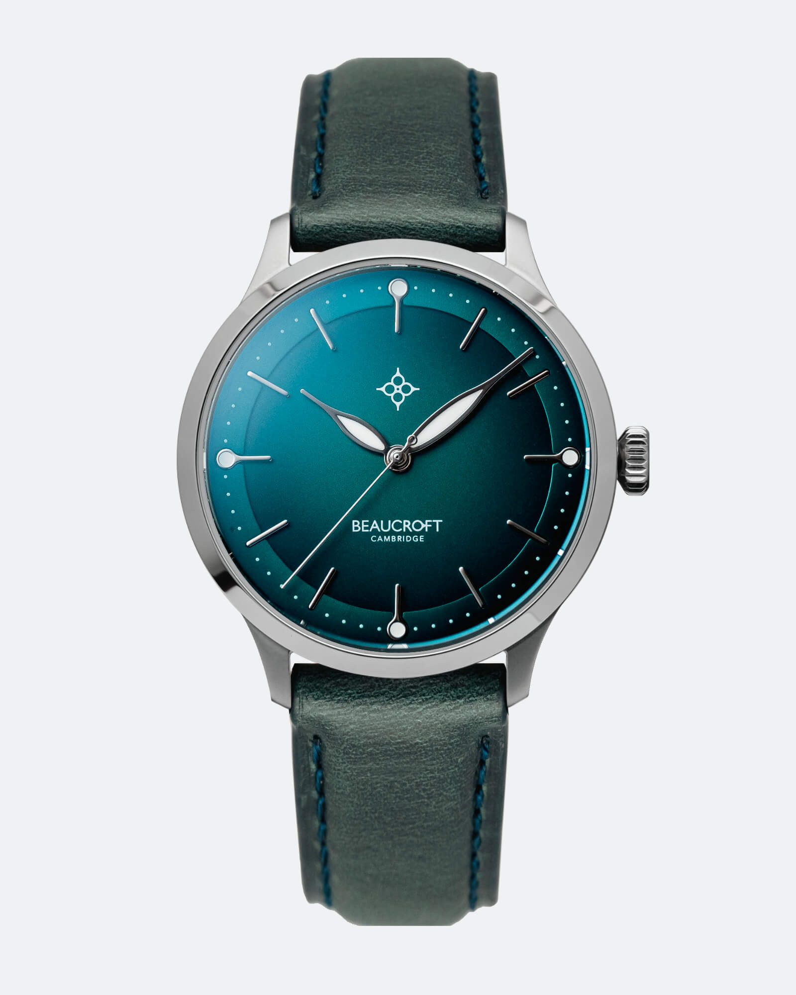 The Seeker Teal is a 3 hand automatic watch with a fume teal satin and sunray finished dial, housed in a stainless steel 37mm casework.
