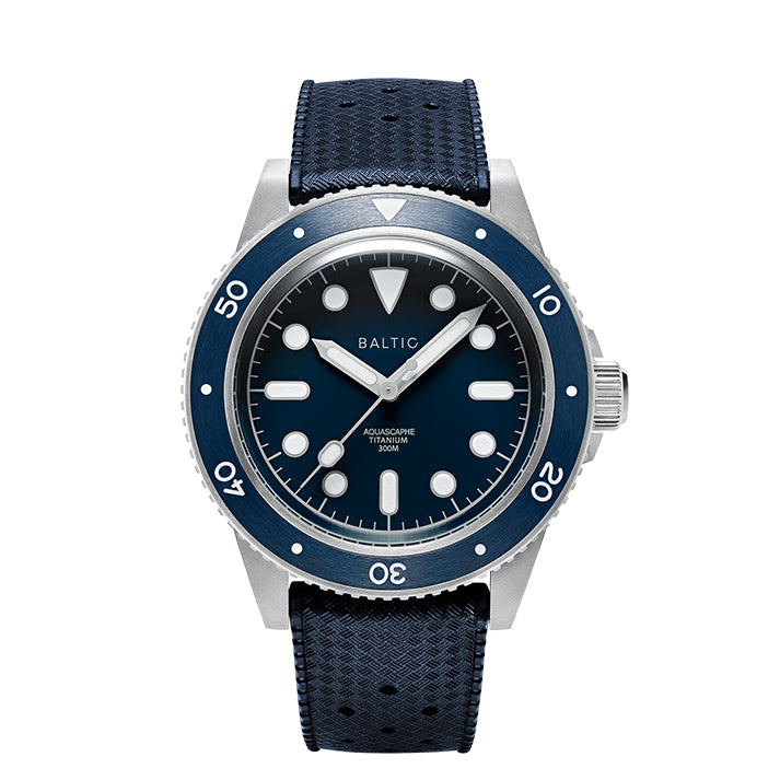 Sturdy, light, and resistant to corrosion... When Baltic created the case for this new adventure diver, titanium was an easy choice. Baltic made the decision to employ a sapphire crystal and encircle it with a unidirectional bezel with a brushed ceramic inlay in order to maximise its resistance. The titanium case weighs 55 grams. It measures 41mm in diameter, 47mm from lug to lug, and 13.6mm thick. A genuine tool-watch that is waterproof up to 300 metres that you can carry with you at all times.