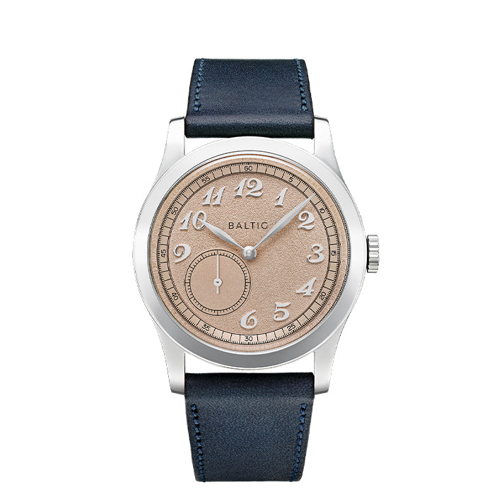 Baltic's interpretation of the traditional three-hand dress watch led to the creation of this model. This timepiece's distinctiveness is due to the use of Breguet appliques, which contrast with the dial's grained finish. Silvered hands in the shapes of leaves indicate the hours and minutes. With its guilloché finish and off-center position at 7 o'clock, the seconds counter stands out from the rest of the dial and adds a contemporary and distinctive touch.