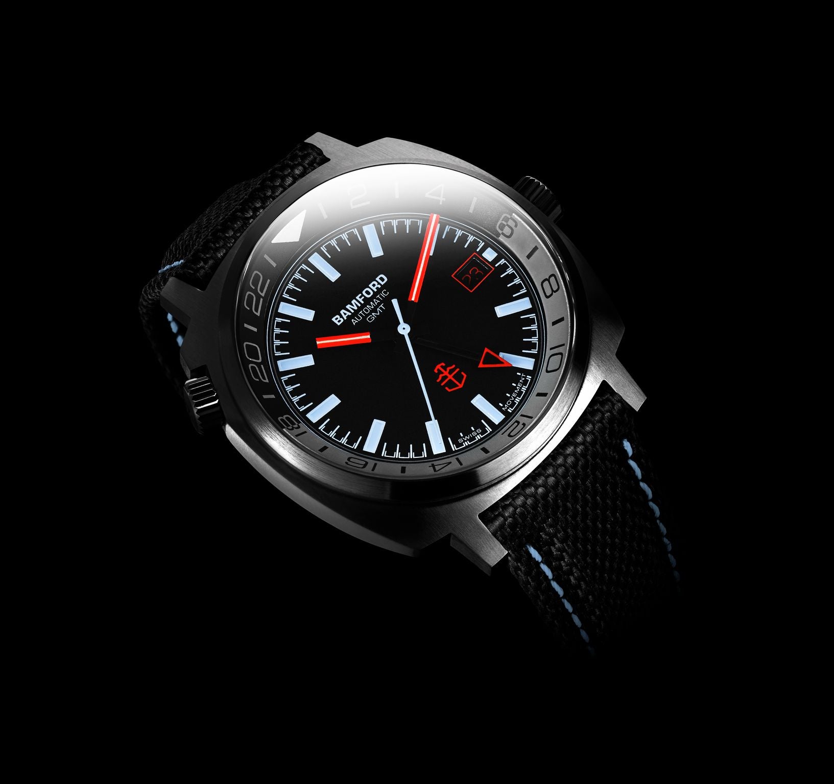 The GMT features a DLC case and matching DLC coated bracelet along with a black with blue stitching Cordura Strap. The Bamford Blue hour markers contrast nicely against the Black and Grey Internal GMT Bezel.