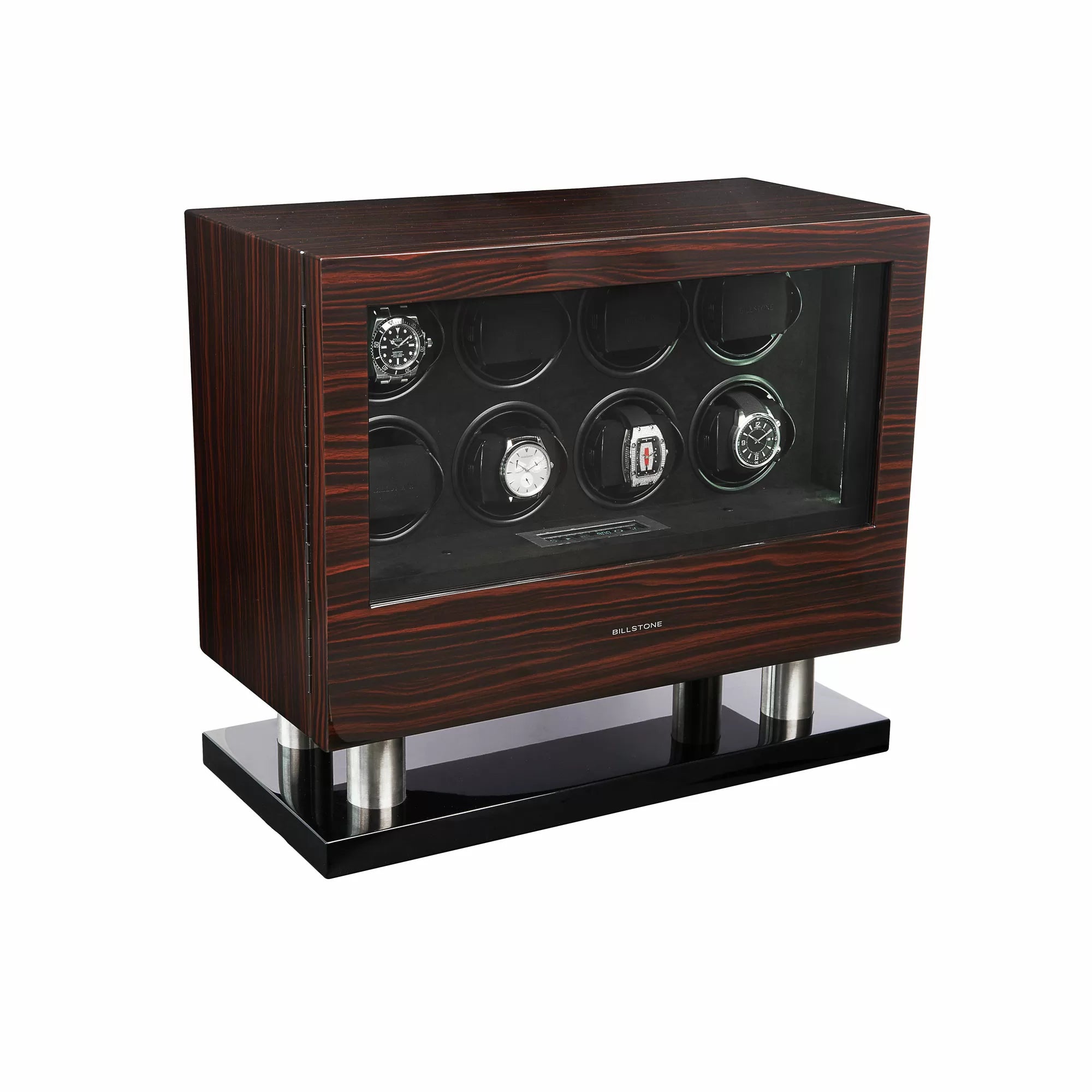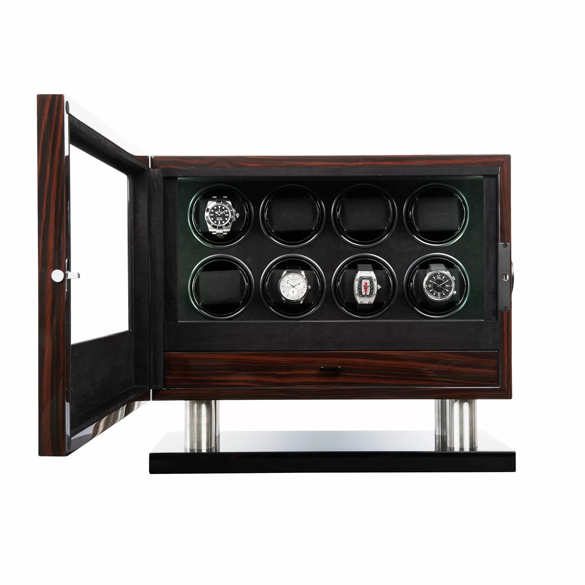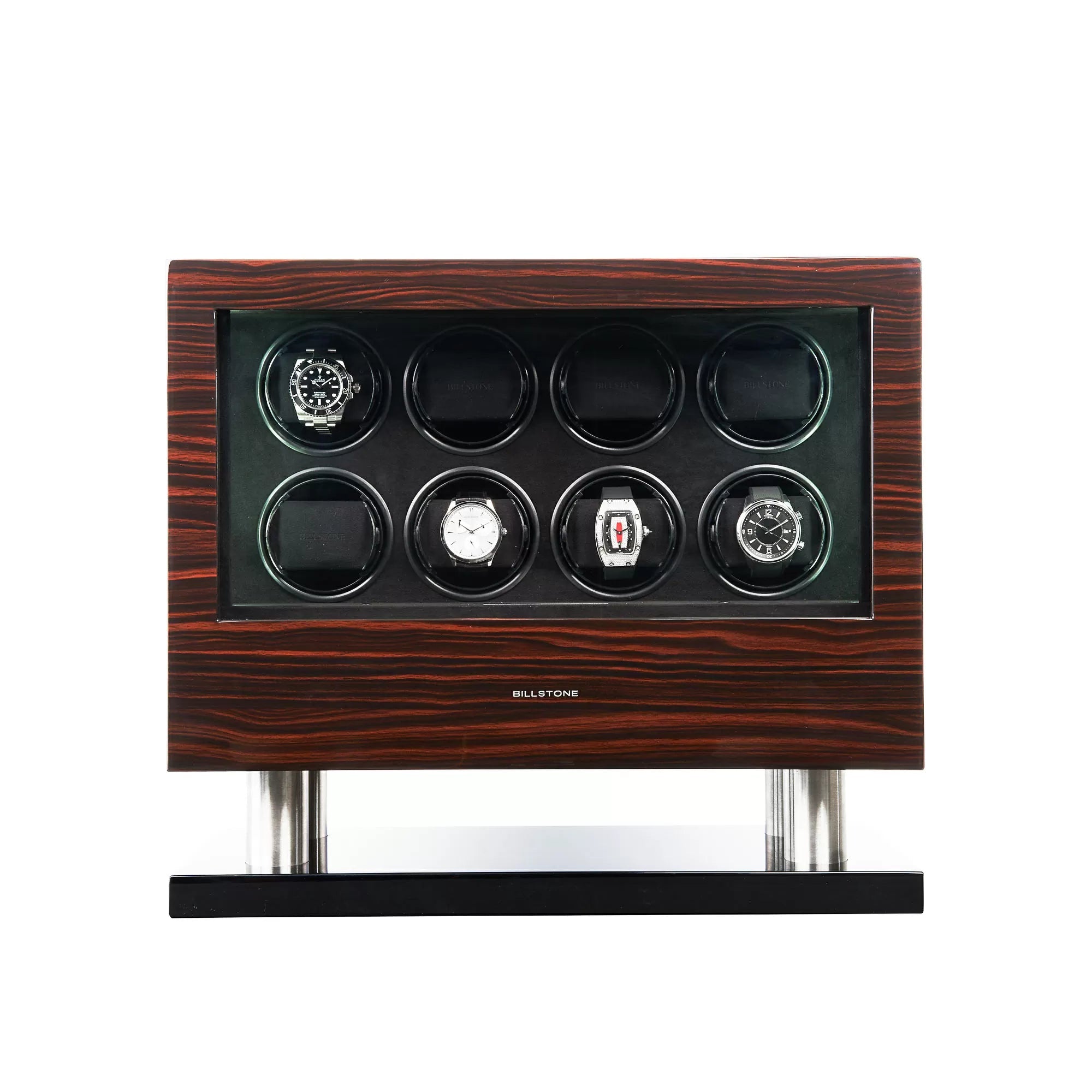 The Enigma watch winder is one of Billstone most popular product lines. It is built with luxurious and high-quality material: stainless steel legs, exotic wood finish, luxurious and soft interior lining, and a patented watch-holding system that securely holds your automatic watches. The Milford Enigma watch winder is a must-have item for every serious watch collectors.
