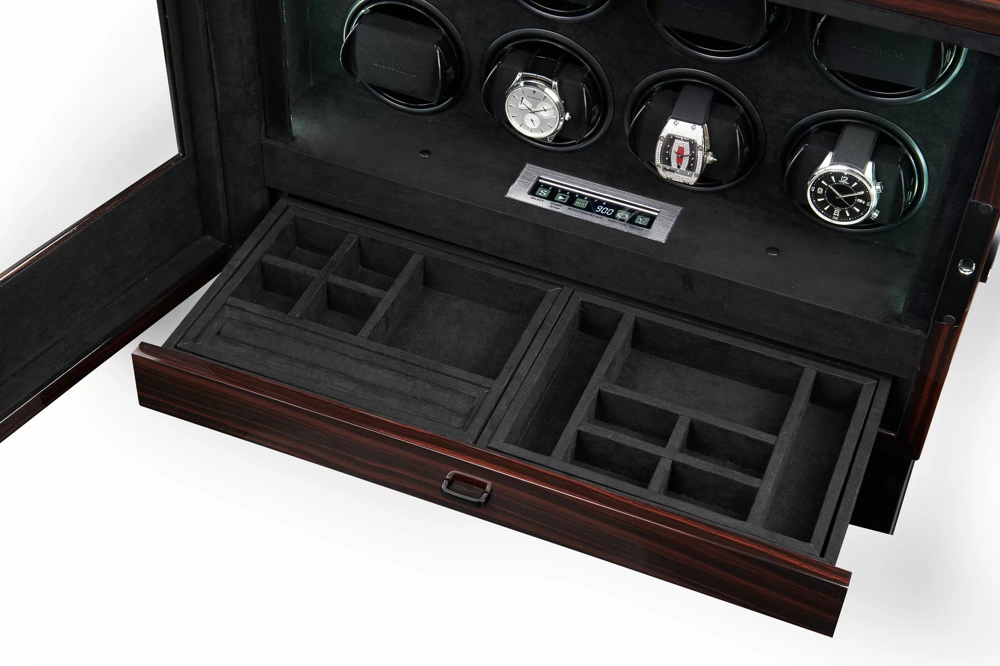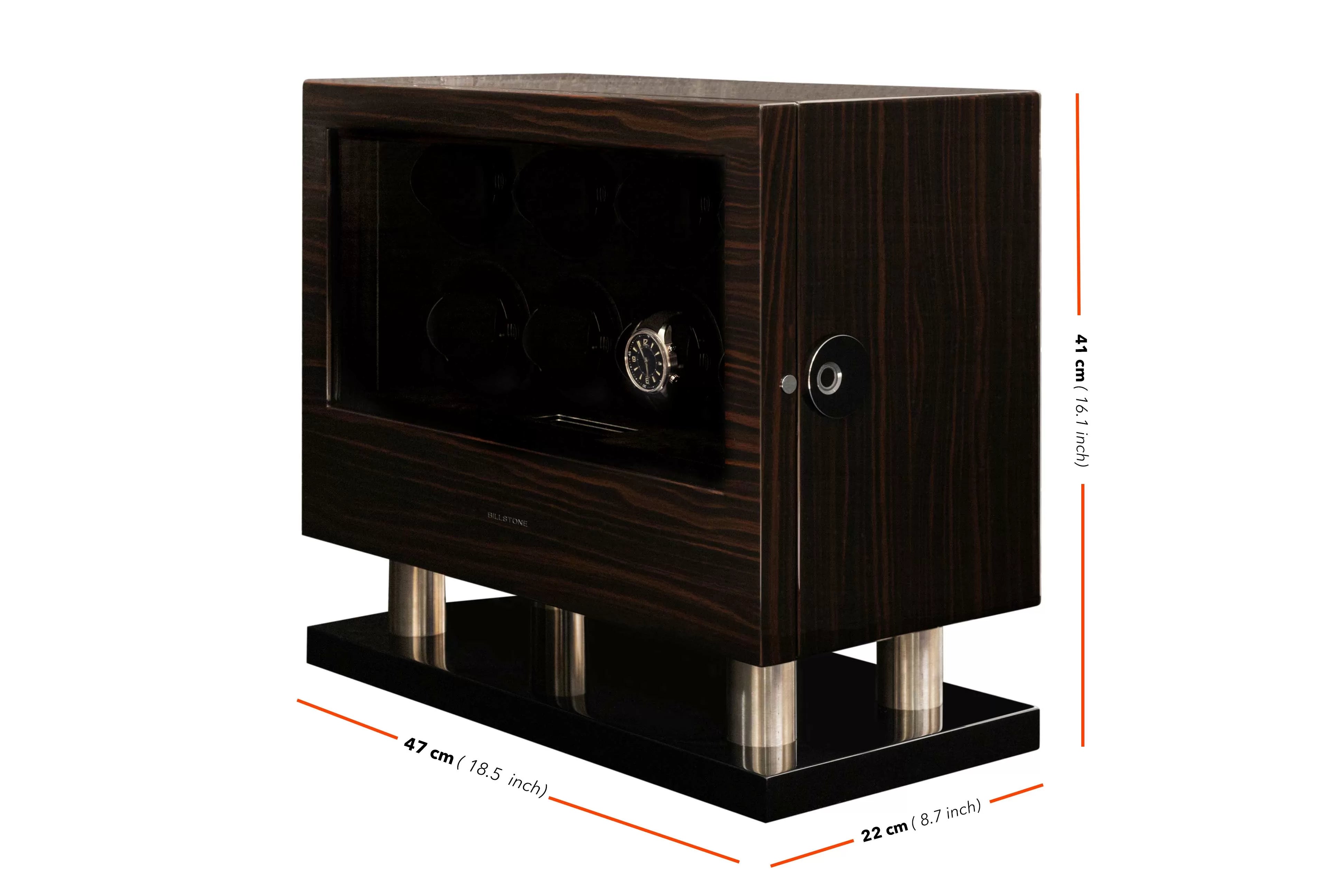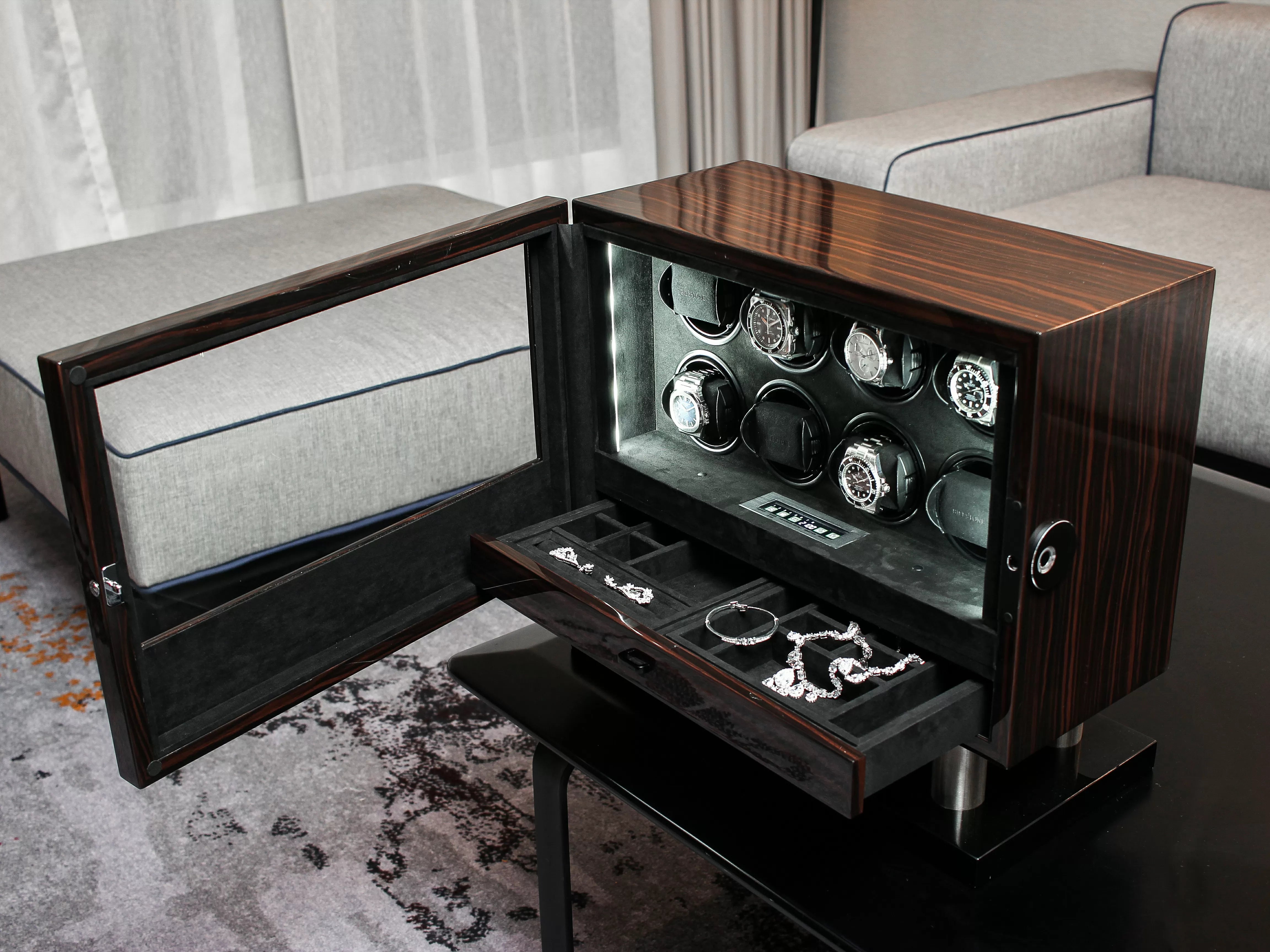 Each one of the watch winders in the BILLSTONE Enigma can have its rotation direction and TPD (Turns-Per-Day) individually programmed via a central control panel. With the right setting, you can make sure that your automatic watch is optimally winded according to your watch's recommended specification.