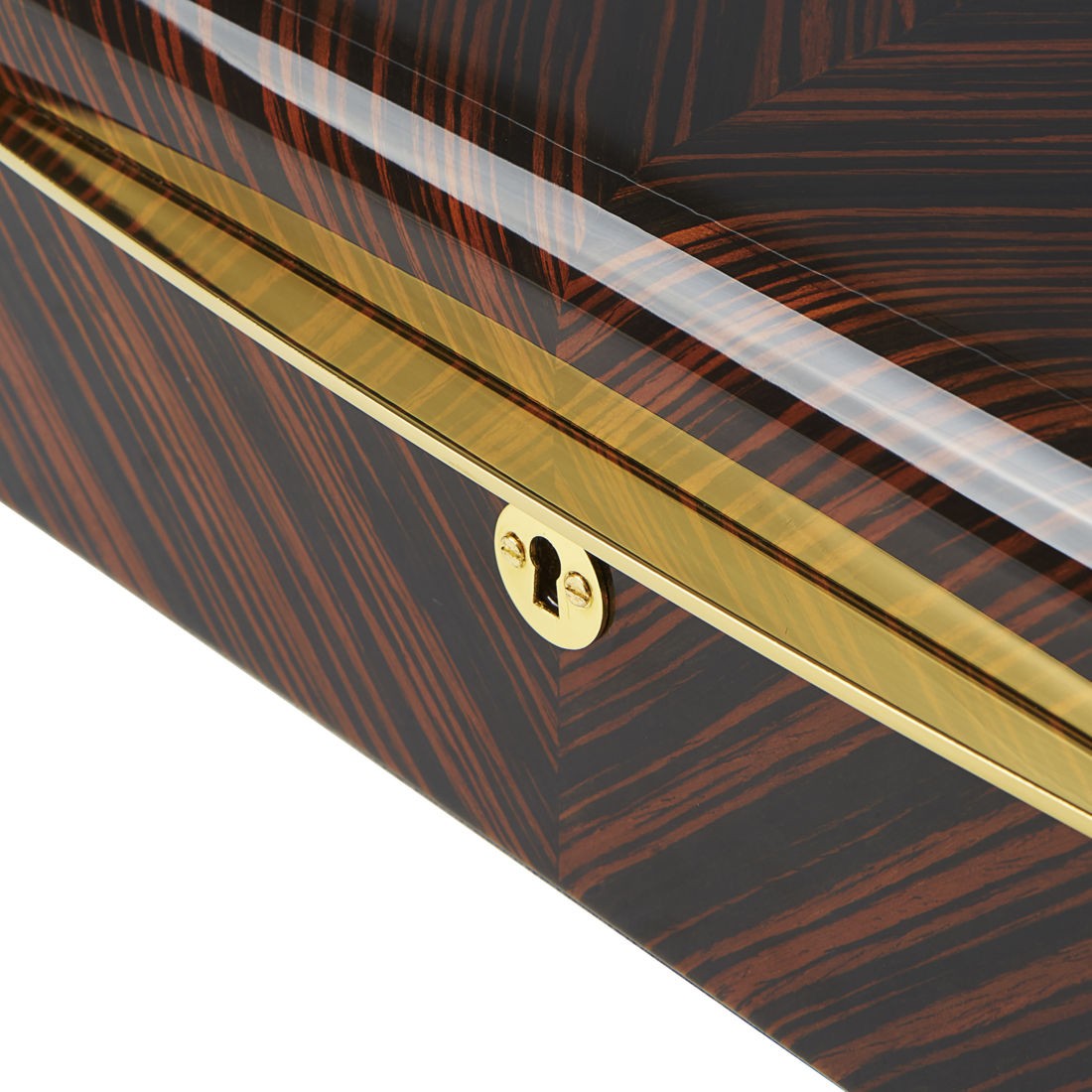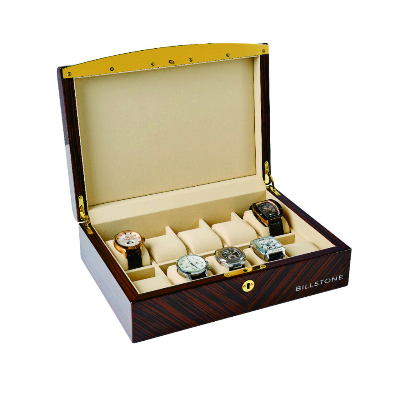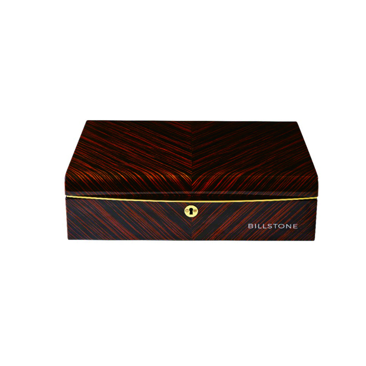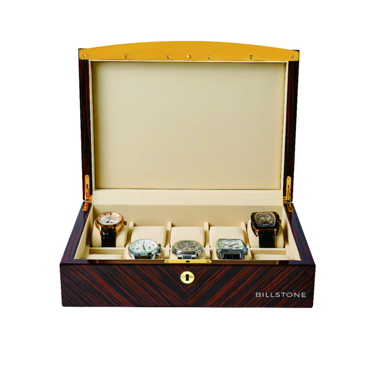 Milford Solstice is a finely made, handcrafted watch box with a luxurious ebony wood finish that is sure to capture your eyes. The handle of the watch box is made of golden-finished stainless steel that matches beautifully with the ebony wood finish.