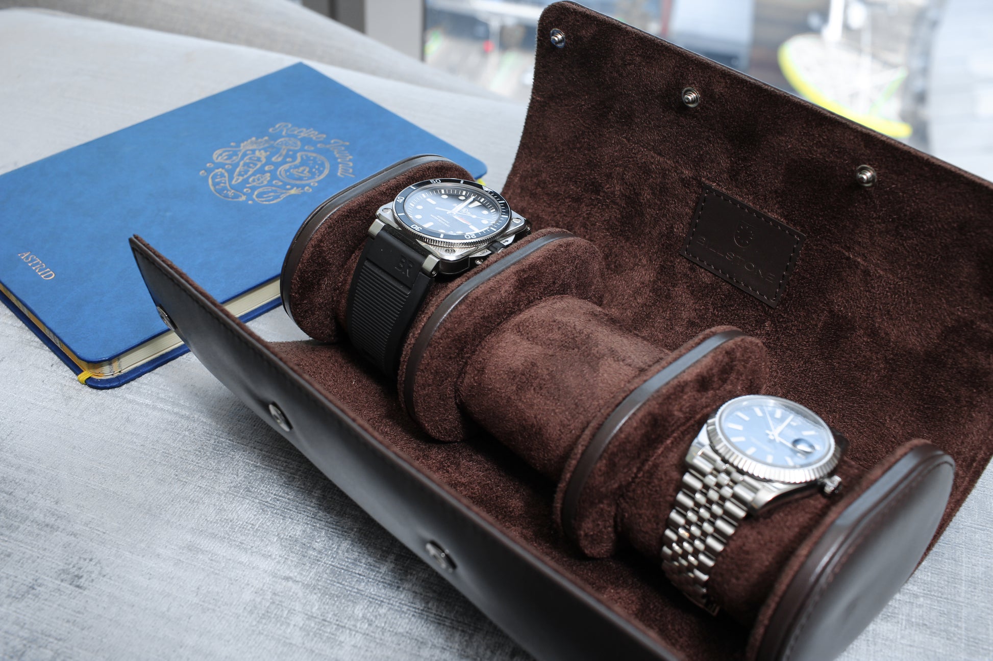 The Billstone Voyager is a lightweight watch roll designed for individuals constantly on the move. The shape of the watch roll allows for it to fit in a hand-carry suitcase, especially if you use the cube packing technique or roll your clothes packing the suitcase. The structure of the watch roll is made of thick and strong material to protect your watch, should your suitcase be slammed or piled under suitcases.