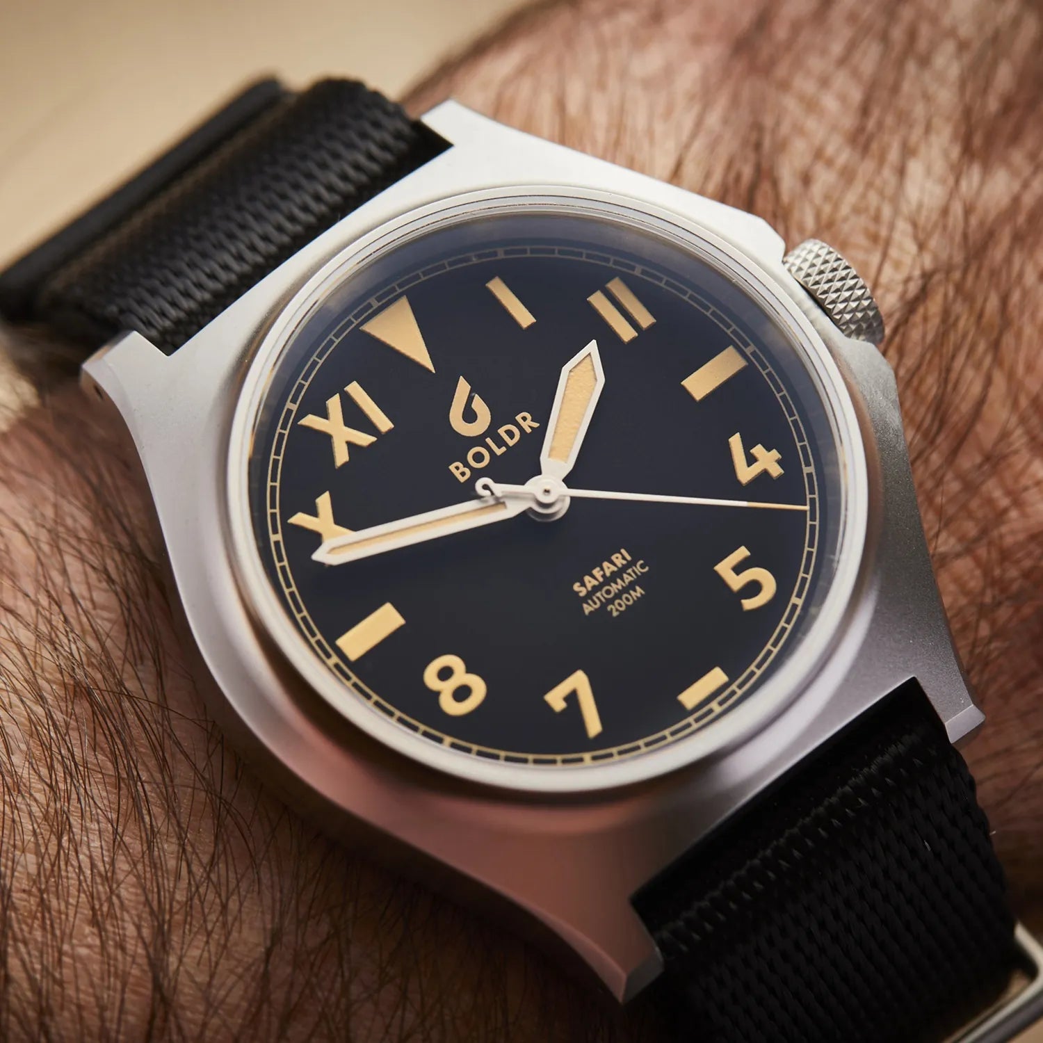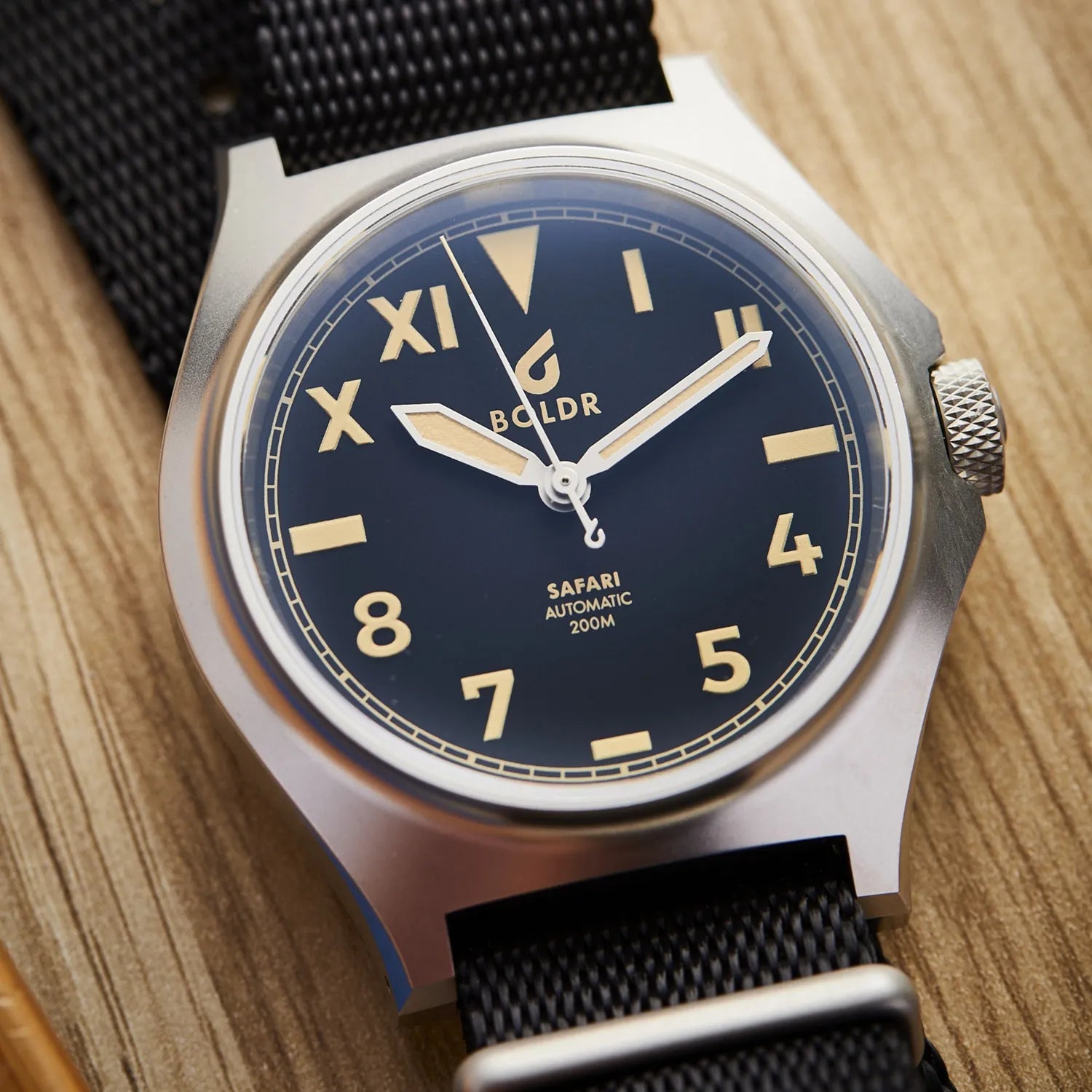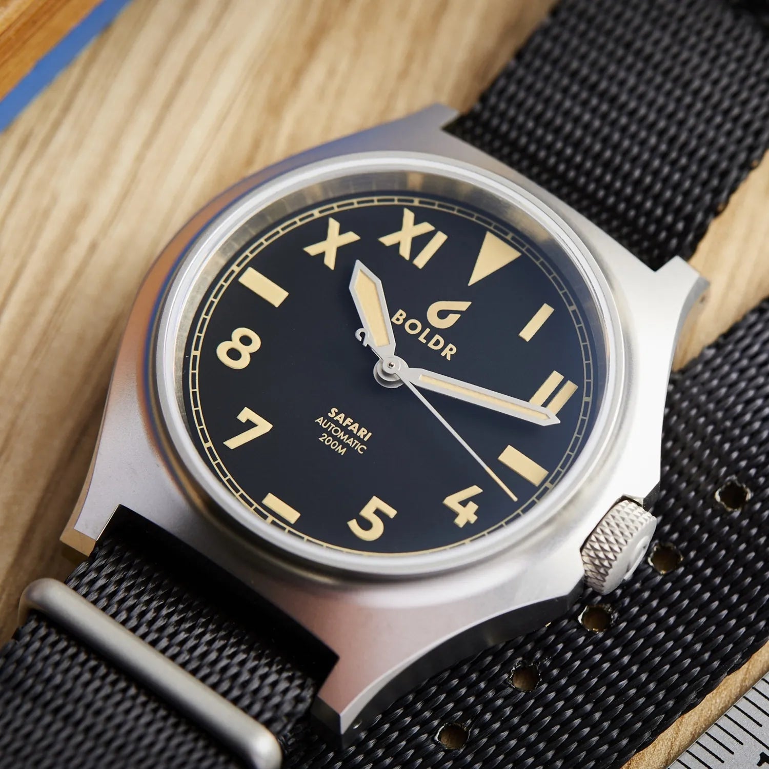 This Safari Ranger is a compact beast forged with stainless steel and a determination for exploration. Measuring 40mm across your wrist, it has the simple elegance of a field-style tool watch.