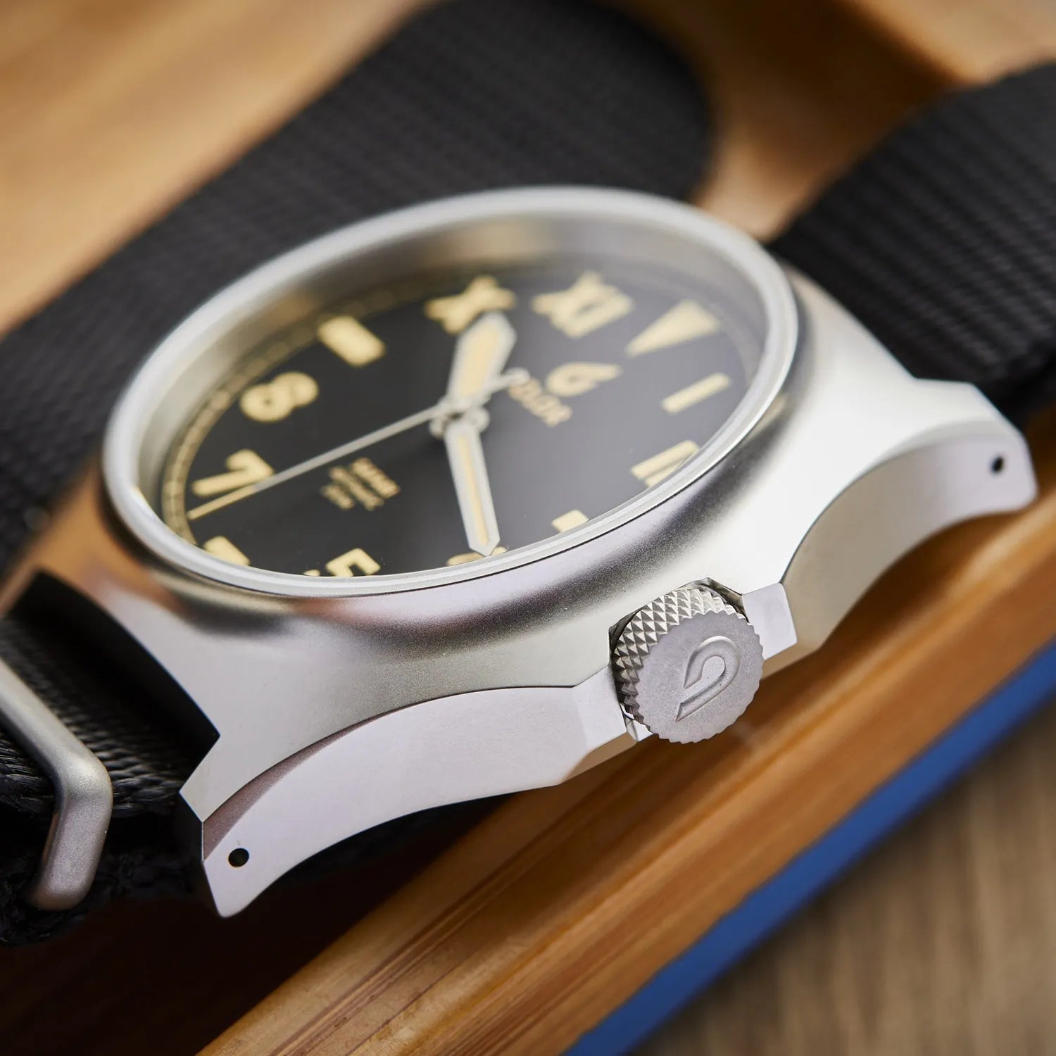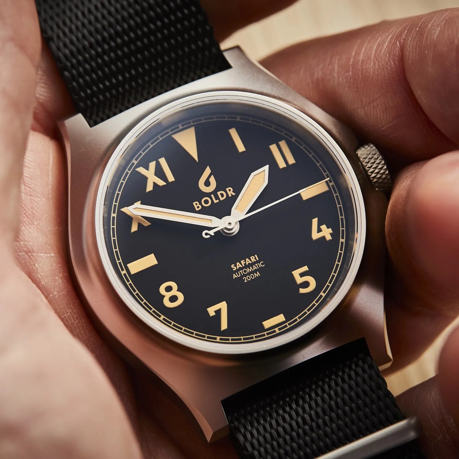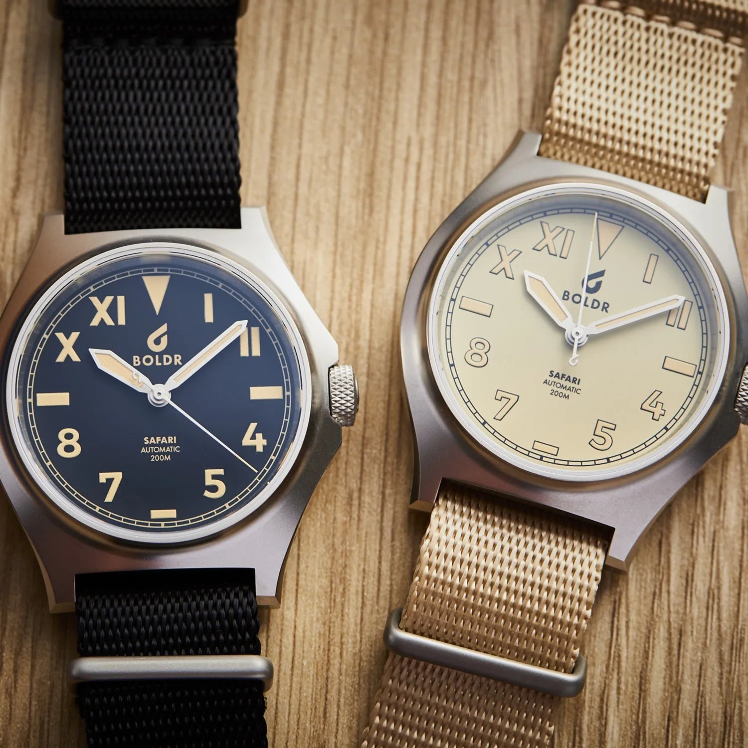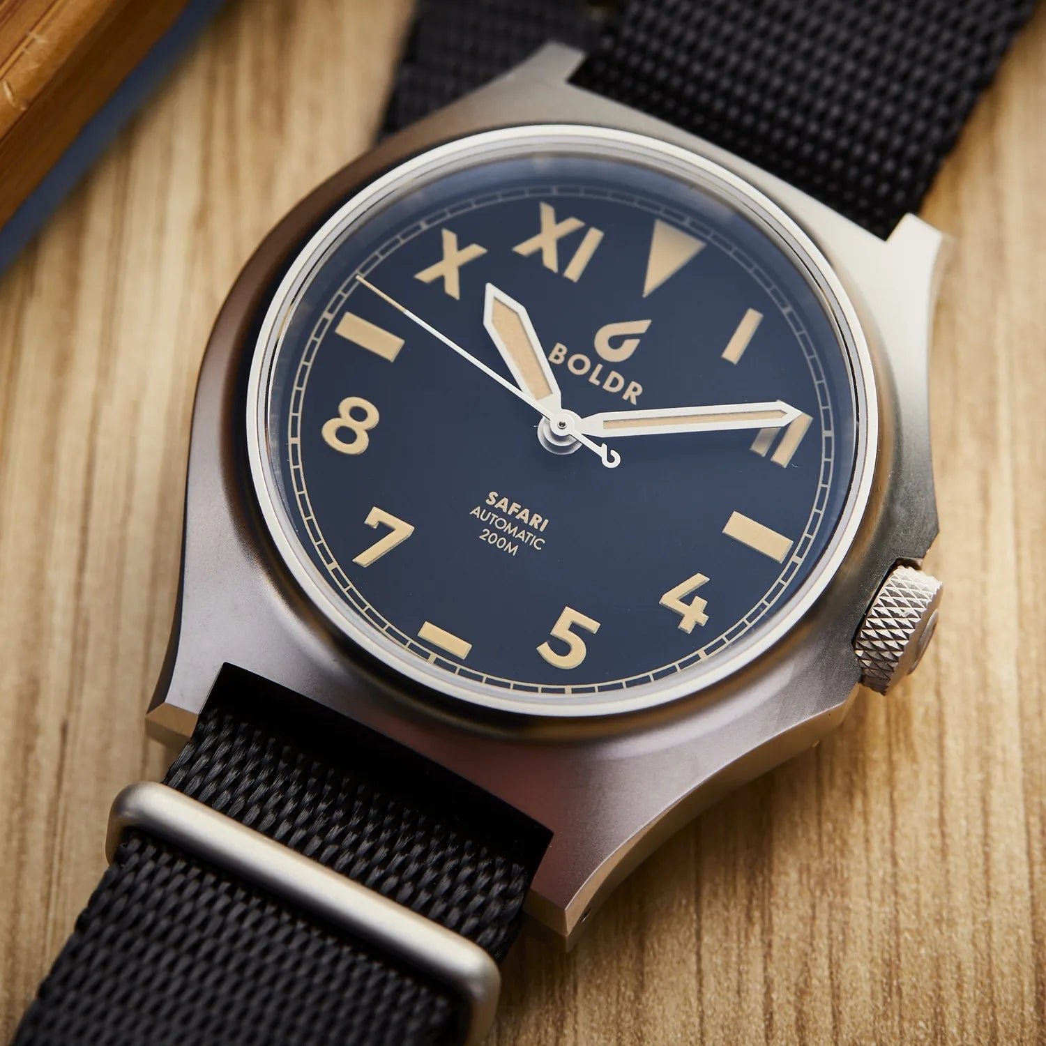 This Safari Ranger is a compact beast forged with stainless steel and a determination for exploration. Measuring 40mm across your wrist, it has the simple elegance of a field-style tool watch.
