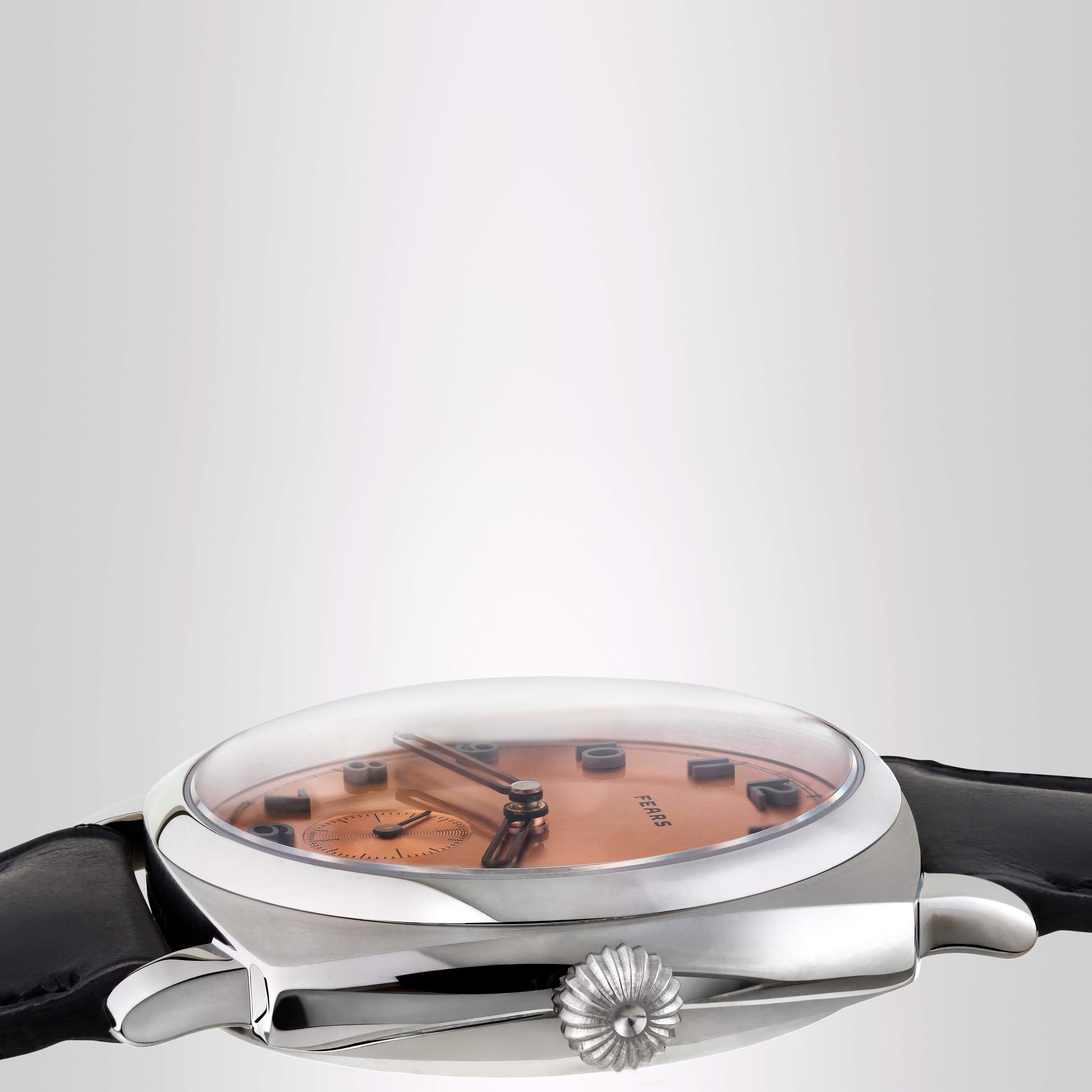 The Brunswick Salmon showcases a Copper Salmon dial, a tone achieved with galvanic coatings of 18ct rose gold and copper. Expertly made in Germany, the dial's surface features a delicate hand-applied vertical brushing, making each dial unique and subtly reflective. This is complemented by concentric circle finishing on the sunken sub-seconds at 6 o’clock. Hand-applied numerals, diamond polished, sand-blasted, and coated in anthracite, feature the custom ‘Edwin’ typeface, specially designed for Fears.