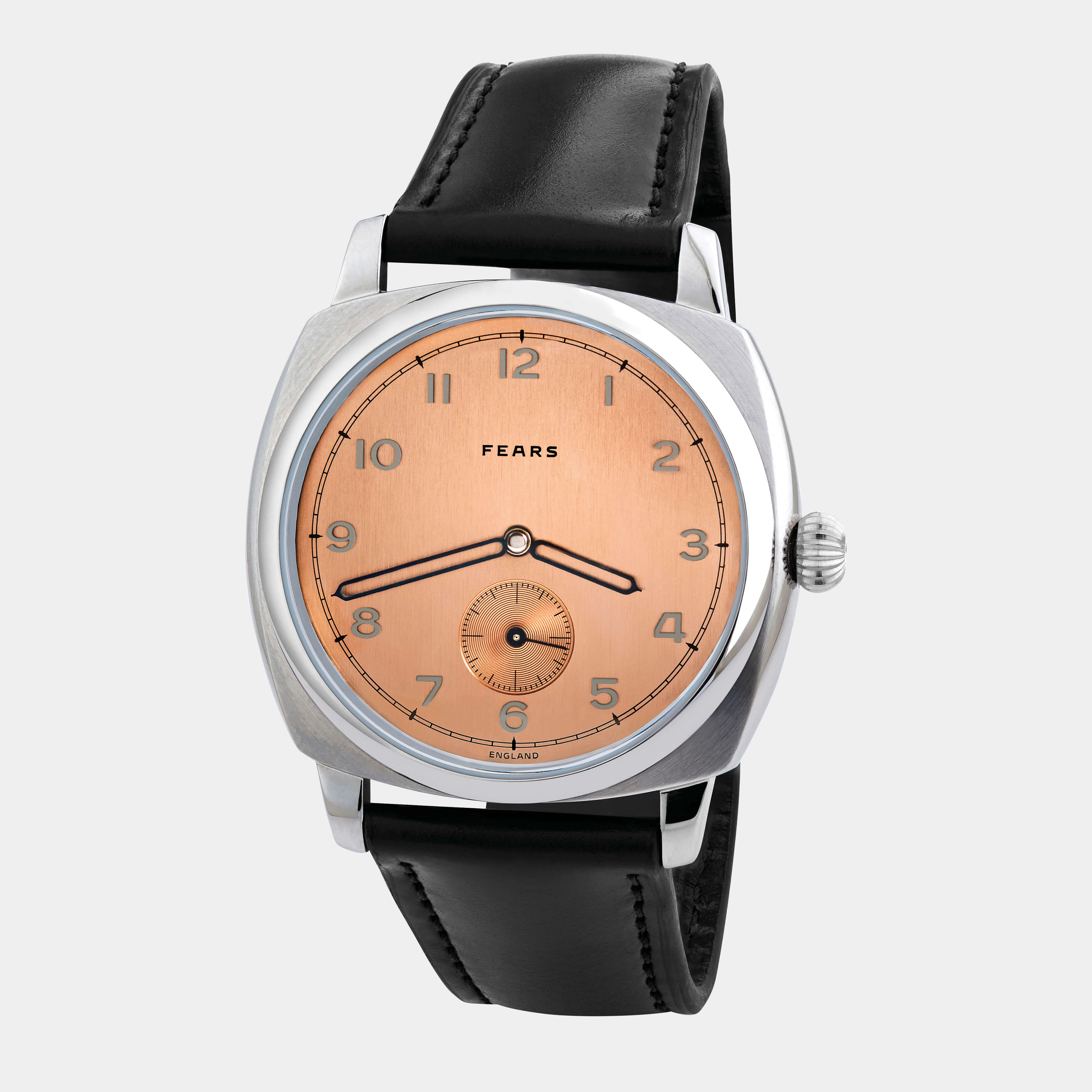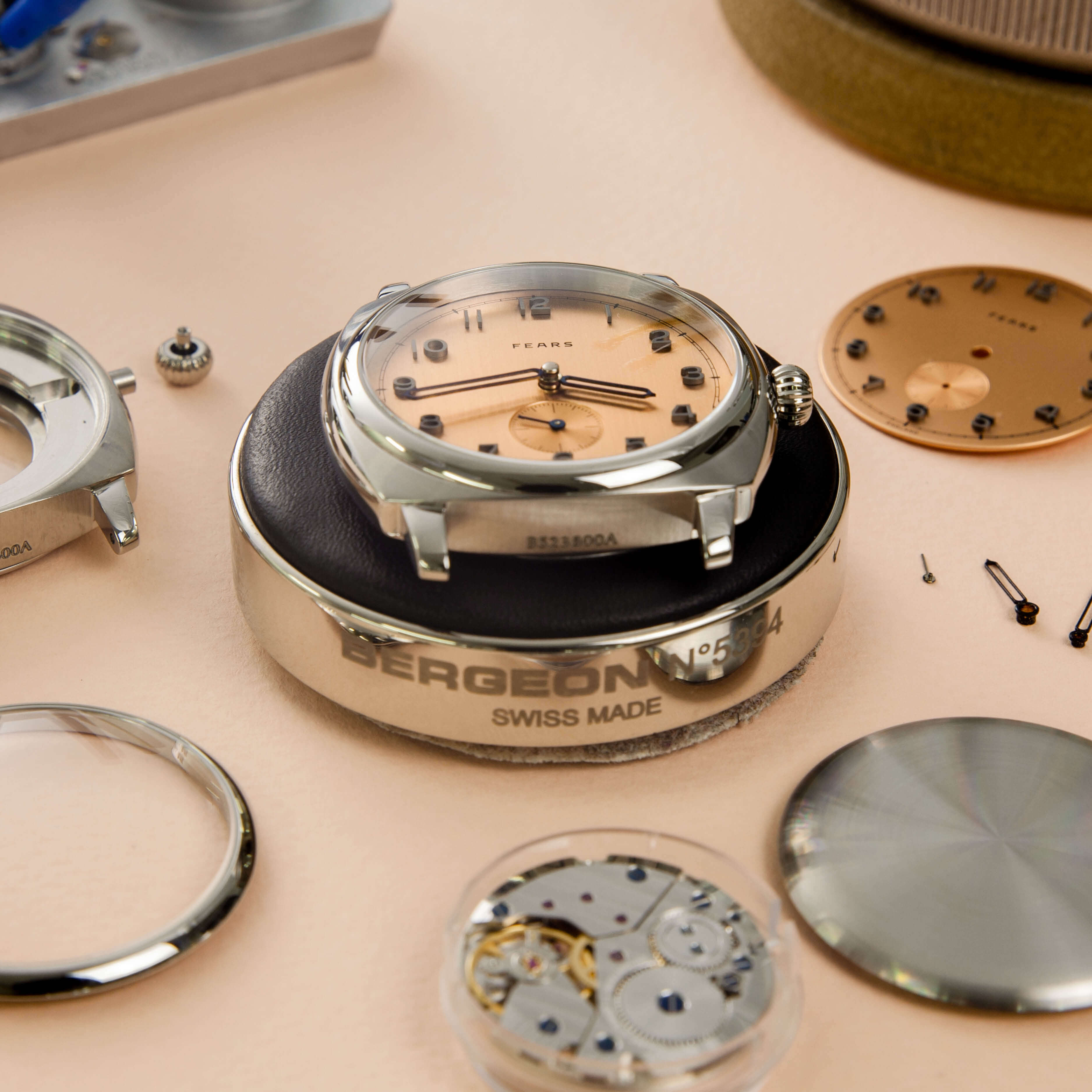Each watch is uniquely numbered, with the serial number engraved between the 20mm lugs at 12 o’clock, allowing Fears to identify and trace the watch’s history. Continuing a tradition, the Brunswick Salmon is presented in a bespoke wooden box stained Fears Blue and lined in genuine cream suede, echoing the dark blue box with cream lining used for decades. The watch sits proudly on a special cushion, completing its elegant presentation.
