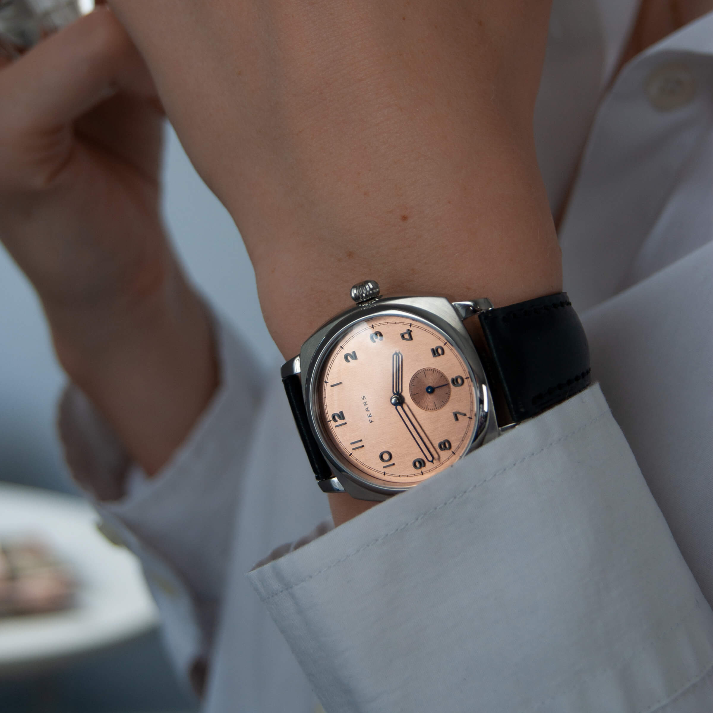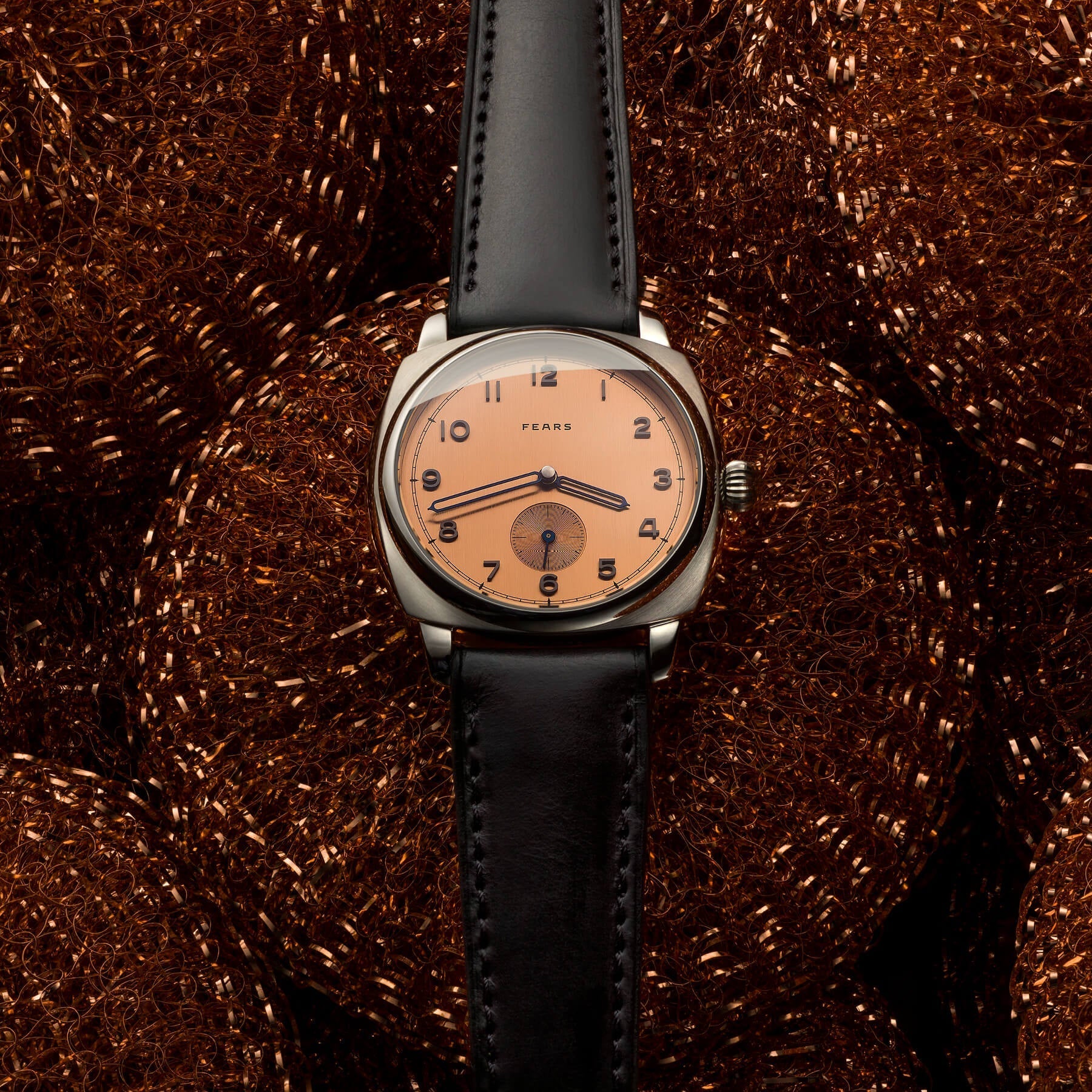 The glowing Fears watch, hand-built in Britain in small batches, is a testament to elegance and precision. The curvaceous Brunswick draws inspiration from a 1924 gentleman’s cushion case watch in the Fears archives and features a dial color reminiscent of the 1940s and 50s.Â