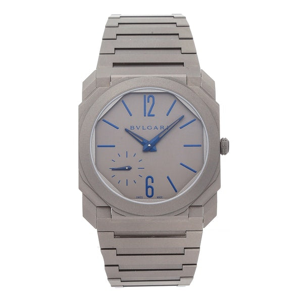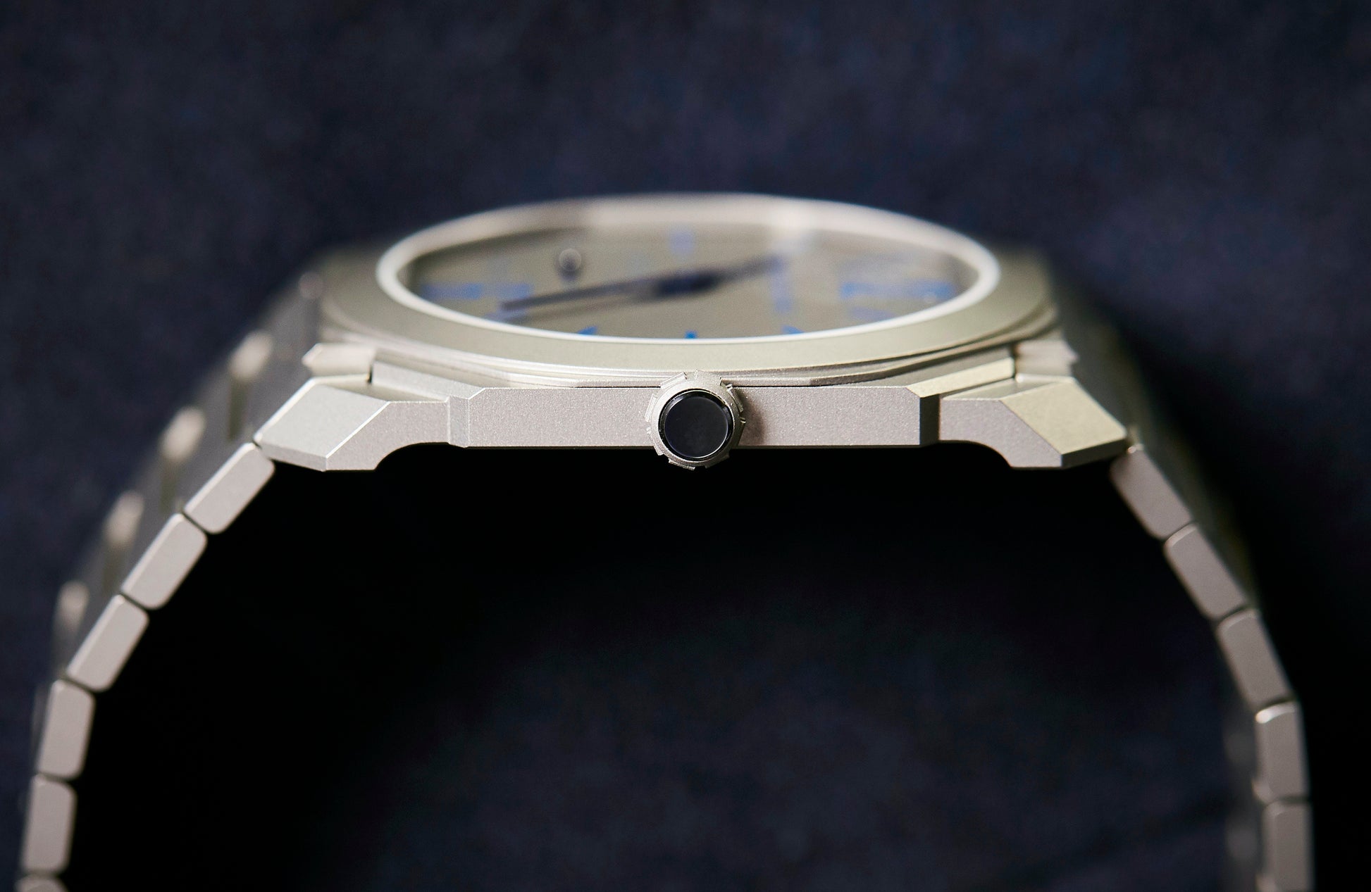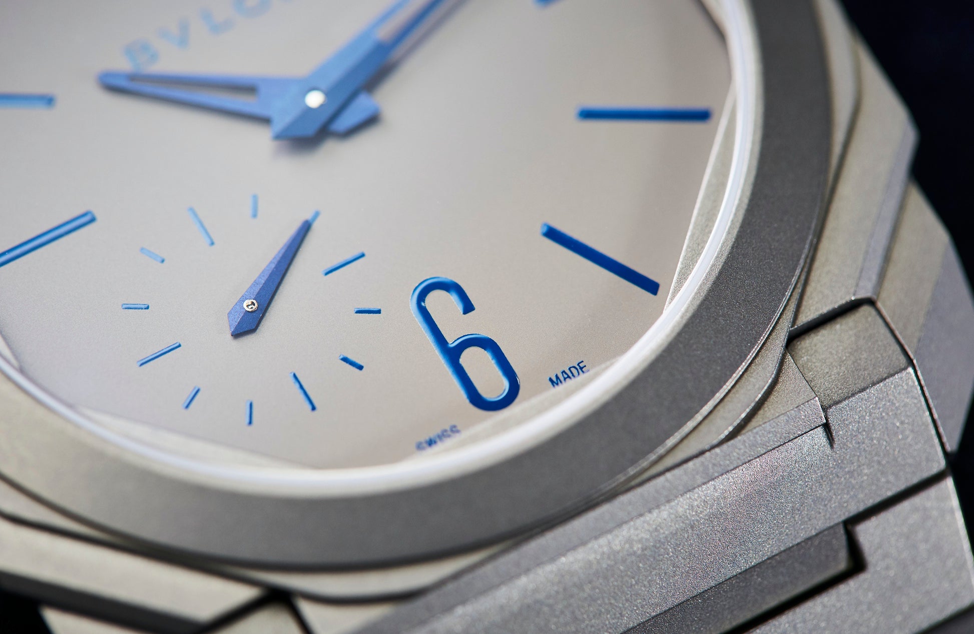 Epitome of resilience and finesse, the Octo Finissimo Automatic asserts its stature as a supremely contemporary timepiece and is enriched for this Limited Edition with the colour contrast given by its blue indexes and hands. Octo Finissimo Automatic watch with extra-thin mechanical manufacture movement (2.23mm thick), automatic winding, platinum microrotor, small seconds, BVL 138 - Finissimo caliber decorated by hand with cÇïtes de GenÇùve, chamfering and perlage finishing, 40 mm extra-thin titanium case (5.15 mm thick), transparent case back, titanium crown with ceramic insert, titanium dial, blue indexes and hands, titanium bracelet and folding clasp. Water-resistant up to 30 metres.