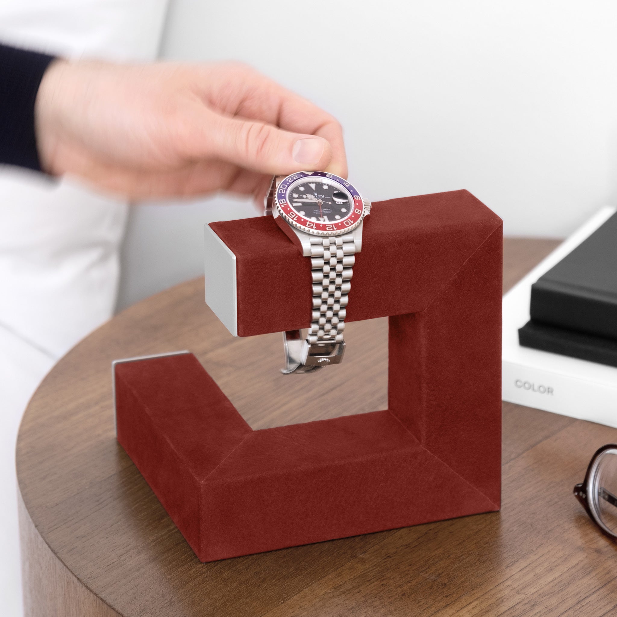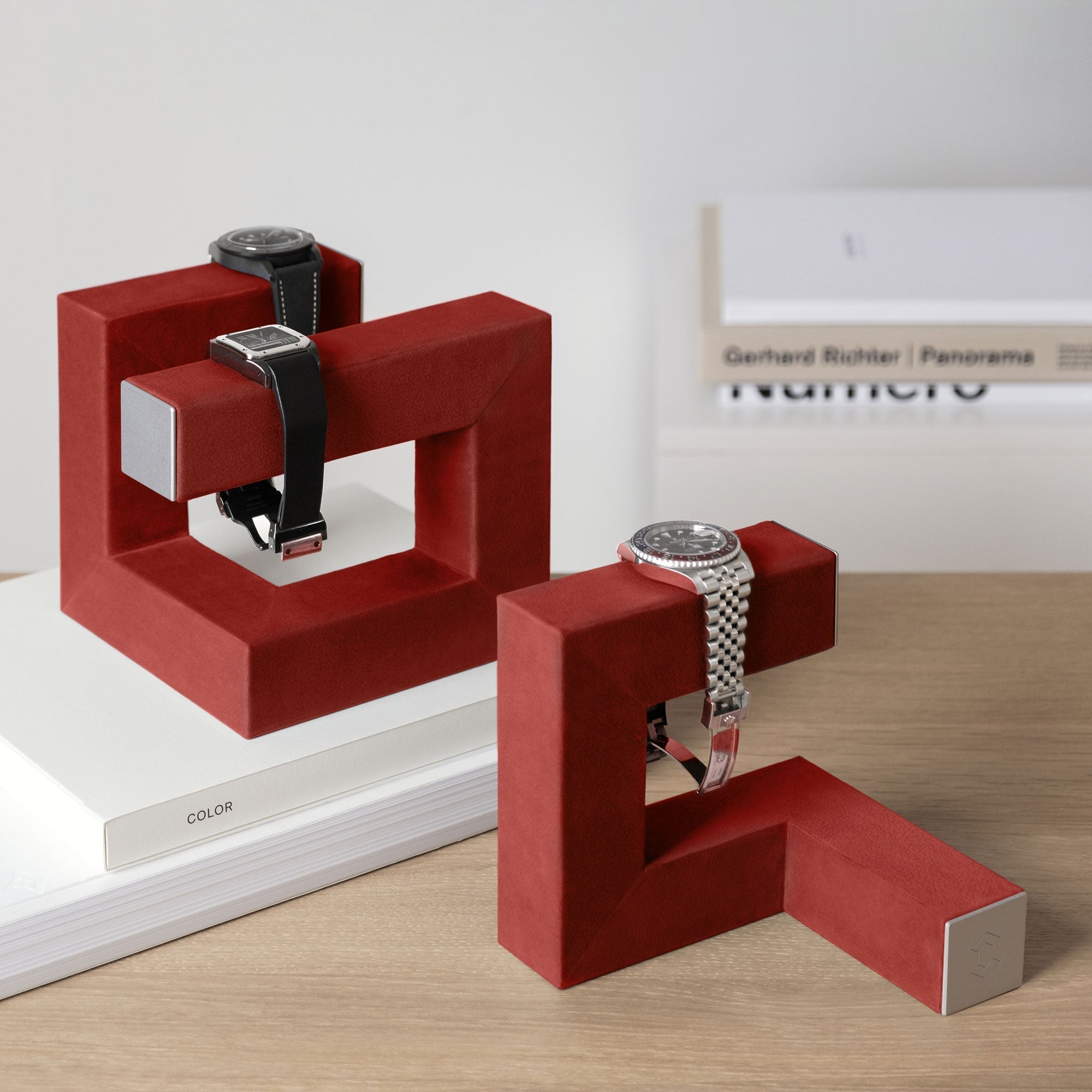 The Hudson 1 Watch stand artfully displays your favorite watch in your home. This minimalist watch display allows you to save time when putting on and taking off your timepiece every day. Padded display areas optimize comfort and protect your watch from the harm that builds up from putting it on hard surfaces over time. The Hudson 1 is made from solid aluminum that has been covered in soft crimson nubuck leather by hand.