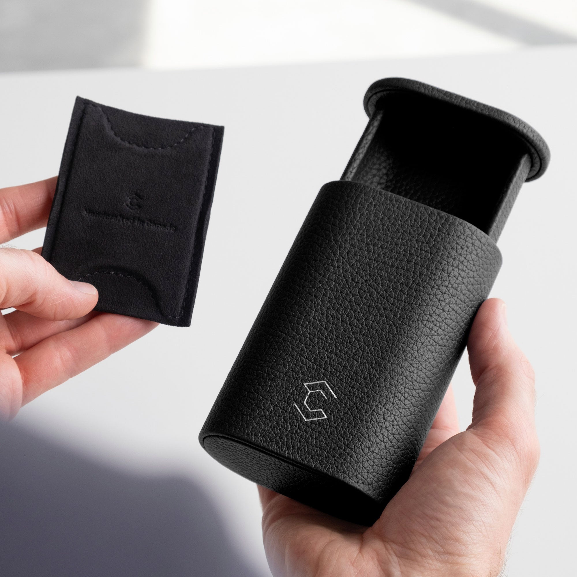 Designed for watches with a metal bracelet, the Oscar 1 in black leather is a sleek, convenient watch roll perfect for on the go. The single watch roll’s lightweight, compact format makes it easily fit into any luggage or bag. The removable card insert keeps your timepiece firmly in place within the interior of the watch roll to prevent any damage during transportation. Handmade in Canada, the Oscar 1 is crafted from refined materials including French Taurillon leather and soft Alcantara, for a timelessly elegant look and long lasting durability.