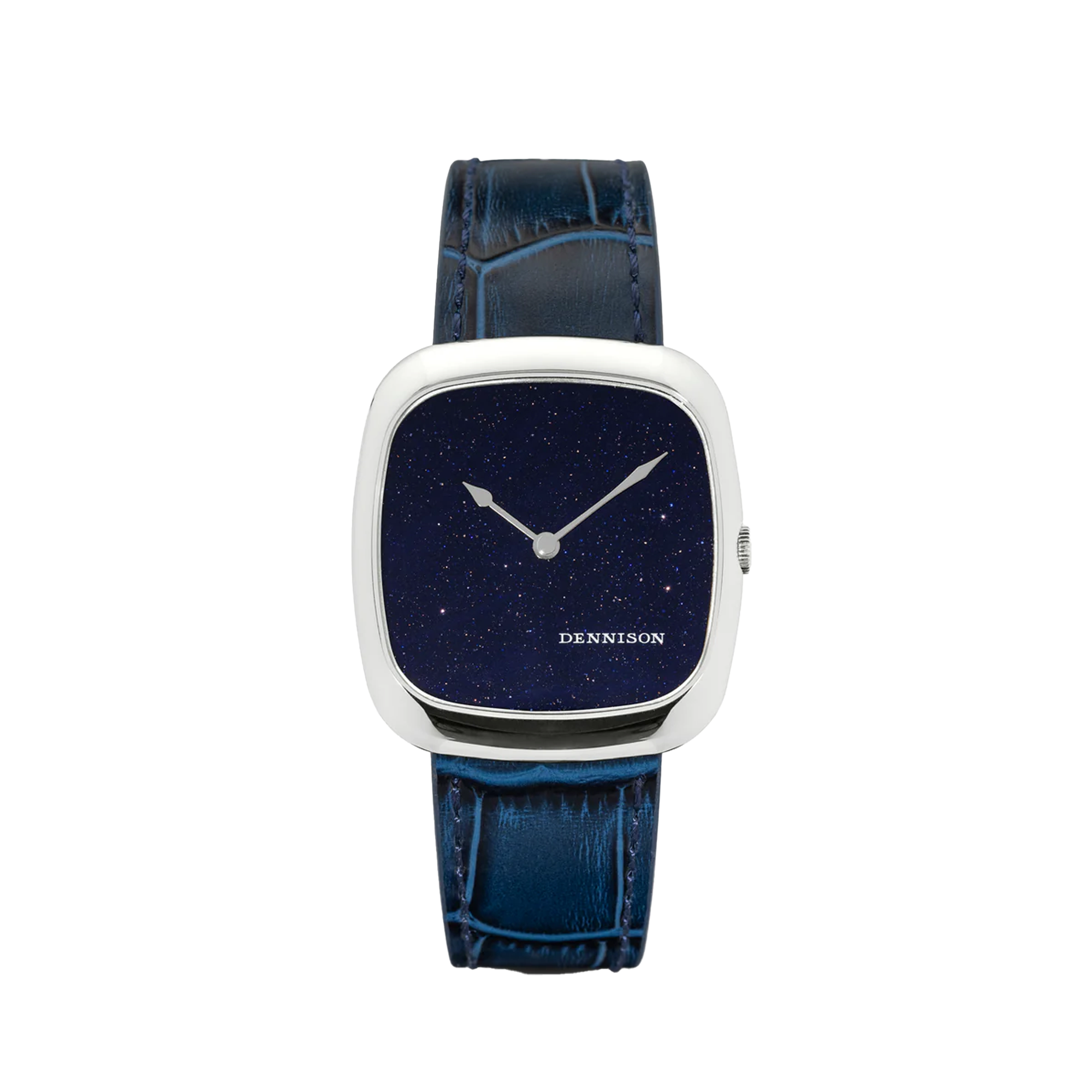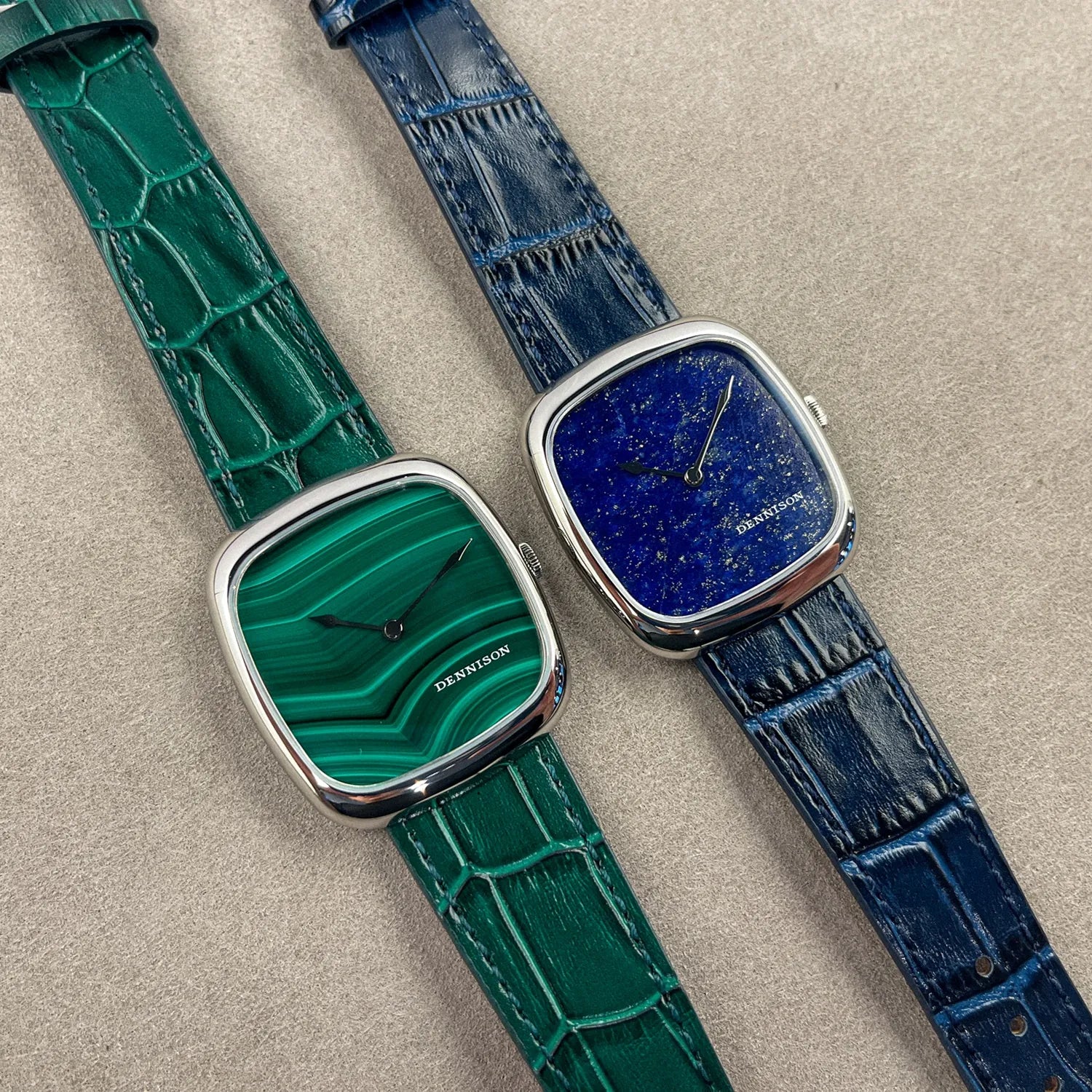 Dennison Stone Dial watches are a modern recreation of the classic Dennison cushion case, inspired by the 1960s. They feature an ultra-thin case measuring 6mm in thickness and a perfect 37mm lug-to-lug. The watches are available in a choice of Gold PVD or Stainless Steel and feature Natural Malachite, Tiger's Eye, Lapis Lazuli and Midnight Aventurine dials. They are complimented by the choice of interchangeable brown, black, blue navy leather straps and a beautifully designed pin-buckle matching the case design.