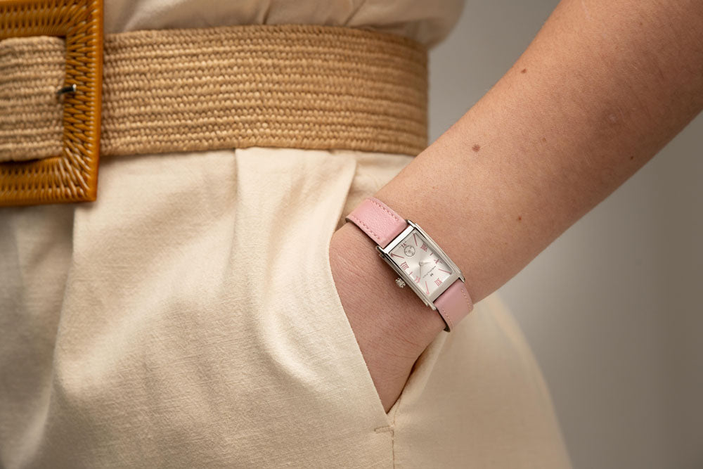 The Ardmore Quartz epitomises the adaptable Art Deco appeal with its rectangular design. This stainless steel version, which was designed to evoke the crispness of blooming flowers, has a leather strap that is subtly pink, a sunray silver dial, and beautifully designed Roman numerals.
