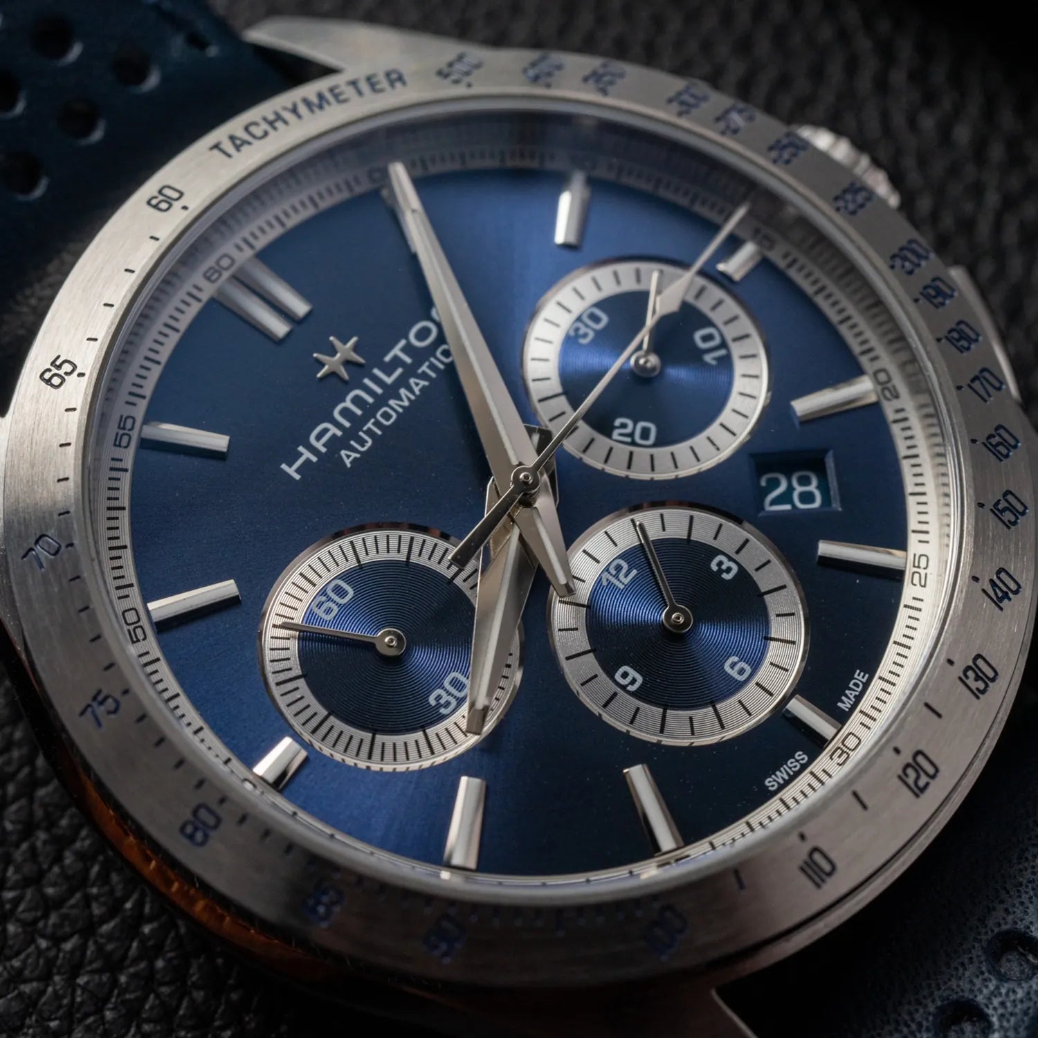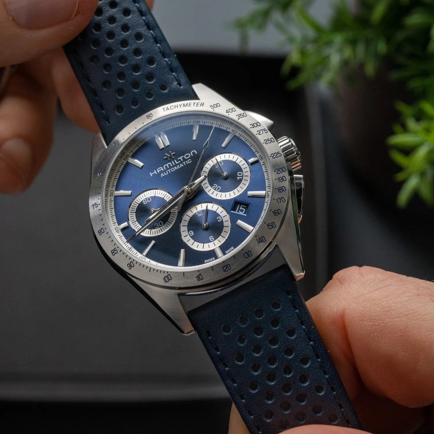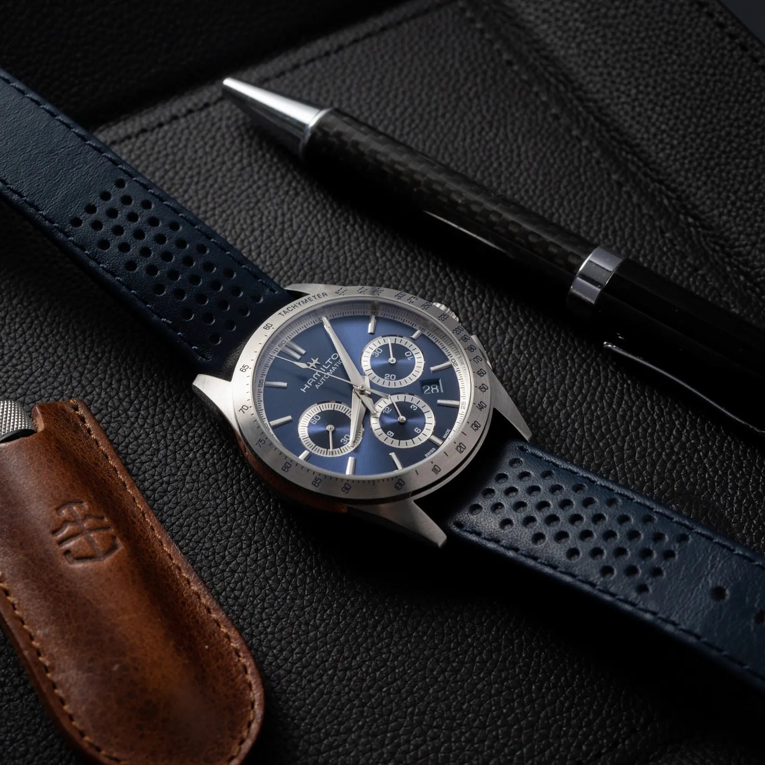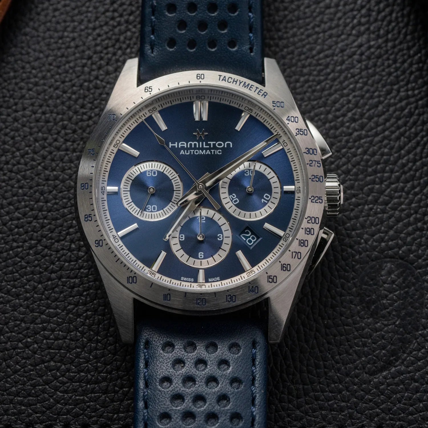 Made for those who favour function and style at once, the Jazzmaster Performer line offers a powerful sport-chic appearance. Powered by the H-31 automatic chronograph movement with 60 hours power reserve, this Jazzmaster Performer Automatic Chronograph features a 42mm stainless steel case accented by a sleek blue dial and a matching racing-style perforated blue leather strap.