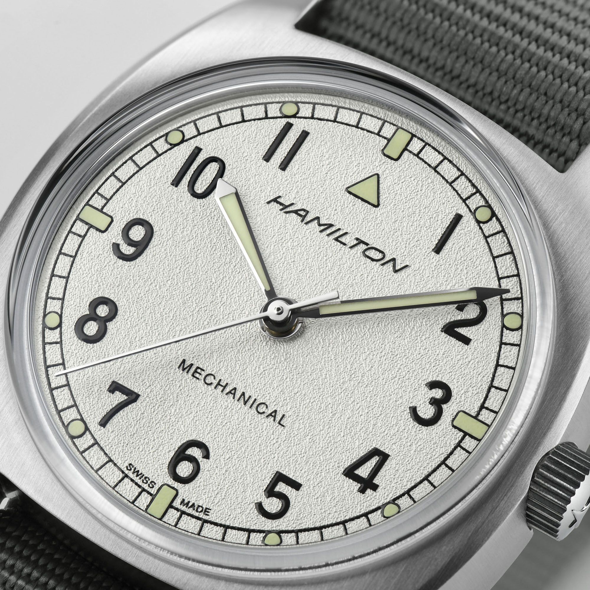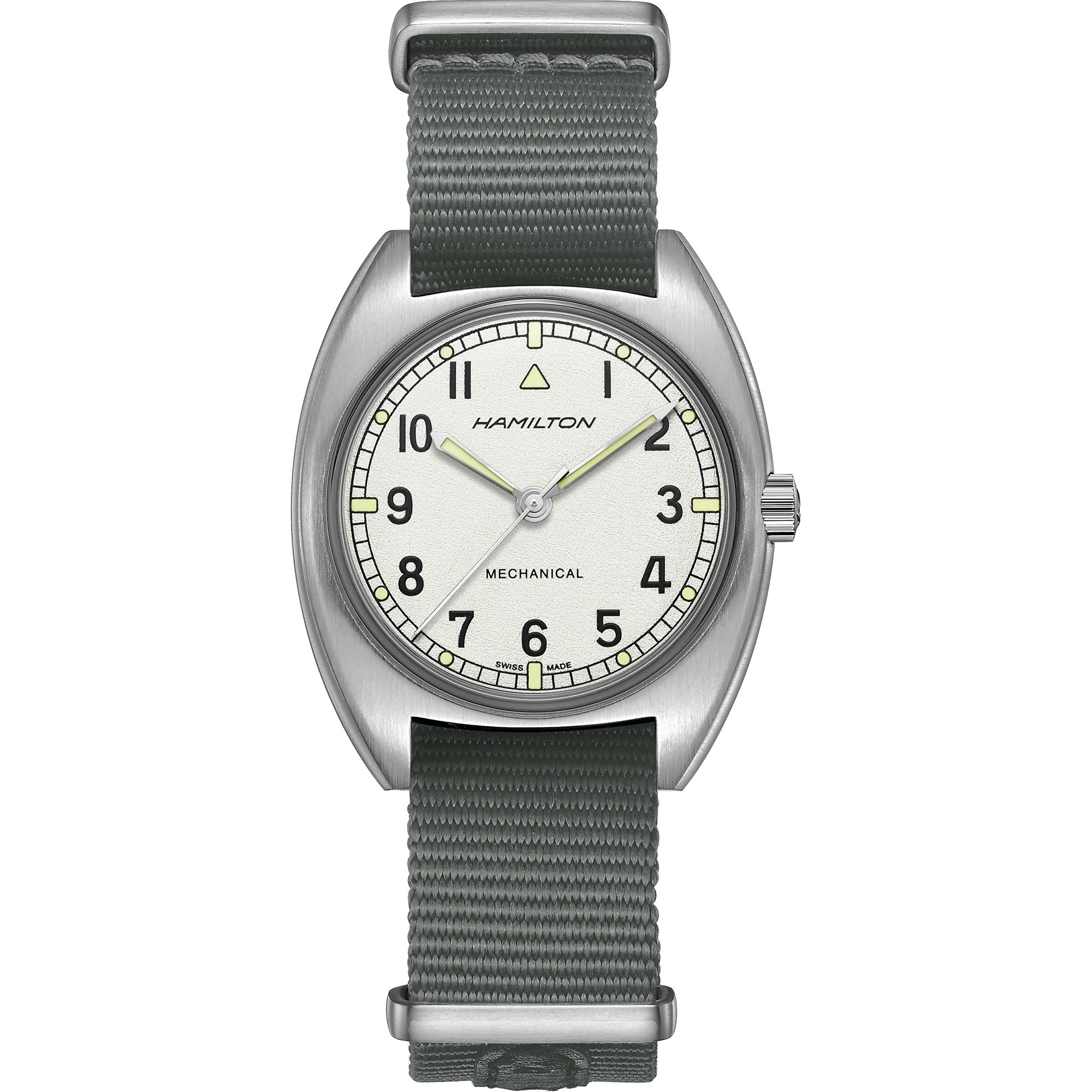 Powered by the awesome H-50 handwinding movement with 80 hours of power reserve, the Khaki Pilot Pioneer is a reinterpretation of a vintage military watch produced for the British Royal Air Force in 1973. Featuring a distinctive dial pattern and robust NATO strap, this is a military watch with real character.