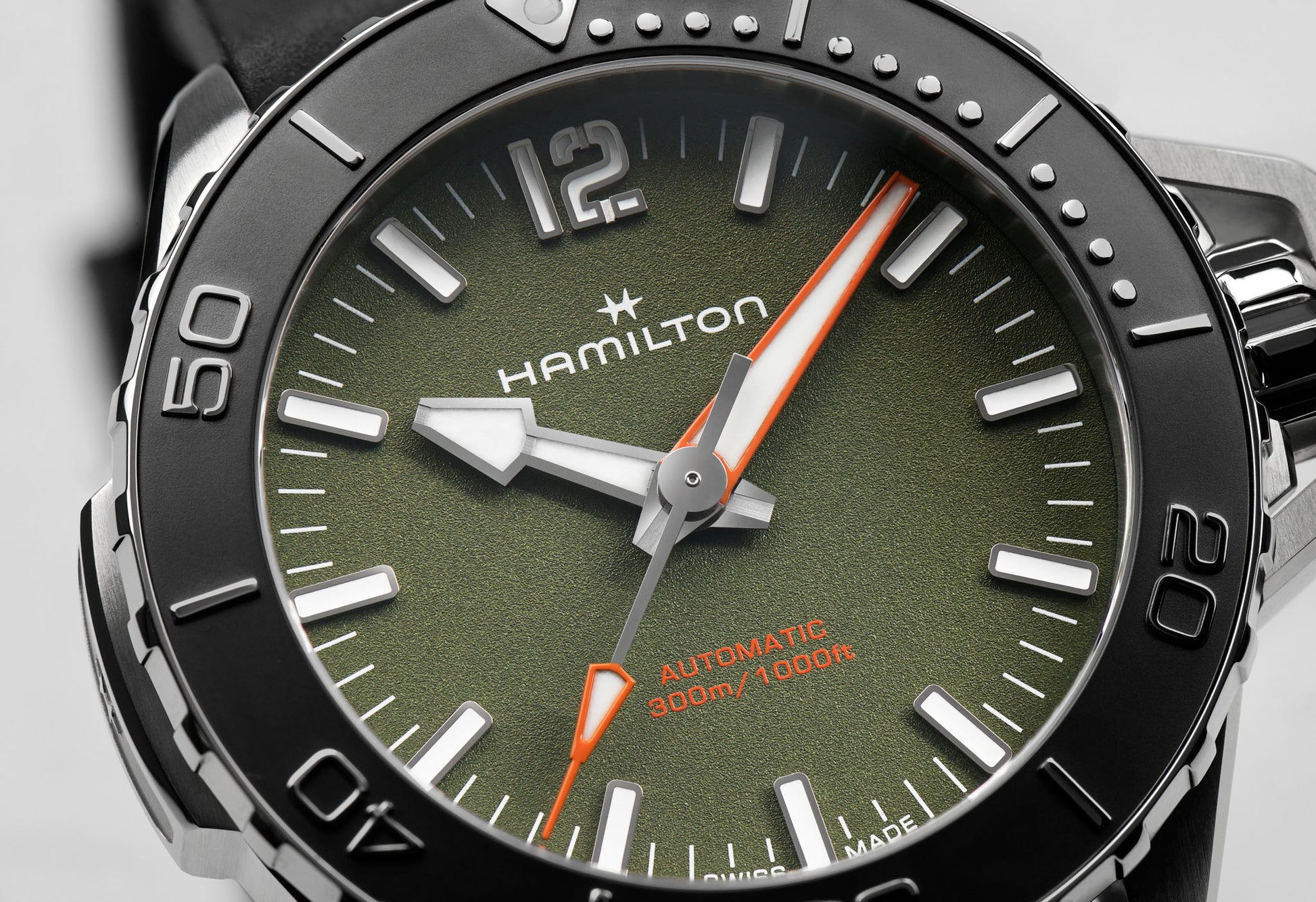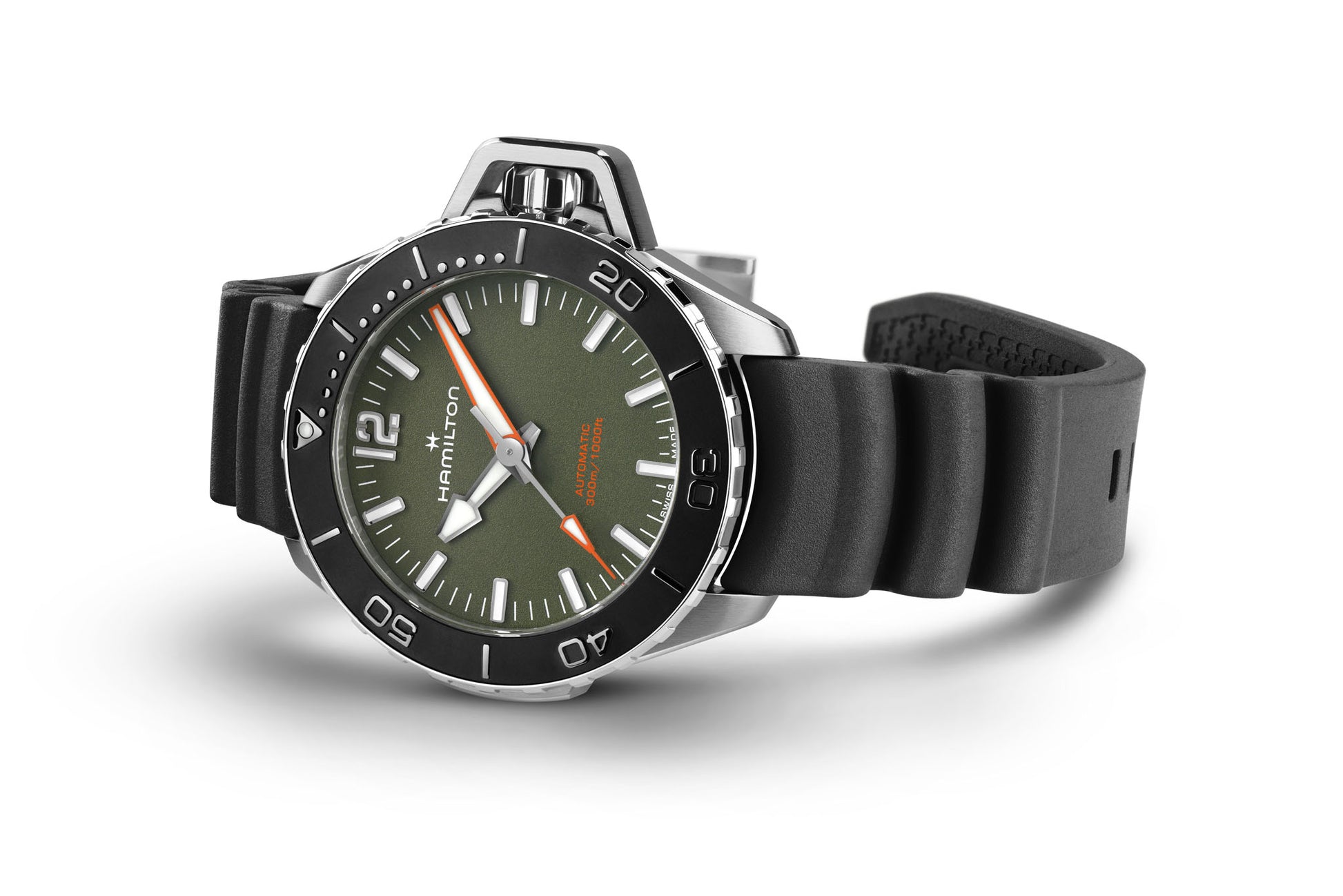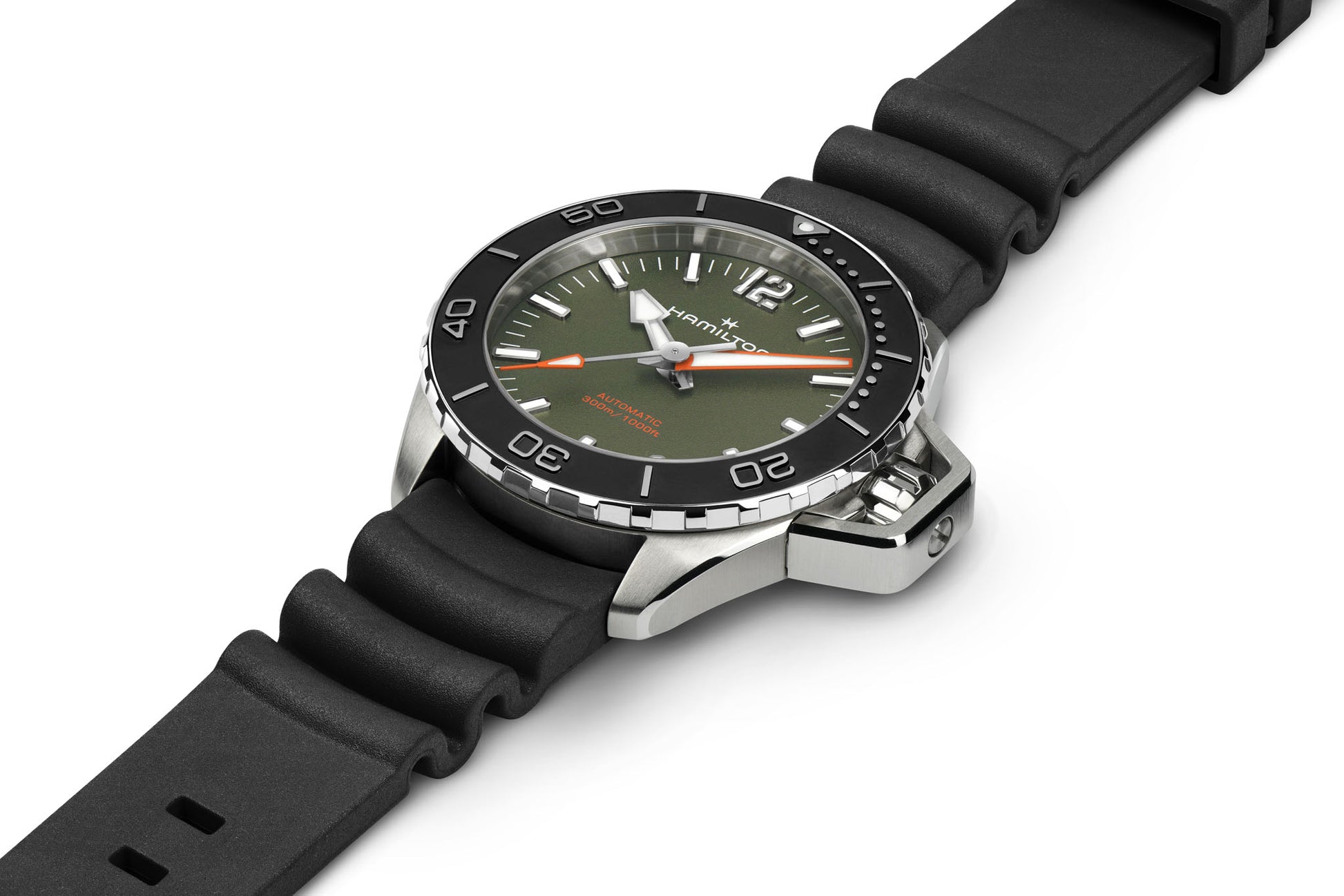 The Khaki Navy Frogman Automatic stands out for its technical performance and distinctive look. Its 41mm stainless steel case features a screw-down crown protected by a robust bridge-shaped crown guard to ensure its 30 bar (300m) water-resistance, a nod to the original Frogman’s design. Boasting a black dial with touches of Super-LumiNova® to ensure precise readings under any circumstances, this 41mm Khaki Navy Frogman Automatic is fitted with a black waved rubber strap evoking the moving sea surface. Functional and wearable at once, this timepiece is a hero underwater and on land.