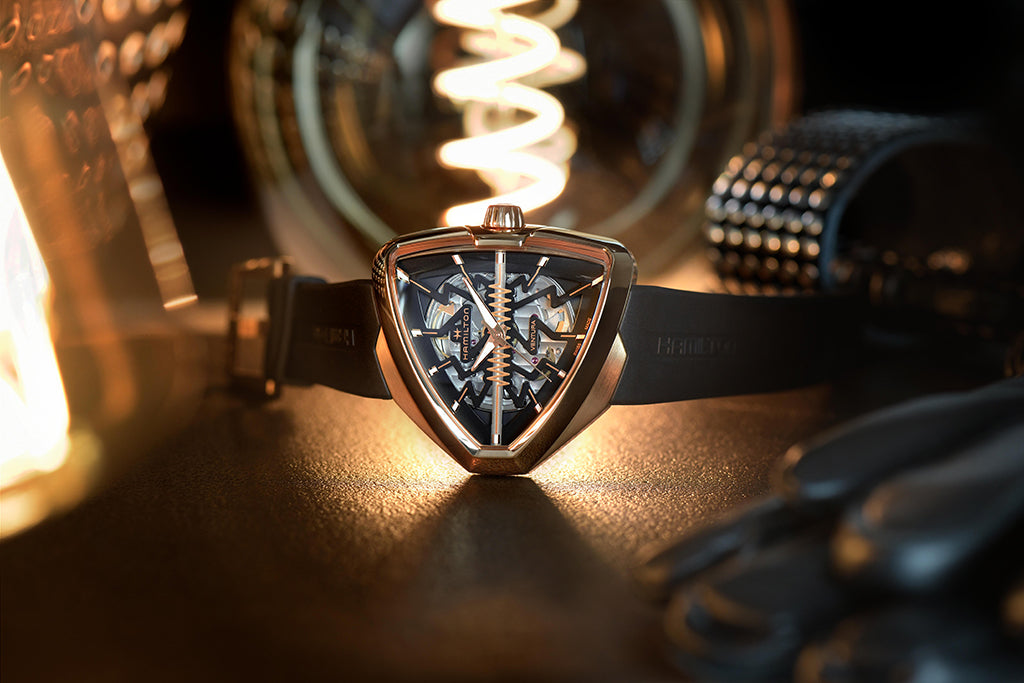 Dare to be bold with the Ventura Elvis80 Skeleton. A powerful evolution of a revolutionary timepiece, its precise skeletonized dial features a striking zigzag at the centre to match its luminous gold PVD-coated, triangular case. This bolt of energy celebrates an iconic symbol of innovation and draws the eye to the automatic H-10-S movement underneath.