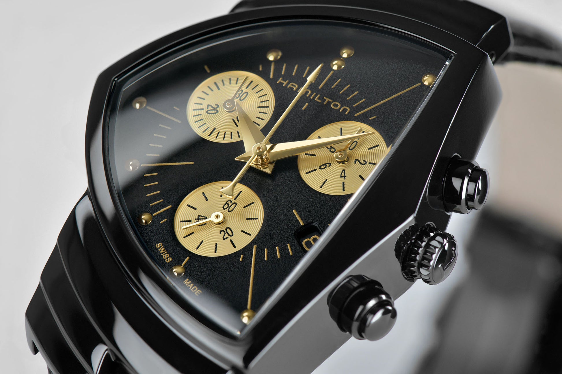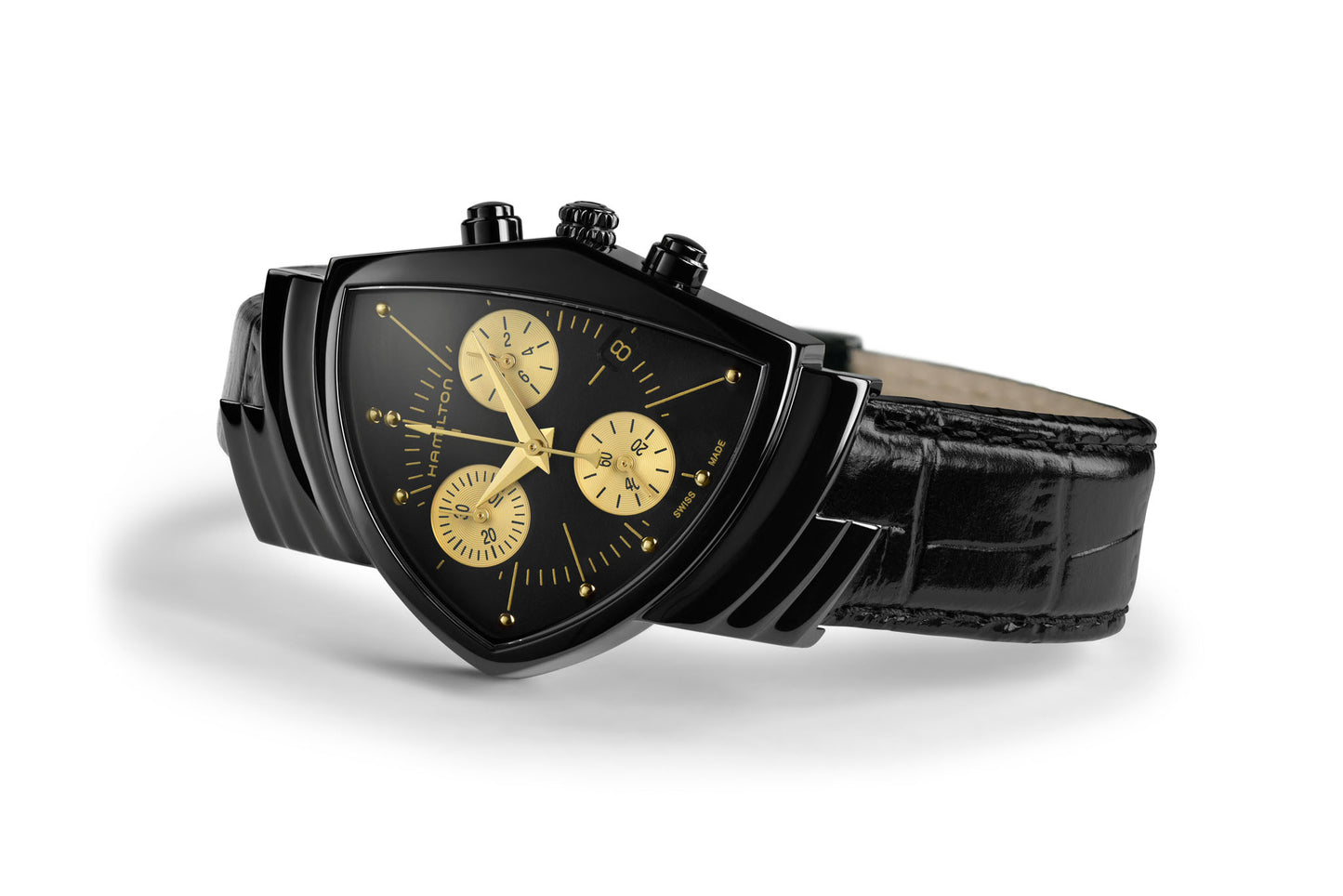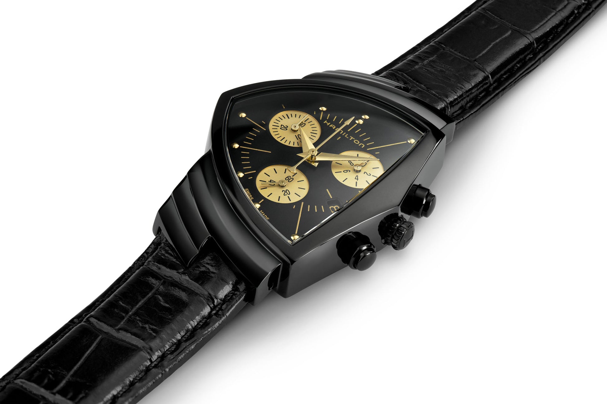 Shine bright with the two-tone design. Embodying the mystery and glamour of Hollywood, Hamilton's black and gold capsule is comprised of five celebrated timepieces: 36mm Jazzmaster Auto, 42mm Jazzmaster Auto Chrono, Pan Europ, Ventura Chrono Quartz and Ventura S. Playing on the contrasts of the glitz and grit, the capsule is a perfect definition of the big screen.