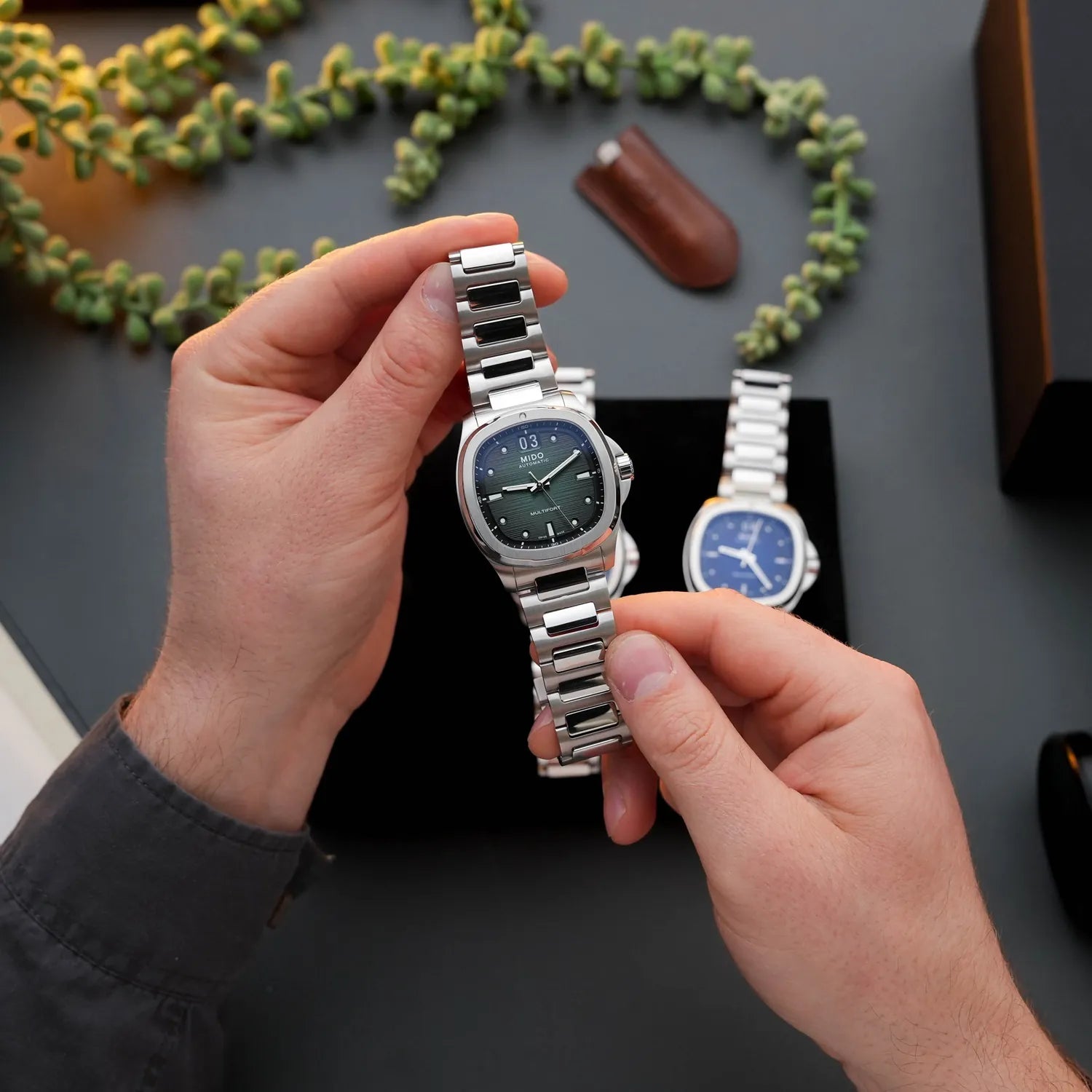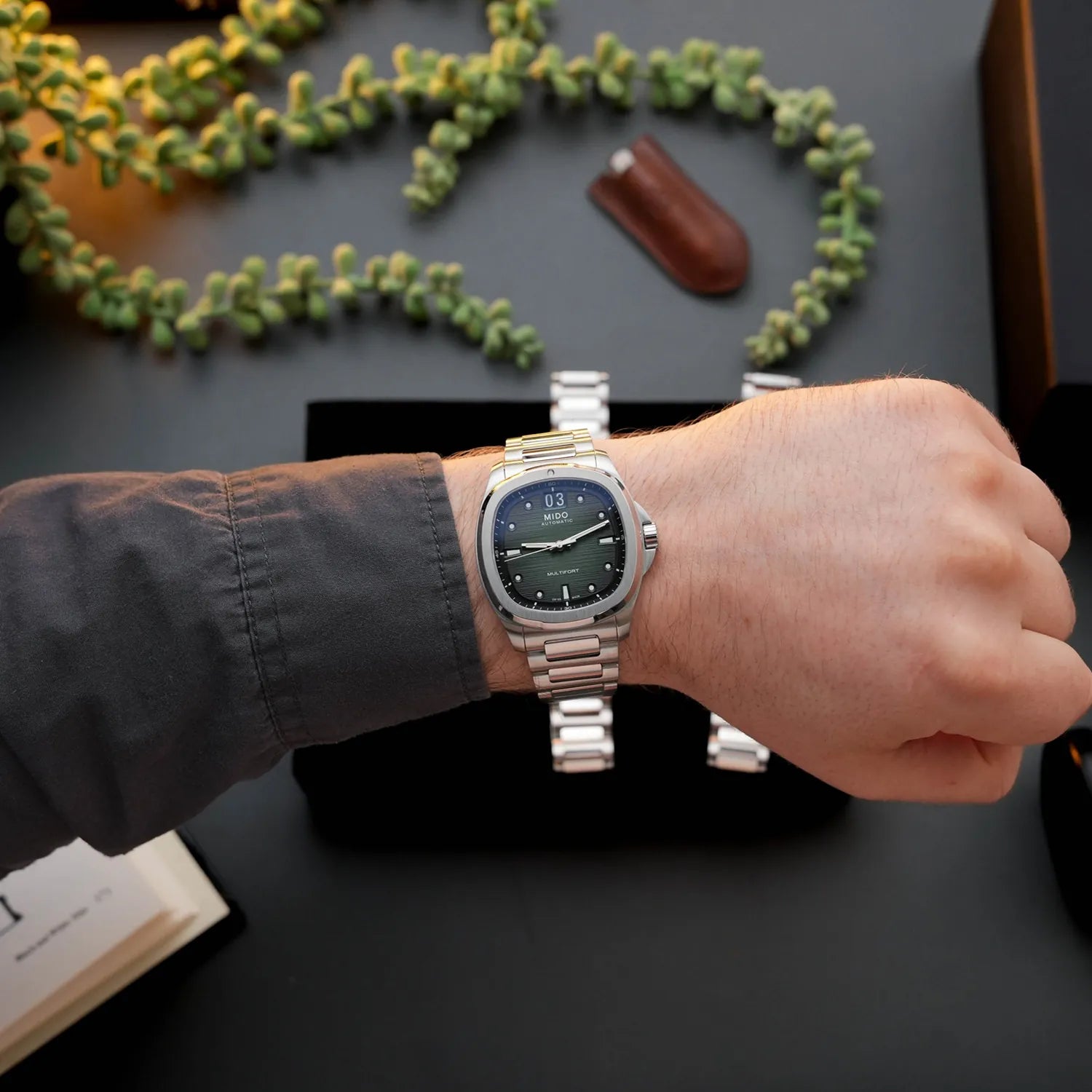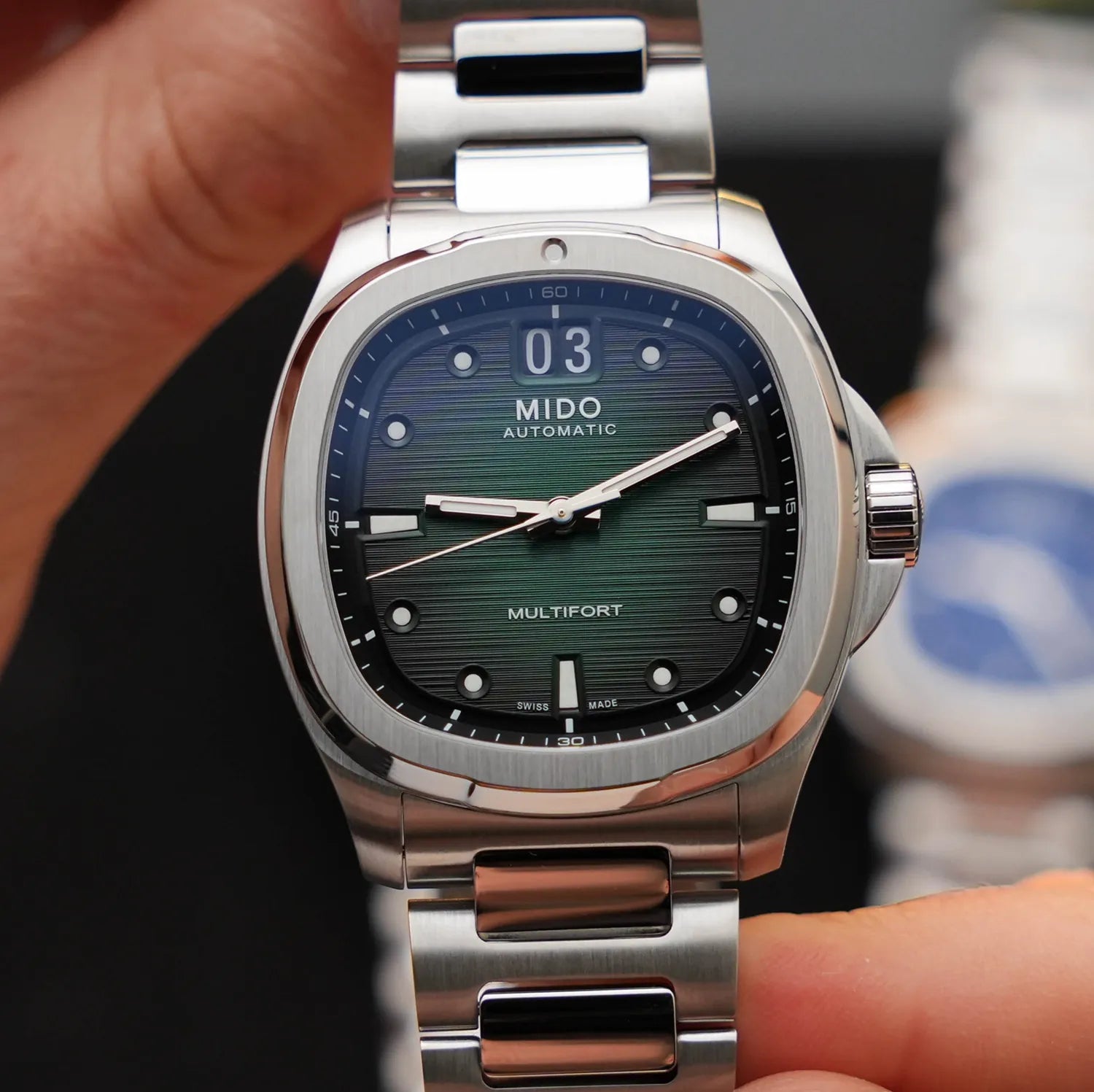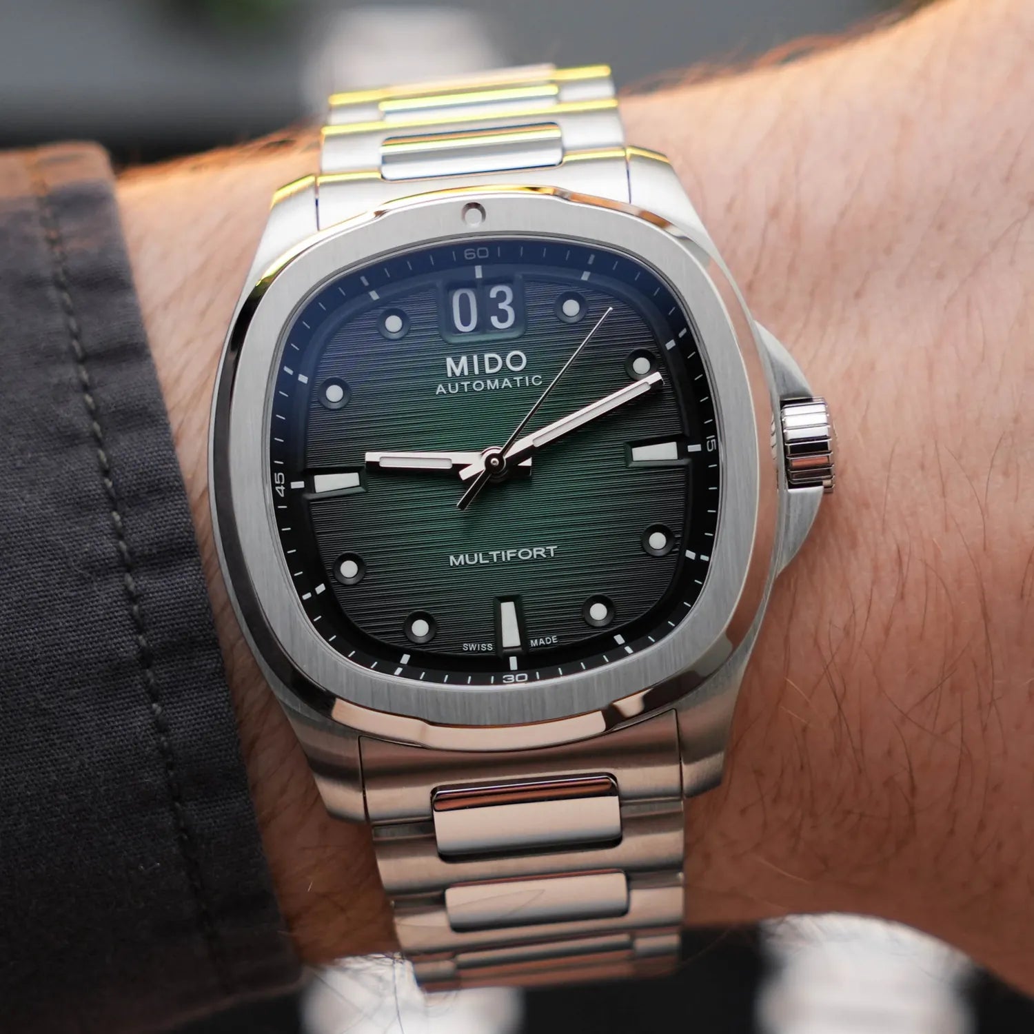 In a revival of a cult classic shape, created 50 years ago by Mido, the TV-shaped case makes a long-awaited comeback, this time honouring the Multifort collection. Its dynamic and modern design is emphasized by a stunning light-reflecting dial - which reveals a captivating dégradé effect that fades from green to black - featuring a pronounced horizontal brushed finish, along with its distinctive function: the BIG DATE at 12 o'clock. Behind its TV screen, the ever-reliable Calibre 80 marks the time with precision.