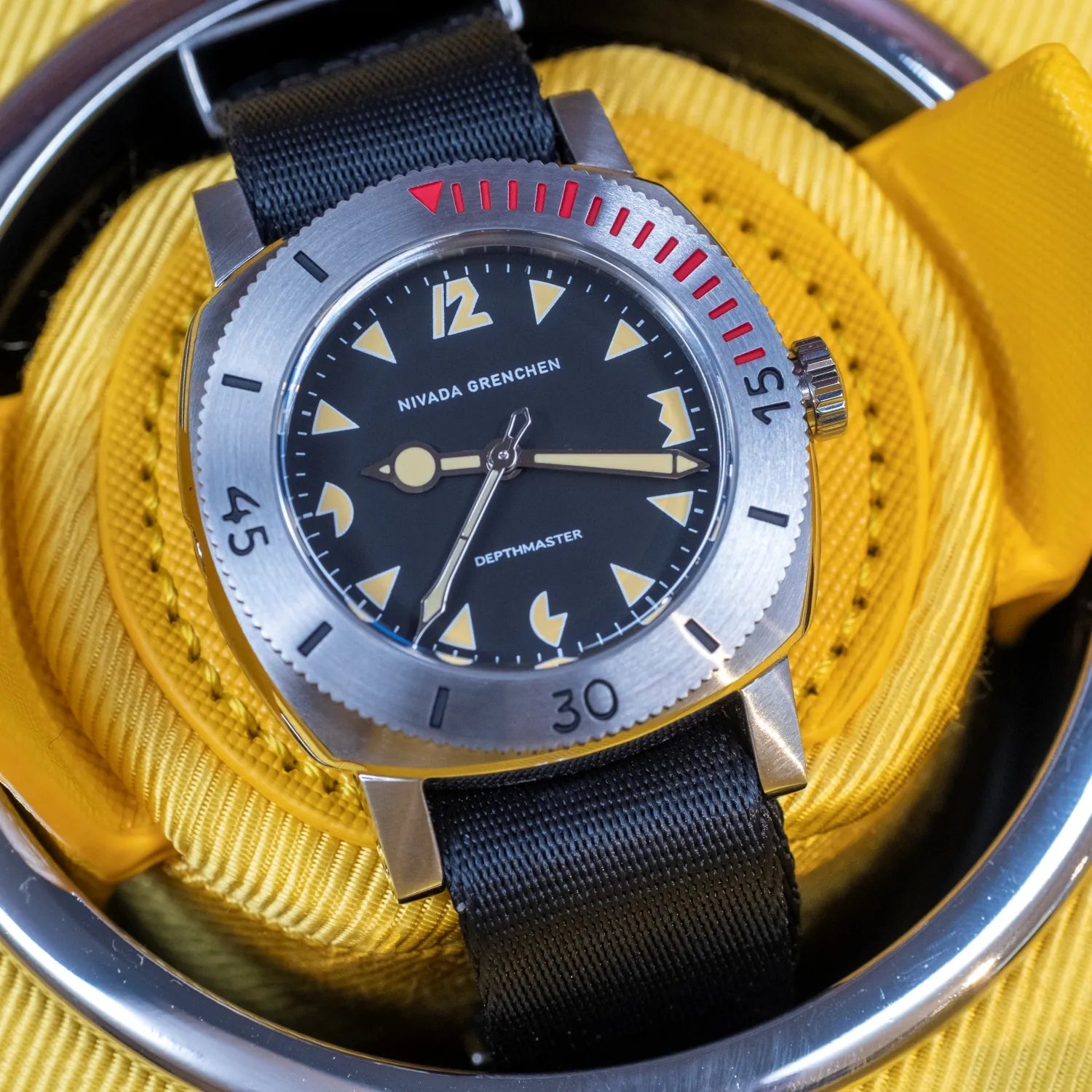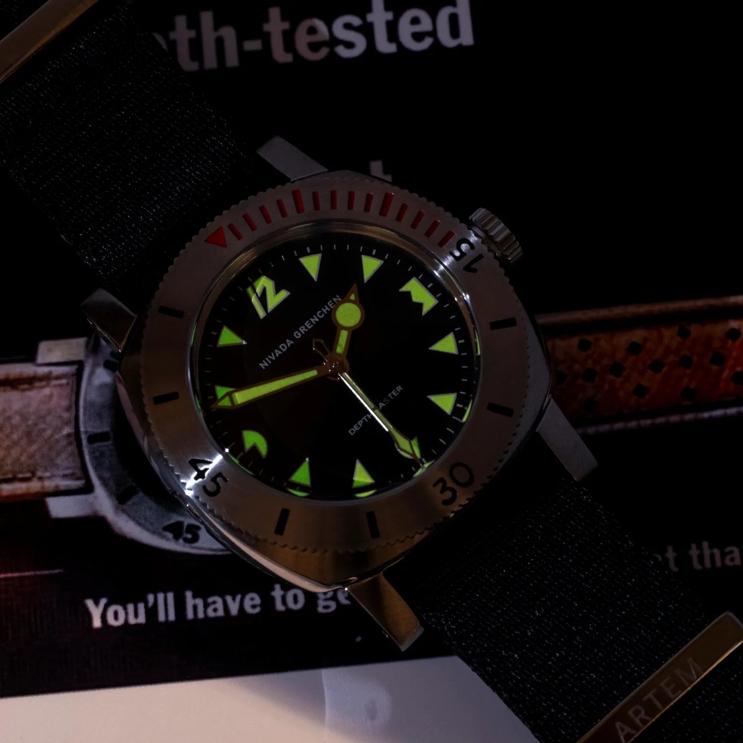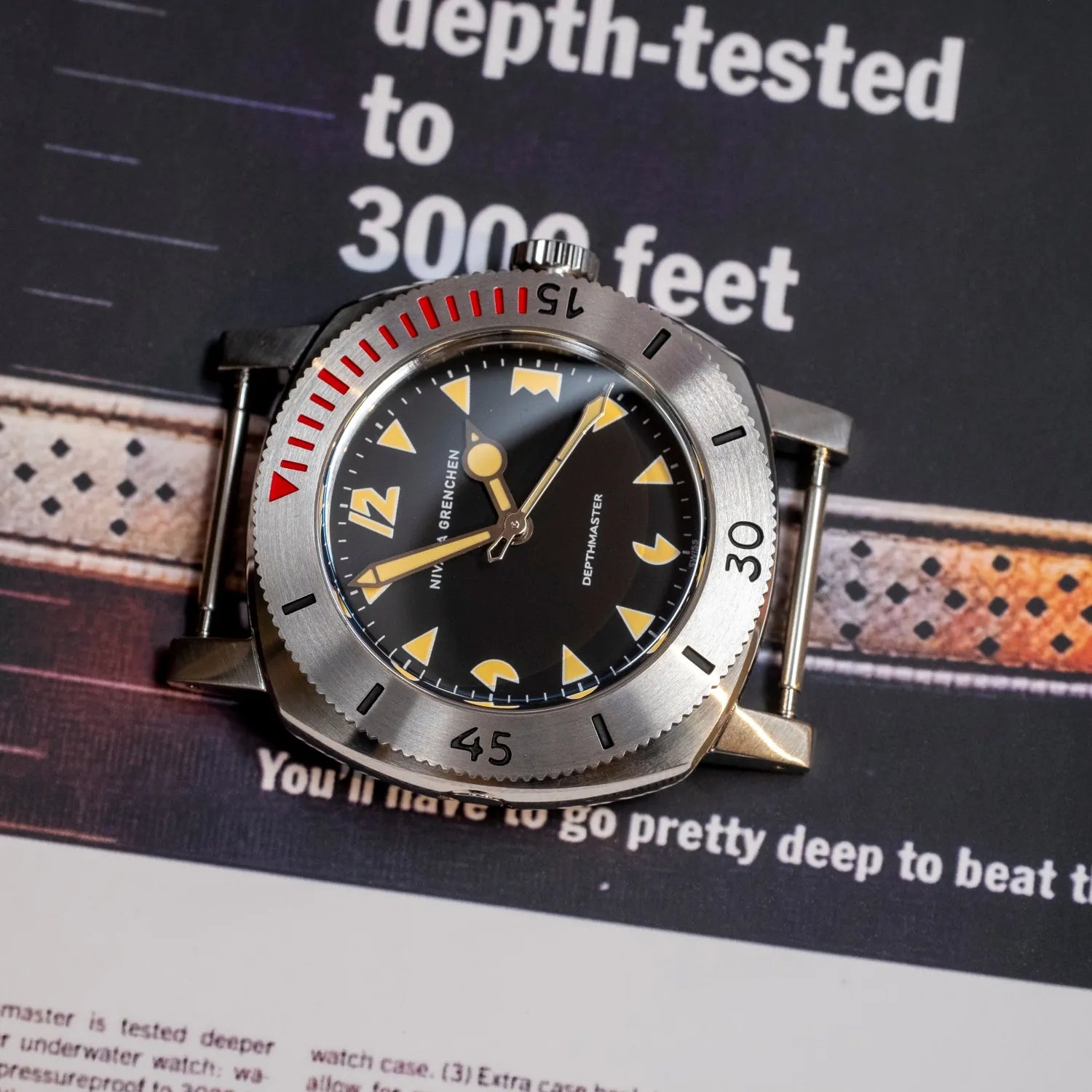 The Depthmaster is based on the 1964 classic from Nivada Grenchen called the "Depthomatic". The Depthomatic was one of the first true dive watches, as it was the first on the market that featured a depth gauge. One year later the Depthmaster came into productions as we know it today. The Depthmaster features a comfortable 38mm cushion style case, unique indices that somewhat resemble an iconic video game character and an astronomical 1000m water resistance.
