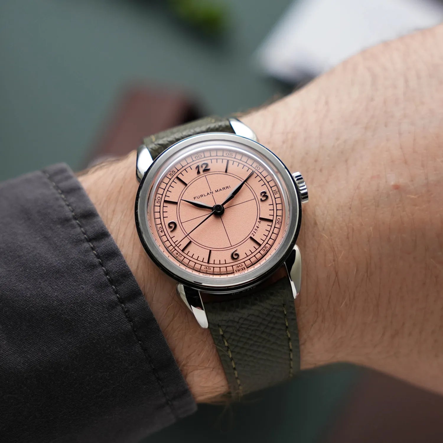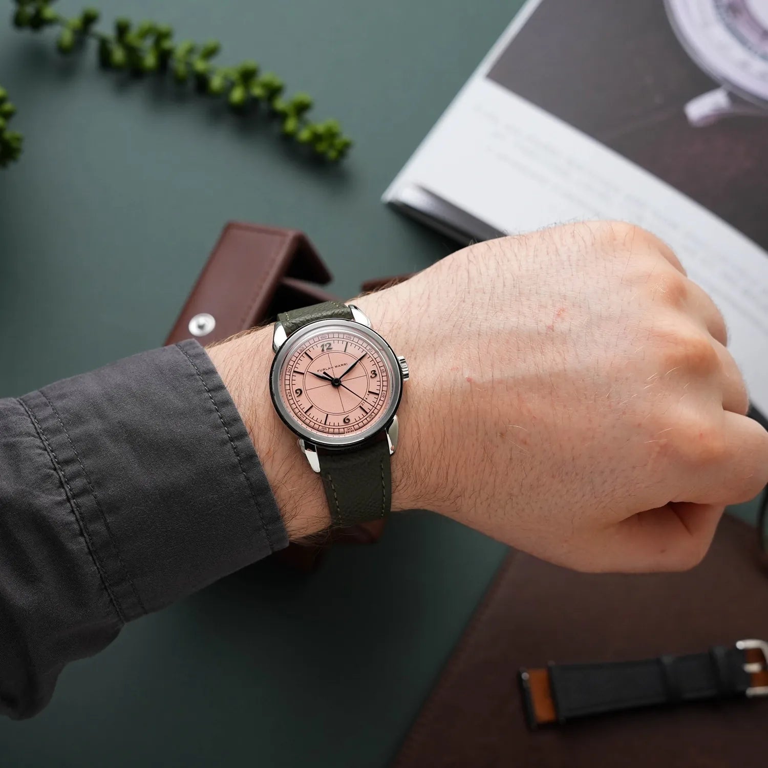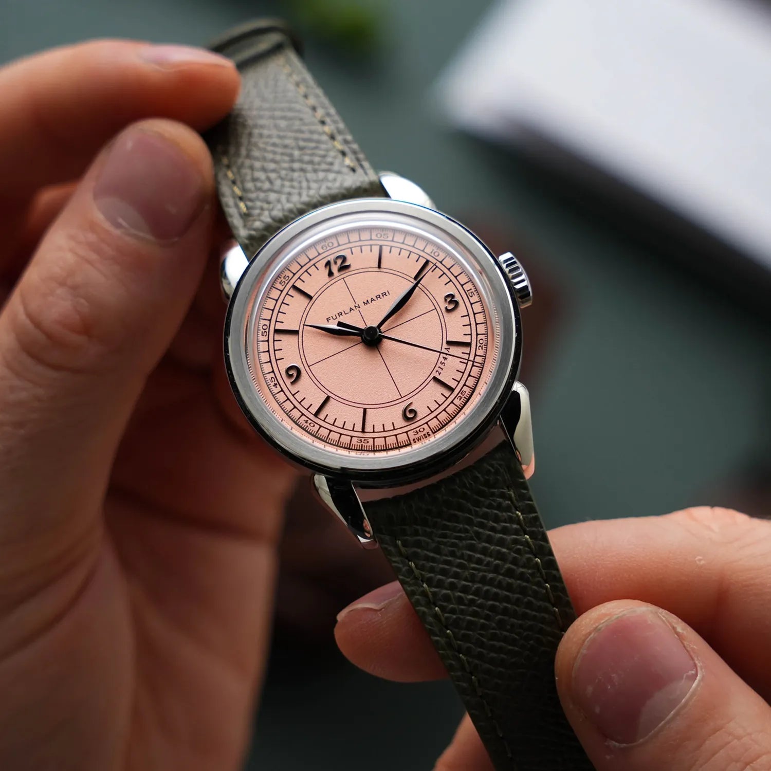 A three hands time only wristwatch with cow horns lugs, powered by a Swiss-made automatic movement from La Joux-Perret with an elaborated finish, tungsten rotor with palladium coating and hacking seconds function. The case is finished with a care for details, like the "perlage" decoration inside the caseback, the curved hands and the applied "Breguet" indexes. The watch comes with two straps included in the packaging, one curved and one straight. Two holes have been made in the lugs, to let you choose between the two straps options.