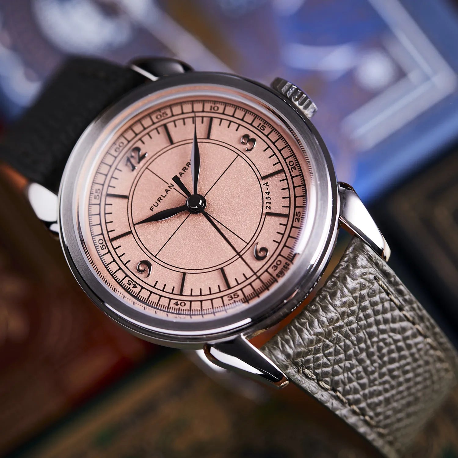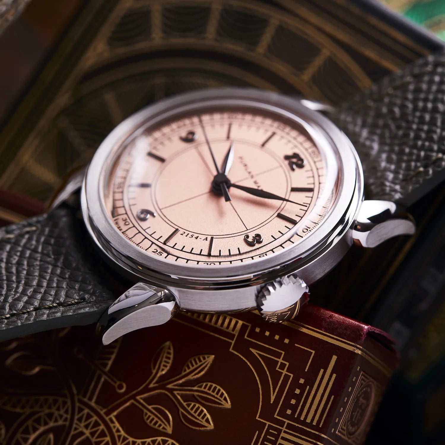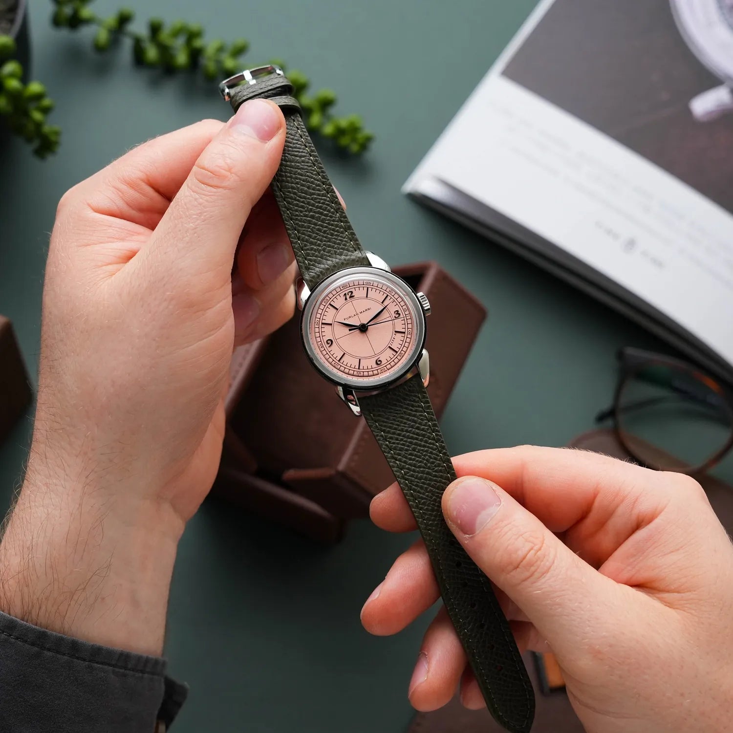 A three hands time only wristwatch with cow horns lugs, powered by a Swiss-made automatic movement from La Joux-Perret with an elaborated finish, tungsten rotor with palladium coating and hacking seconds function. The case is finished with a care for details, like the "perlage" decoration inside the caseback, the curved hands and the applied "Breguet" indexes. The watch comes with two straps included in the packaging, one curved and one straight. Two holes have been made in the lugs, to let you choose between the two straps options.