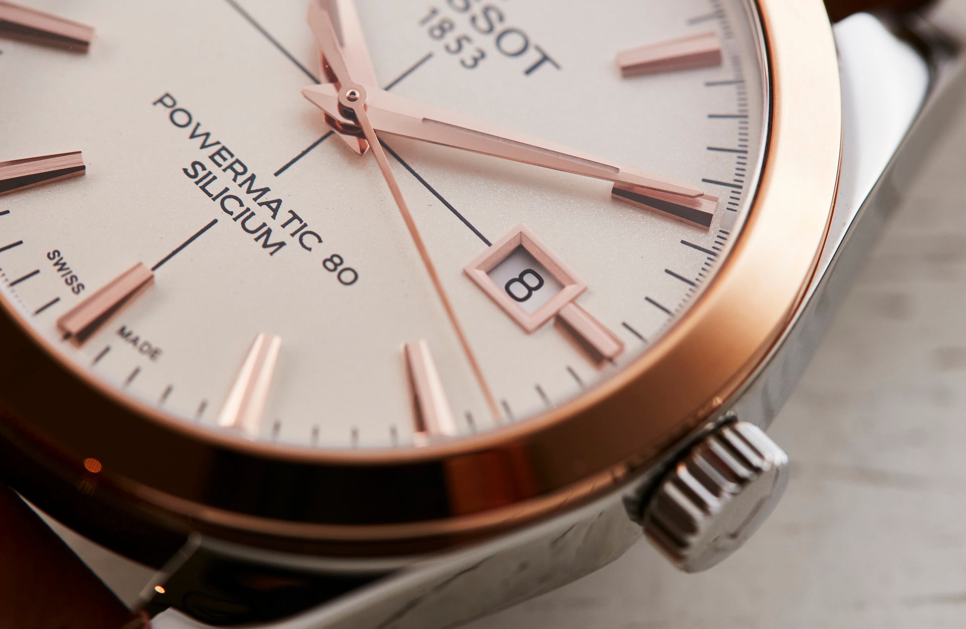 The "Powermatic 80 Silicium" indication is a reminder that the Gentleman has an exceptional calibre. Tissot uses the ETA C07.811, better known under the name of Powermatic 80, in the version with a silicon balance-spring. This spring provides greater longevity, more precise running and greater resistance to magnetic fields. The self-winding movement has a very convenient power reserve of 80 hours, hence its name.