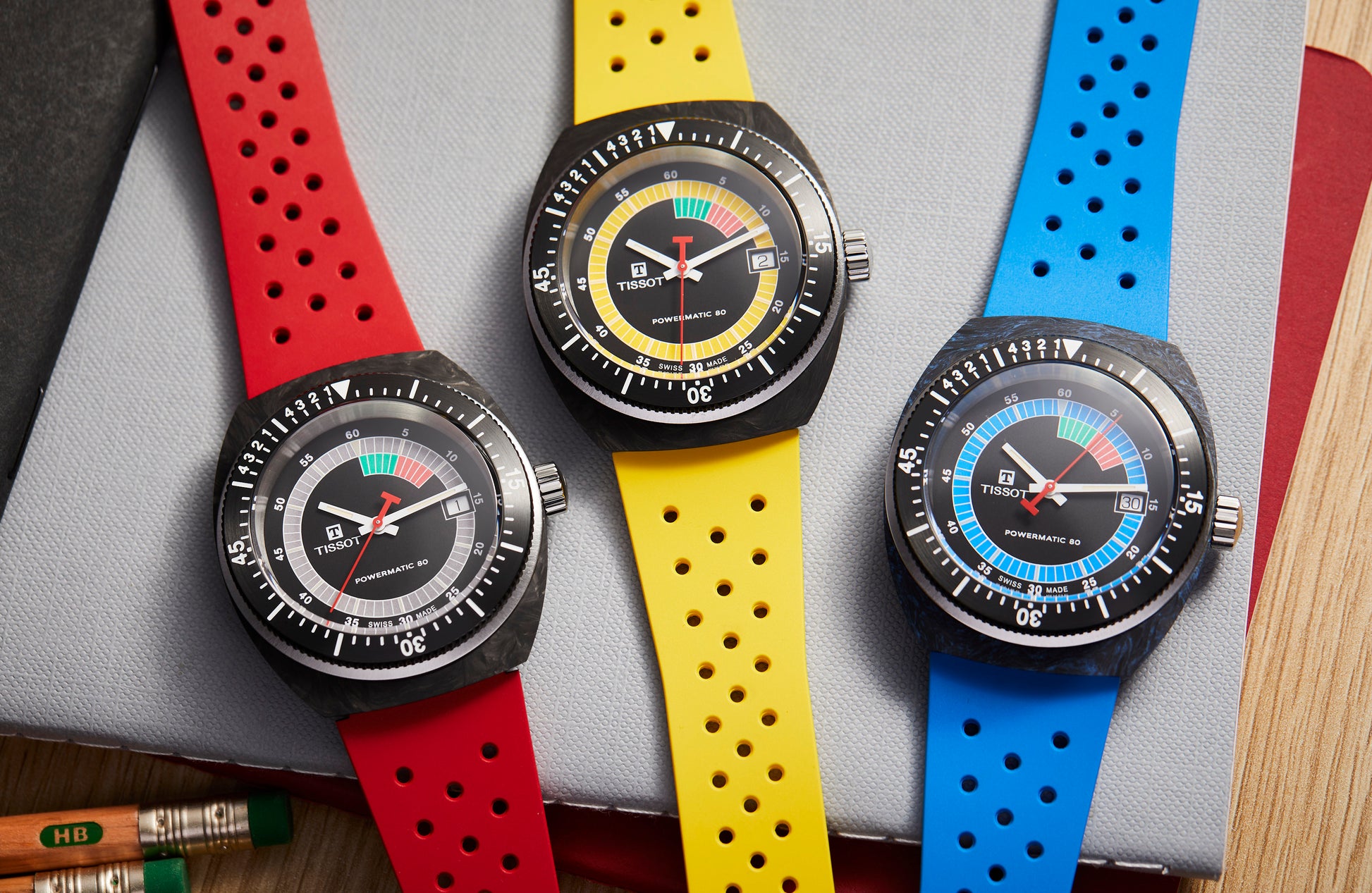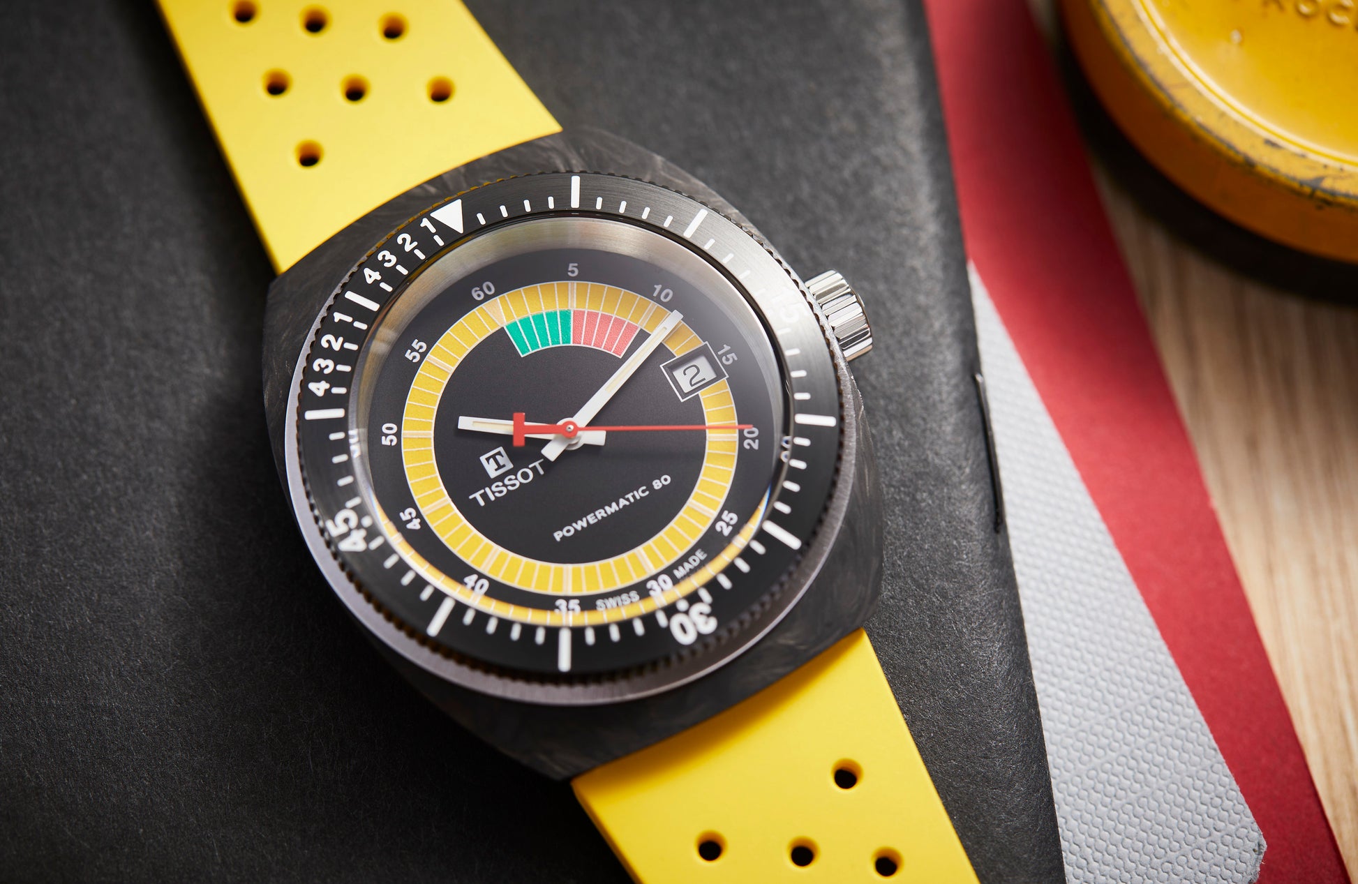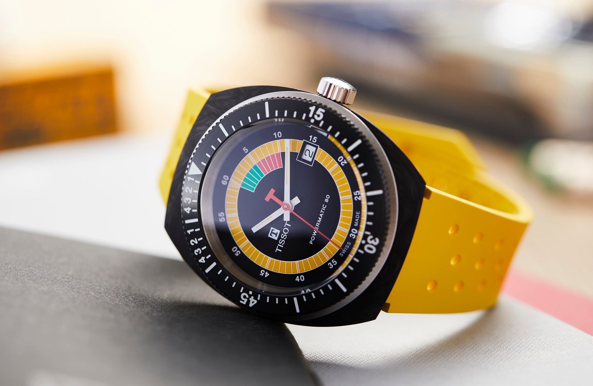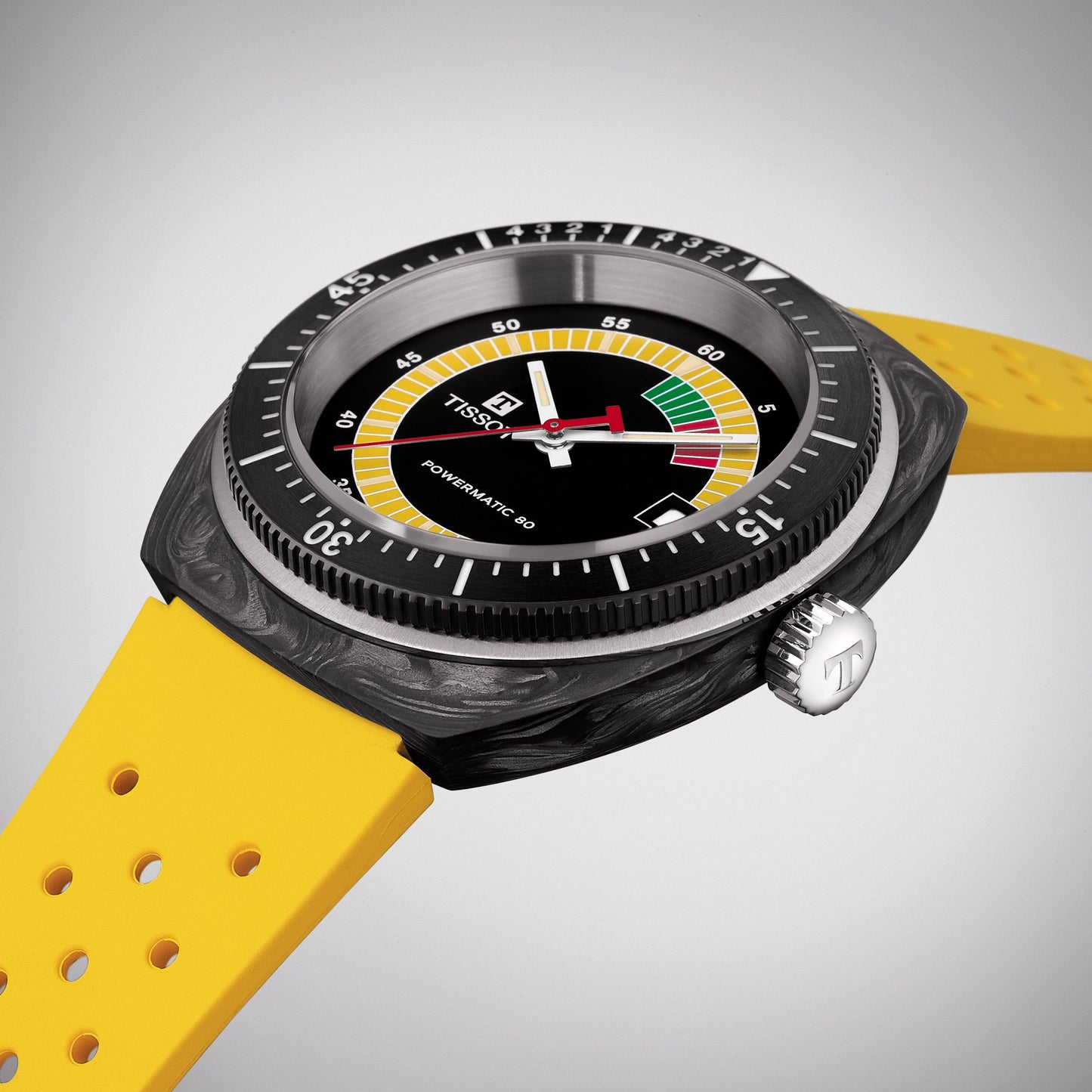 The Sideral from Tissot is a statement piece brimming with personality. It's forged carbon case and black PVD unidirectional bezel with diver and regatta graduation is paired with a vibrant perforated rubber strap. Its 70s aesthetic is captured by its multi-coloured luminescent animation on the dial and vibrant strap to match. Powered by the Powermatic 80 Nivachron movement and a new Tissot skeletonised rotor for up to 80 hours of power reserve.